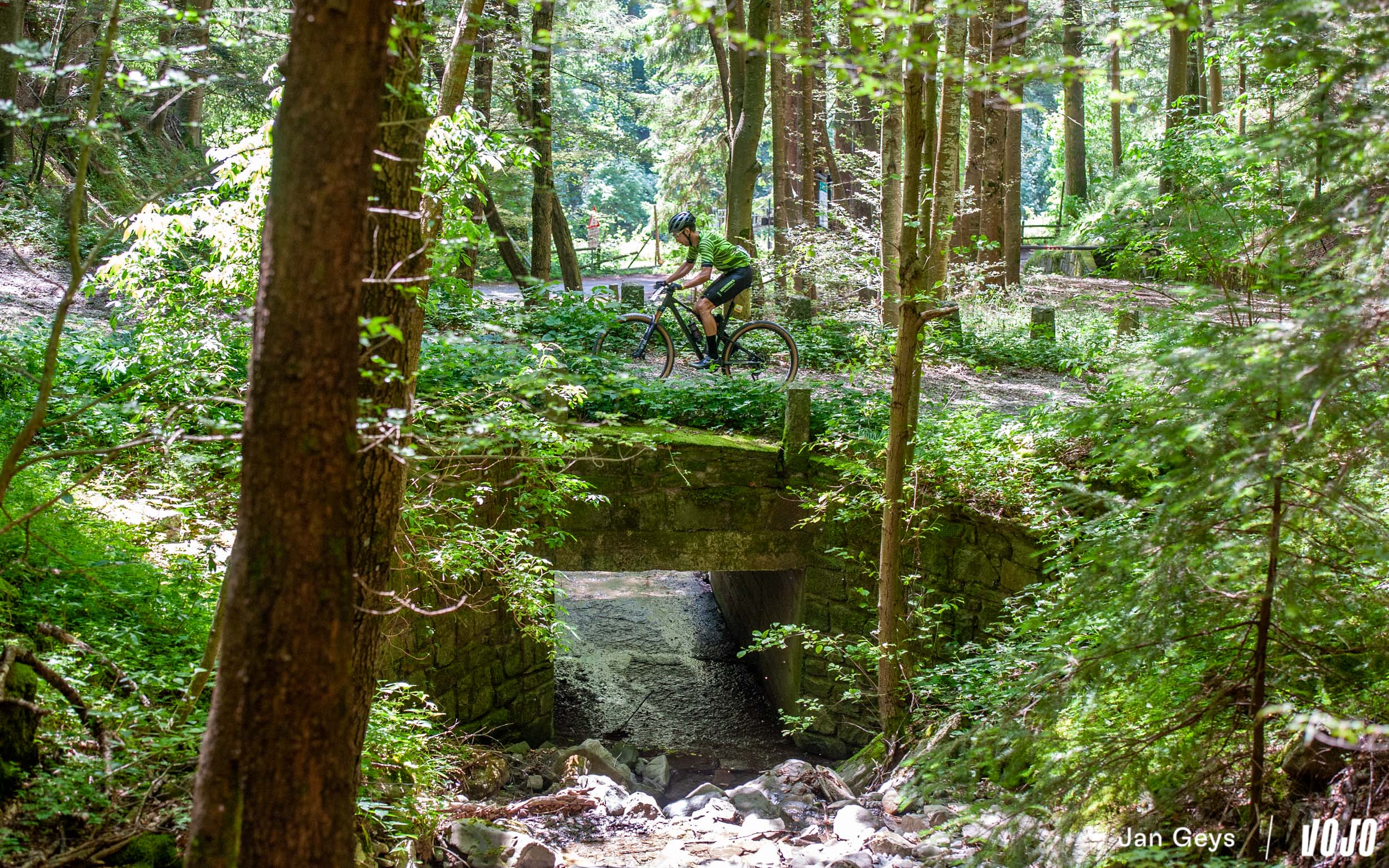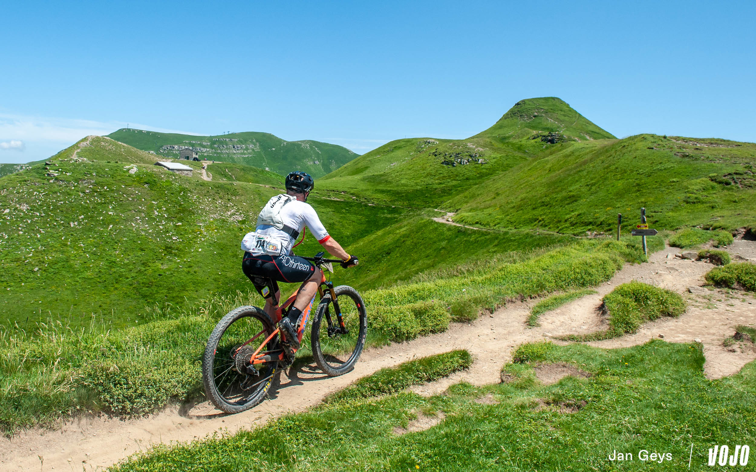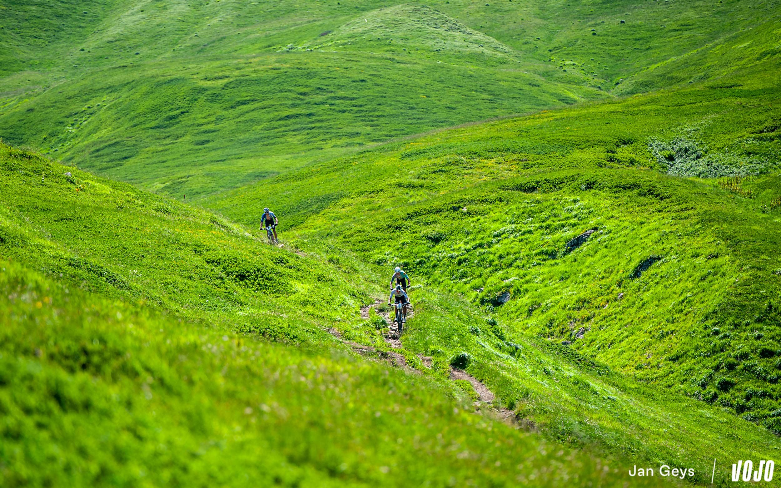 De slotklim is eentje om te onthouden: een korte offroadversie van Alpe d’Huez met 14 haarspeldbochten. Kracht, souplesse en geduld, allemaal nodig. De slotafdaling richting het dorp is een parel voor liefhebbers van technische trails. Wie houdt van scherp draaien, kleine drops en geconcentreerd sturen, komt hier volop aan z’n trekken. Òmdat we bijna de ganse rit door donkere bossen reden, waren er onderweg minder vergezichten dan gisteren – behalve aan de eerste bevoorrading – maar het parcours maakte veel goed.