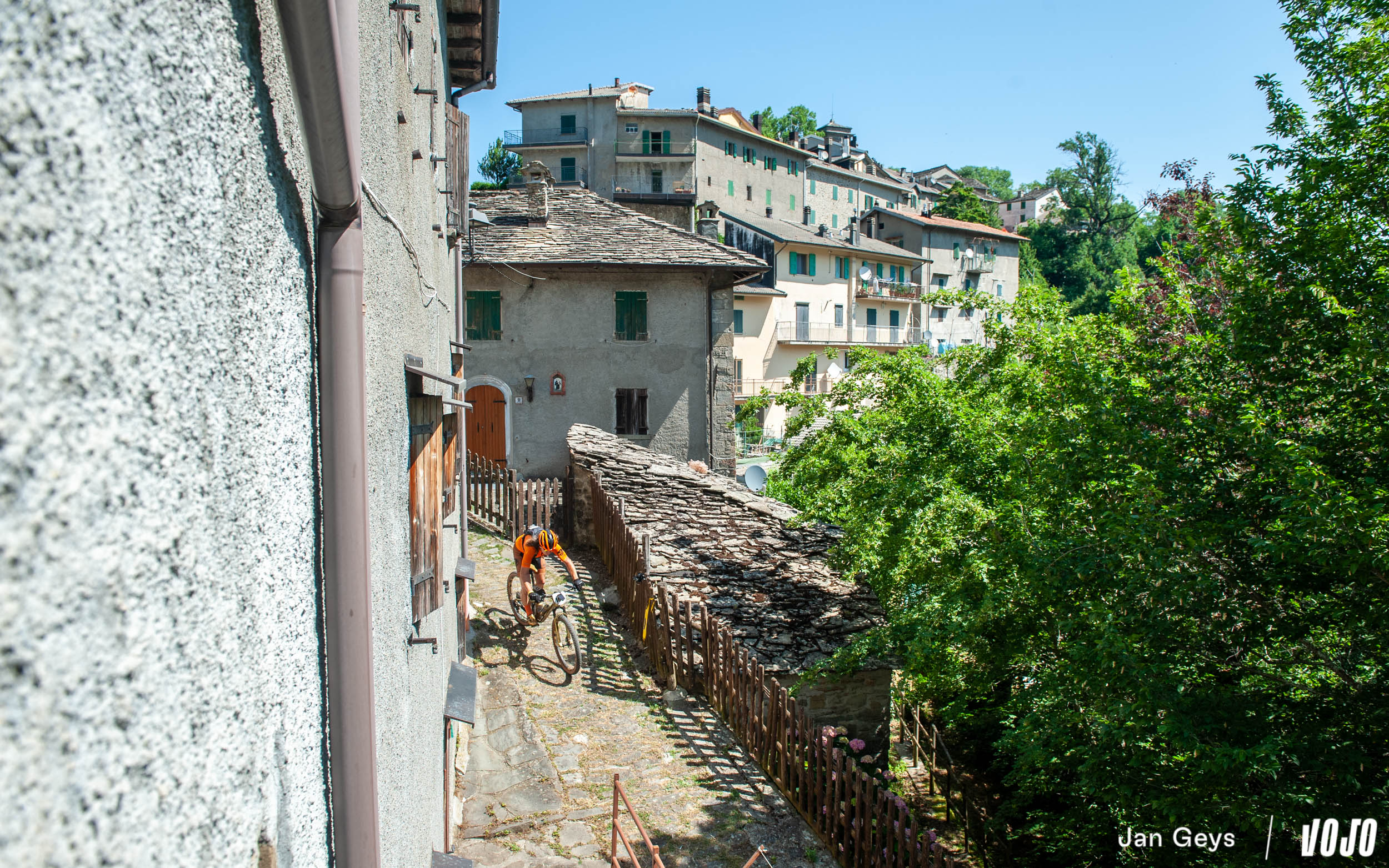De openingsrit maakt meteen een statement. We starten bijna onmiddellijk via een smal wegje met grote rotsen dat naar beneden duikt. Op de daaropvolgende klim mogen onze remmen even uitrusten, maar nu moeten onze benen vol aan de bak. Met de Alpentour Trophy al in de benen, ben ik in deze eerste rit aan mijn vijfde opeenvolgende koersdag bezig. Je zou denken dat ik daardoor wel al in mijn klimritme zou zitten, maar niets is minder waar. De lange transfer tussen Oostenrijk en Italië op zondagnamiddag kruipt nog in de fietskleren, waardoor de moed even in mijn schoenen zakt. Op de snoeiharde afdaling over rotsen en stenen die volgt, is concentratie cruciaal.
