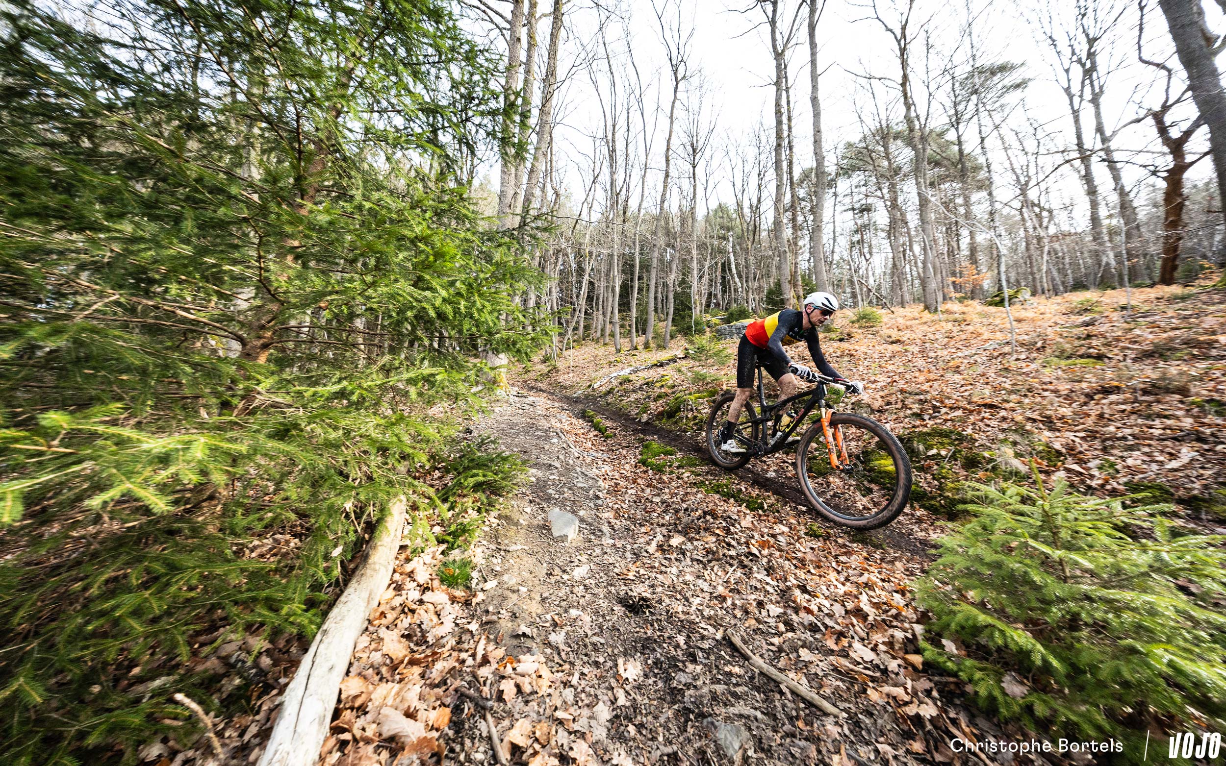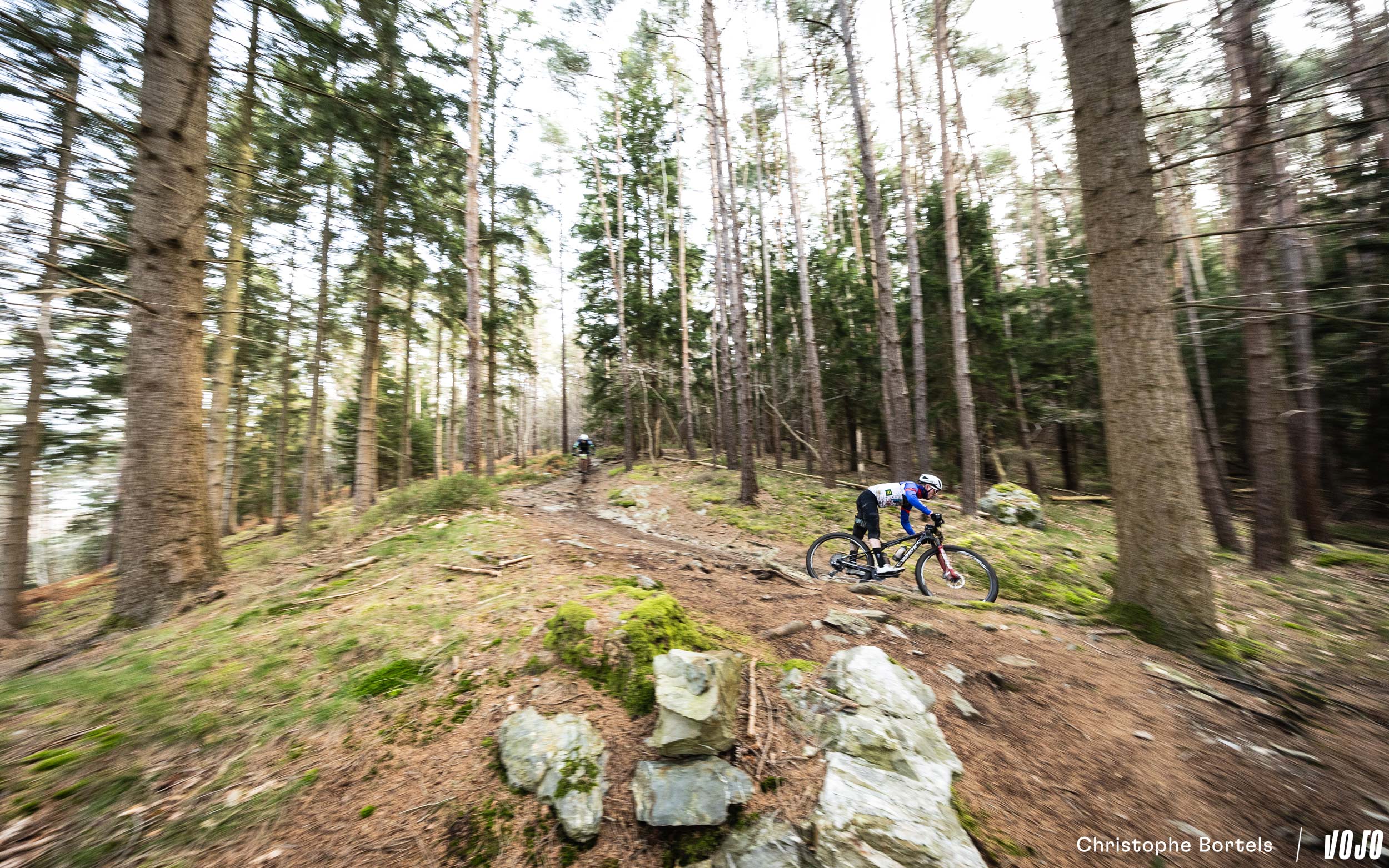 Na 13 km brengt een nieuwe, kleine lus de renners naar deze prachtige en technische afdaling waar rotsen en wortels door elkaar lopen.