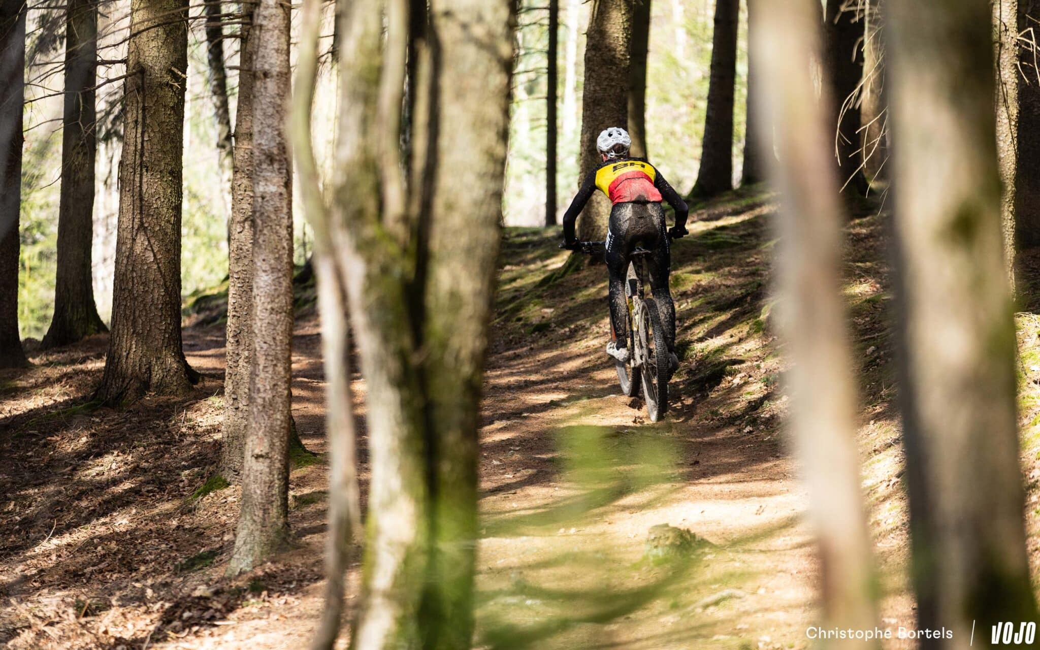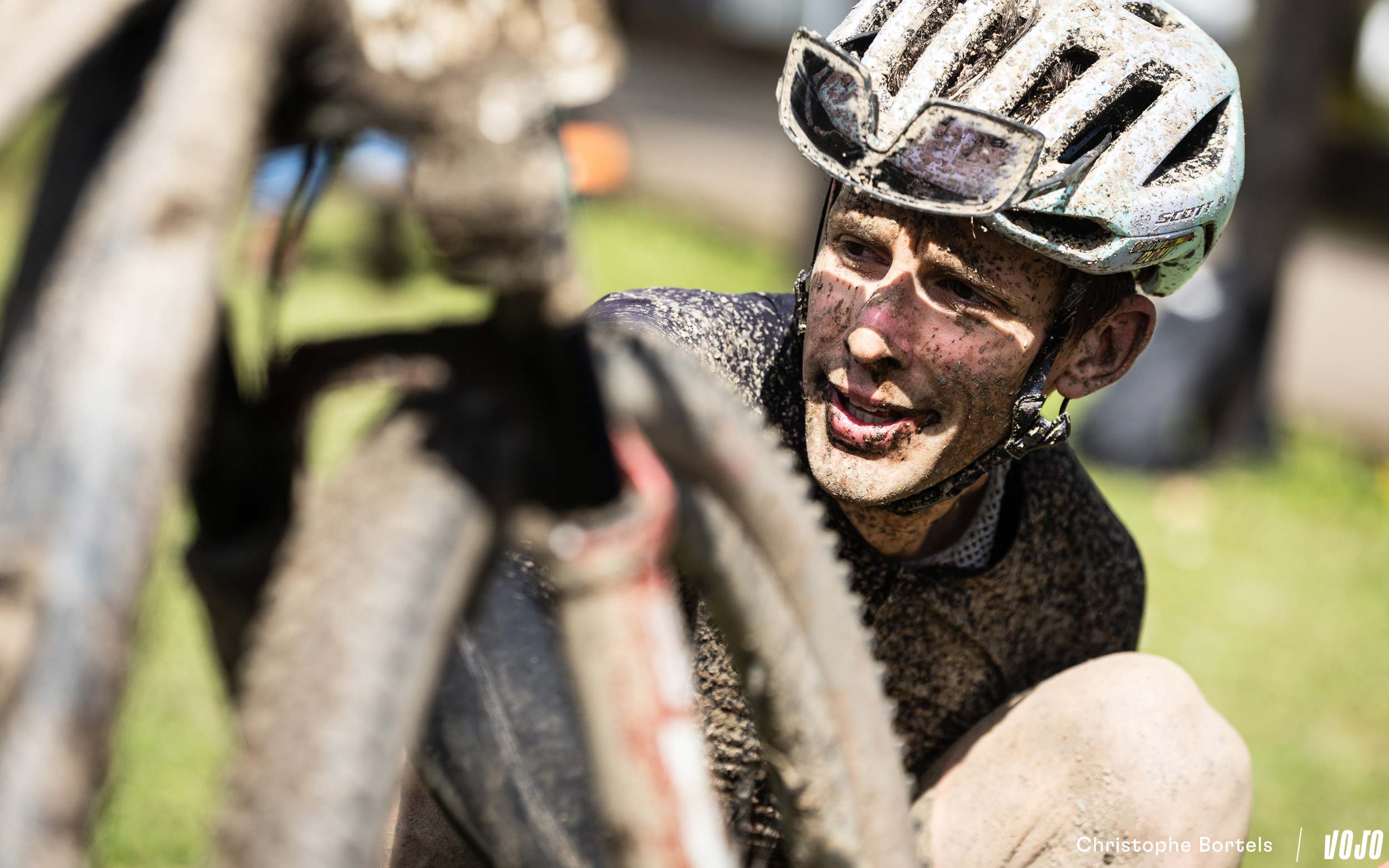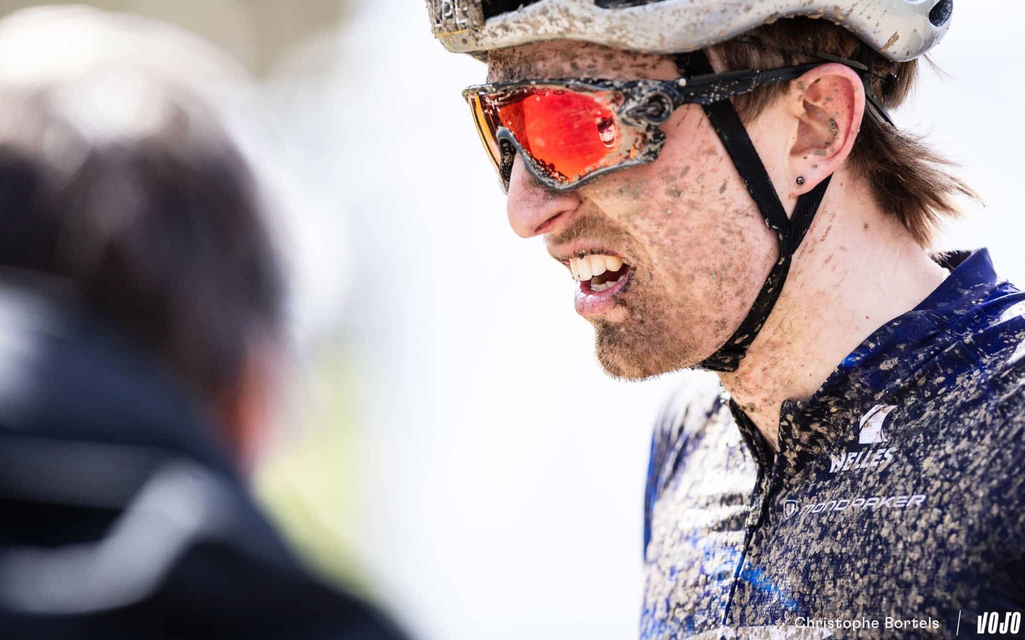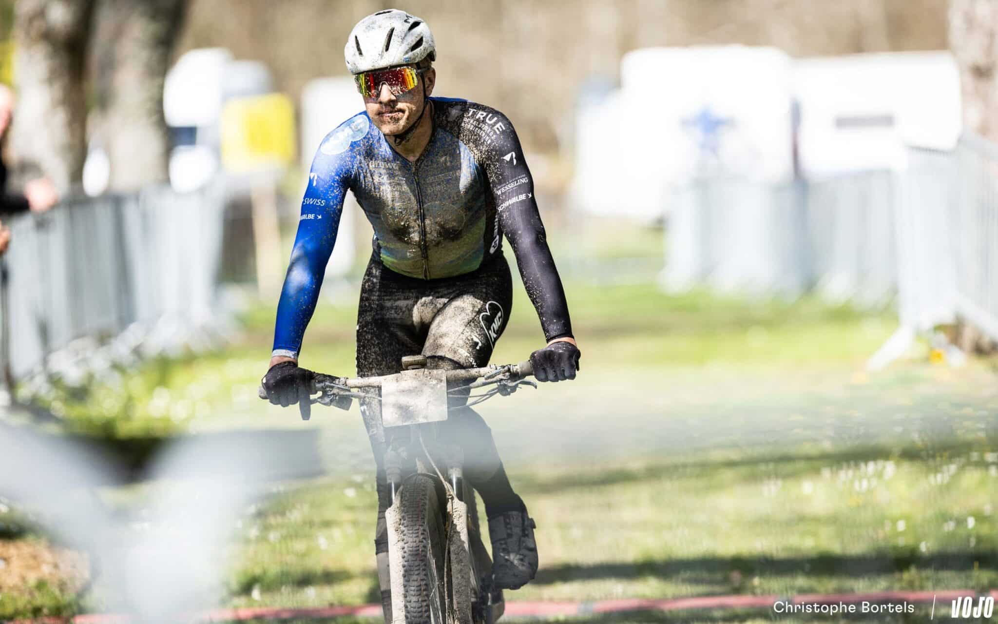 … Jens Schuermans! De meervoudige Belgische kampioen XCO heeft het duo Grégoire-Janssen bijgebeend nadat zijn ketting er een paar kilometer eerder was afgesprongen en vast kwam te zitten.