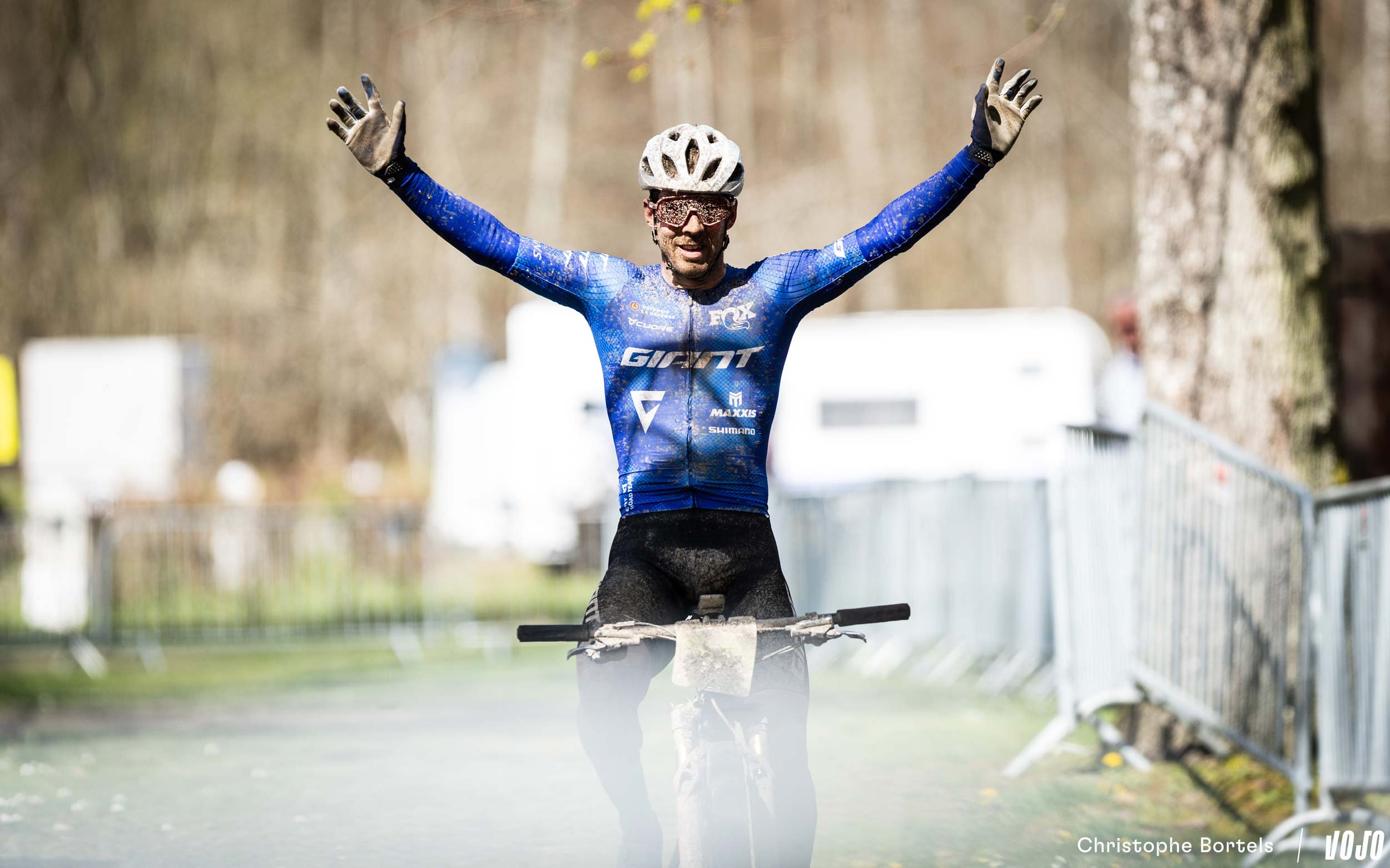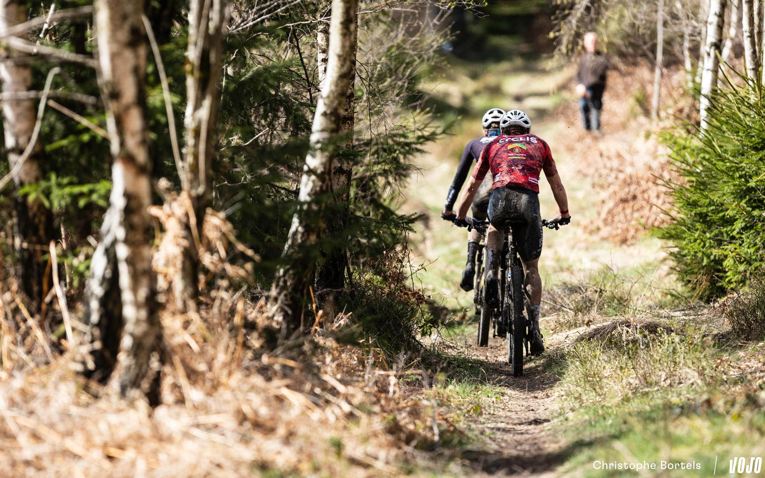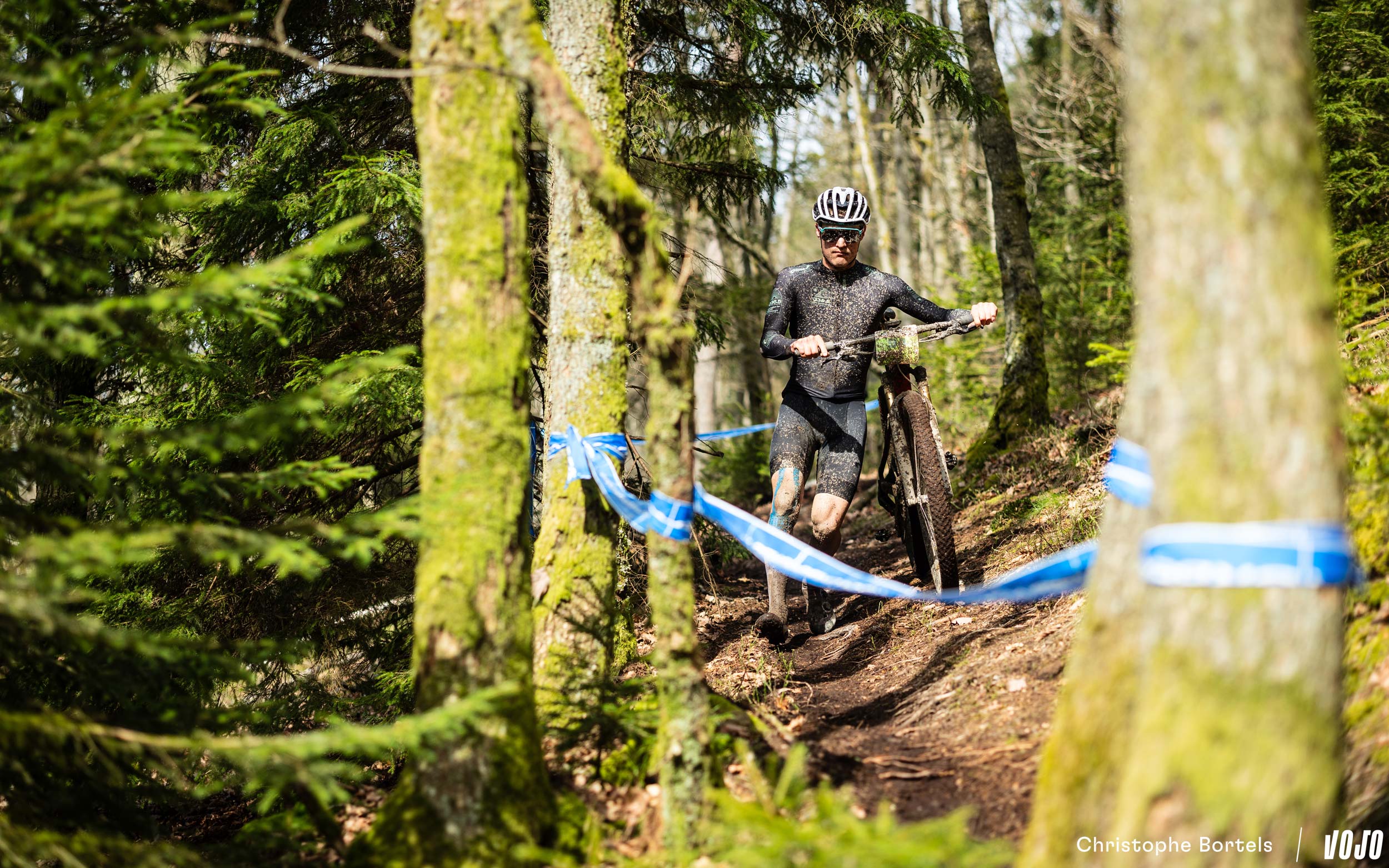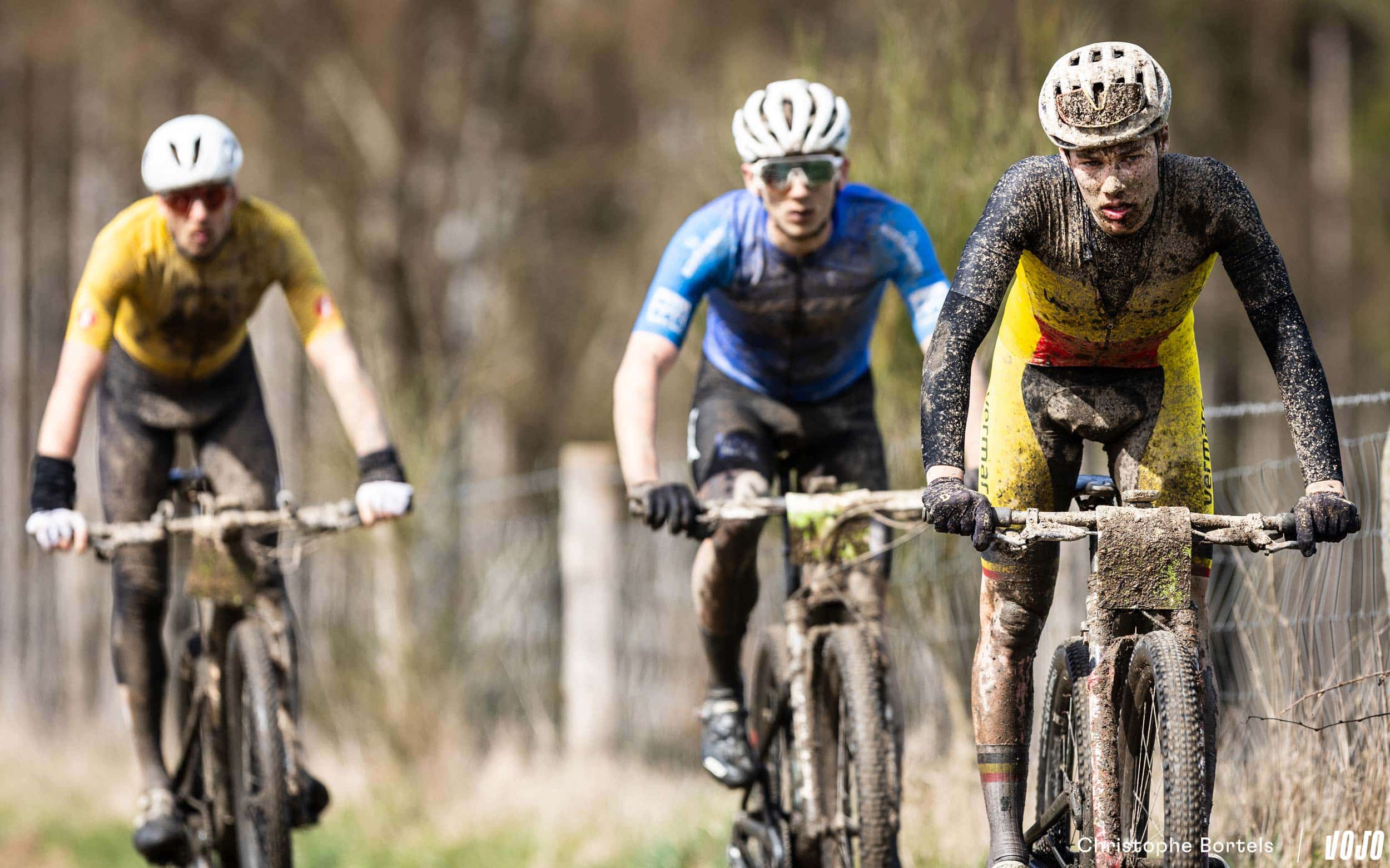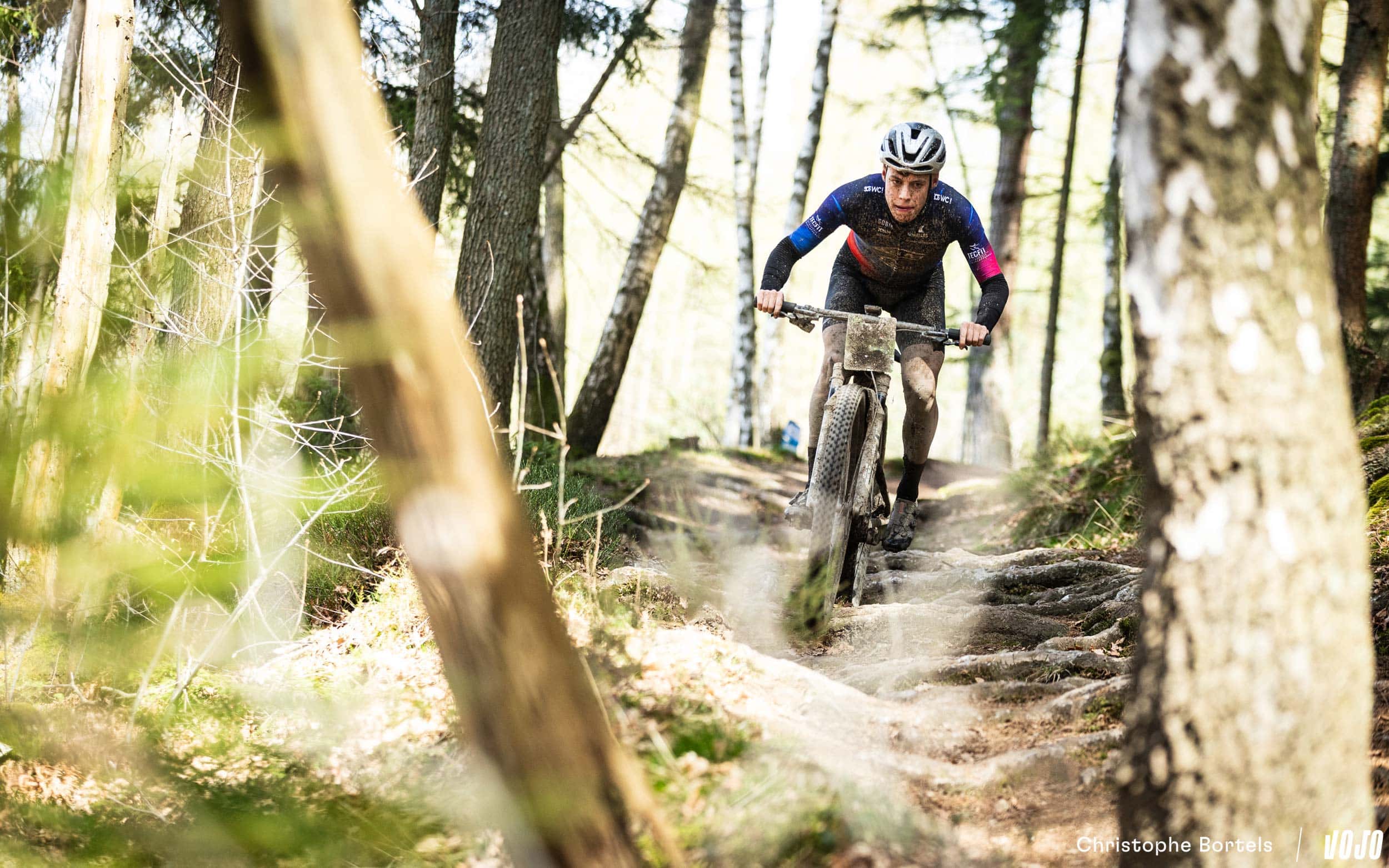 … Jens Schuermans! De meervoudige Belgische kampioen XCO heeft het duo Grégoire-Janssen bijgebeend nadat zijn ketting er een paar kilometer eerder was afgesprongen en vast kwam te zitten.
