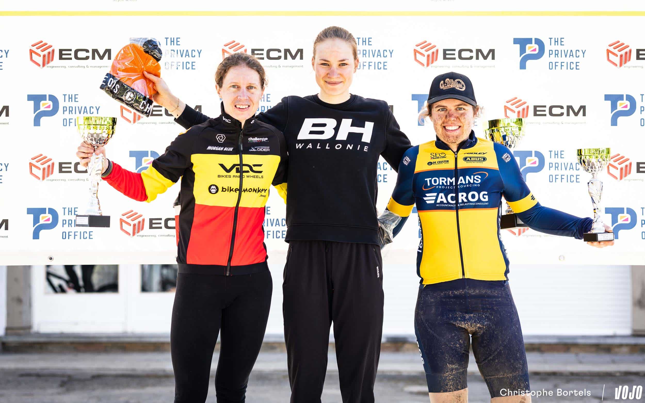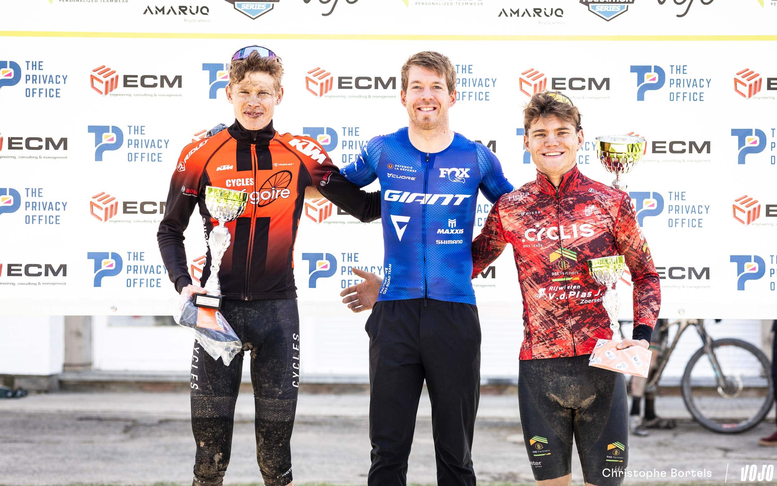 Het podium: Simon Grégoire (2de), Jens Schuermans (1ste) en Wout Janssen (3de).