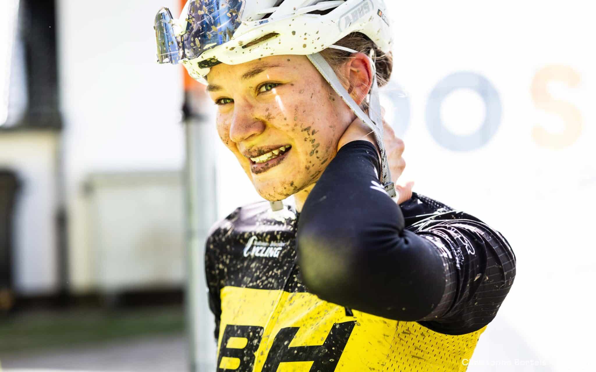 Melanie Van Campfort vervolledigt als derde het podium in de scratch bij de vrouwen; bij de elitevrouwen eindigt ze als tweede.