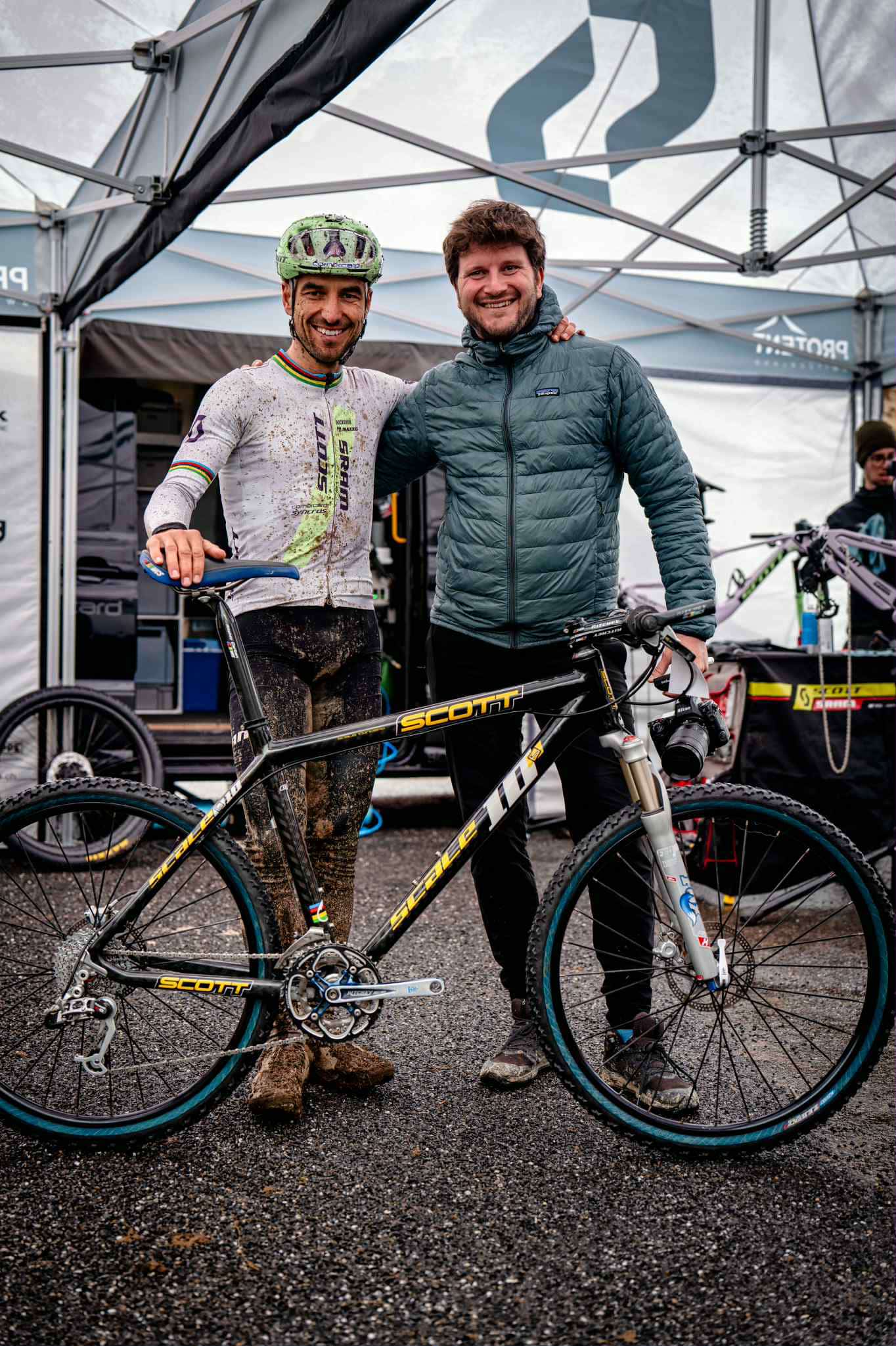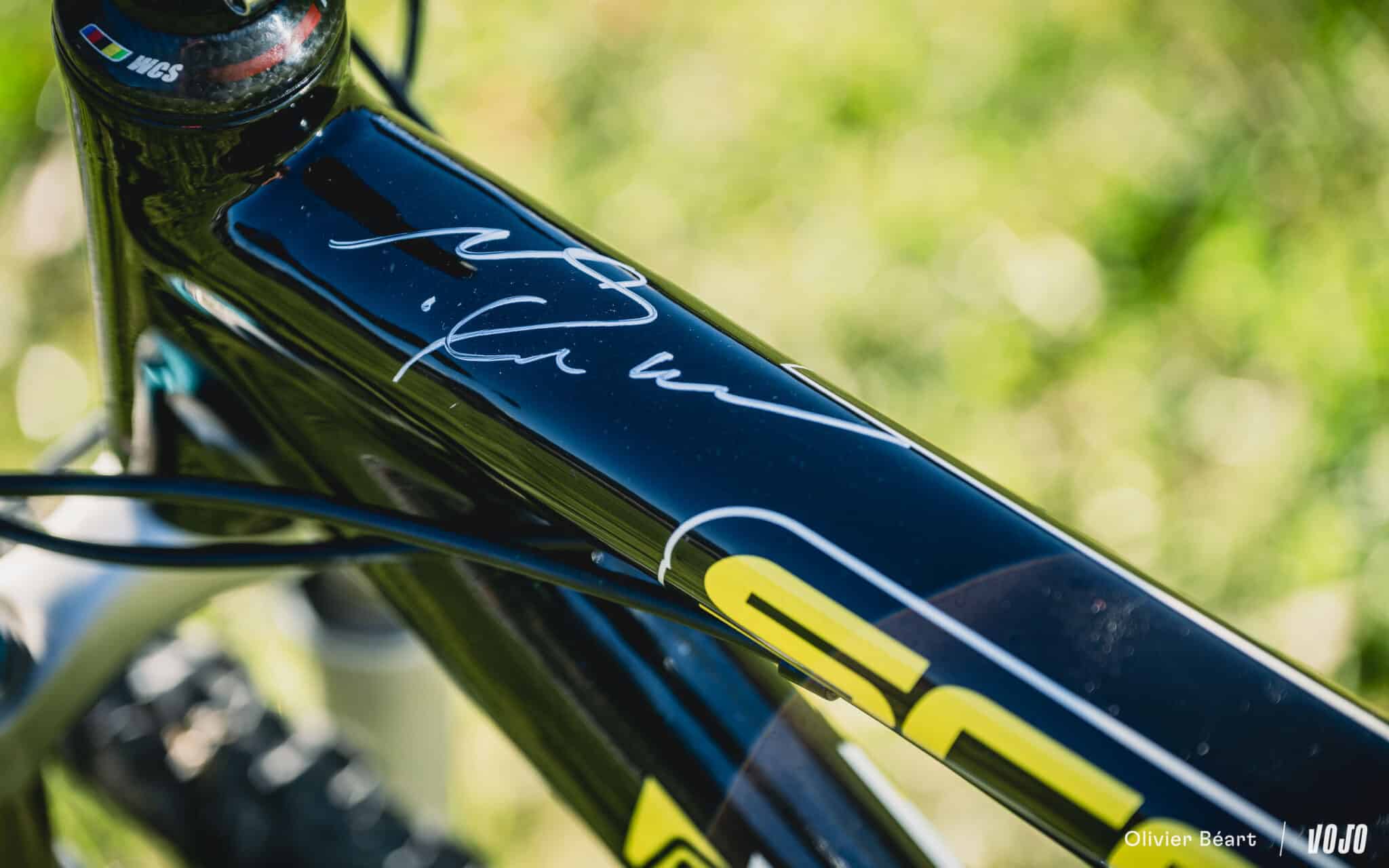 Maandenlang zocht ik naar de onderdelen, restaureerde en zette geduldig een Scott Scale in elkaar, identiek aan de fiets waarmee hij in 2004 zijn eerste wereldtitel bij de junioren in Les Gets won. Het was een enorme klus, maar ook erg leuk, met als hoogtepunt Nino’s enthousiaste reactie toen we hem het resultaat lieten zien tijdens de Wereldbeker in Les Gets deze zomer. Een moment dat me altijd bij zal blijven, en een fiets die een heel speciale plek in de Vojo-collectie zal innemen.