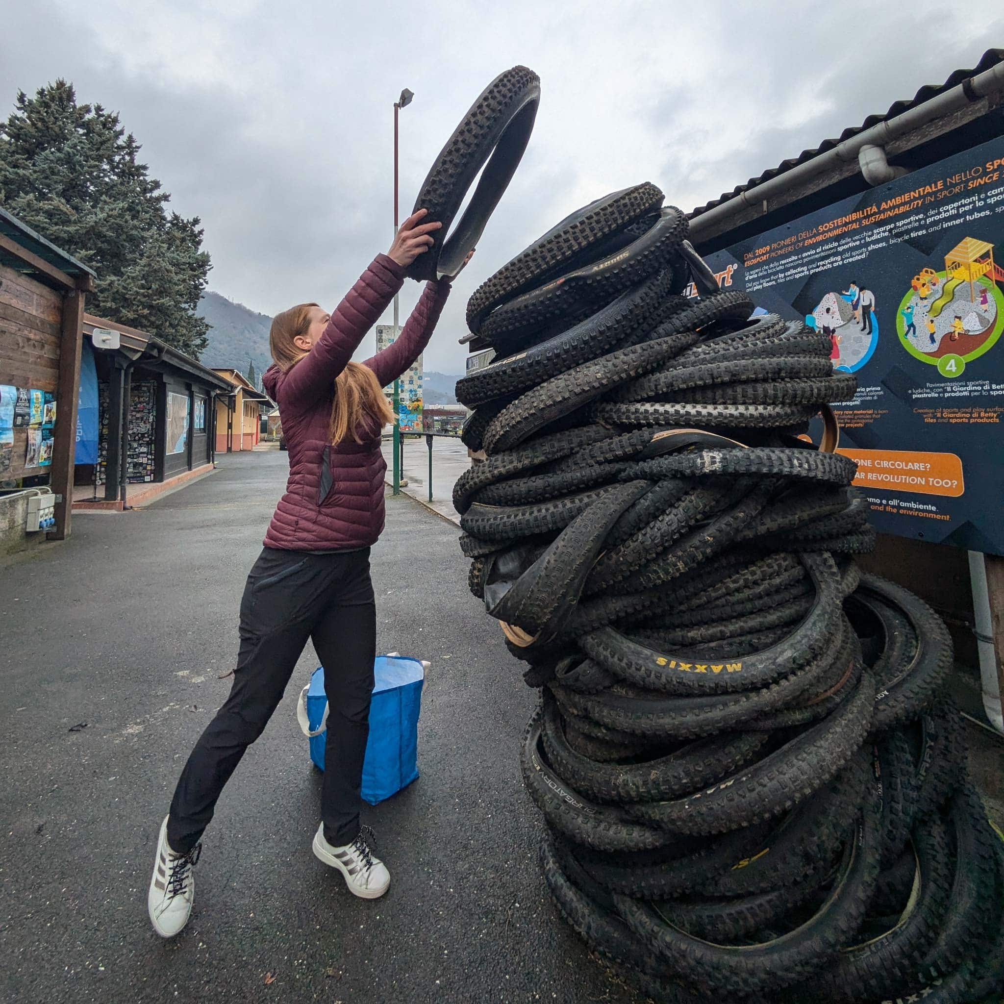 We slijten ze, we krijgen er lekken in, we scheuren ze: banden zijn zo’n beetje het ultieme verbruiksartikel in de fietswereld. En bovendien nemen ze veel ruimte en gewicht in beslag … Dus als ik zie dat ze over het algemeen niet worden geaccepteerd bij recyclingcentra, en dat we in België bijvoorbeeld te horen krijgen dat we ze bij het gewone afval moeten gooien, dan knaagt dat echt aan mijn geweten. Gelukkig worden er (misschien wel te) langzaam recyclingprogramma’s ingevoerd. Schwalbe lanceerde bijvoorbeeld een paar jaar geleden een inzamelprogramma voor gebruikte banden via bepaalde retailers, maar de informatie is niet altijd even makkelijk te vinden. In Finale Ligure (Italië), waar ik vaak kom en waar de rotsachtige endurotrails banden echt op de proef stellen, kun je sinds 2024 je versleten banden en binnenbanden inleveren bij een speciaal inzamelpunt bij het informatiepunt (en trouwens punten sparen op je FOR You Card). Ze worden vervolgens verwerkt tot bestrating voor speeltuinen en sportvelden. Dit is uiteraard nog maar het begin, en we hopen dat dergelijke sectoren zich in de toekomst verder zullen ontwikkelen en vermenigvuldigen.