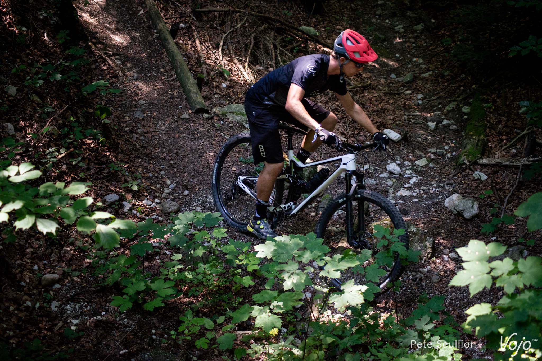 De volgende dag springen we op de Merida One-Twenty 8000, het model dat een trapje hoger staat in de rangorde (maar die zoals eerder al geschreven niet verkrijgbaar is in de Benelux). Dit model geniet van een volledig carbon frame, FSA Gradient LTD-wielen uit hetzelfde materiaaal en Sram Code-remmen. Ook de andere onderdelen zijn van een hoger niveau. Deze fiets klokt af op ongeveer 12 kilogram en we haasten ons naar de technische paden van de dag voordien.