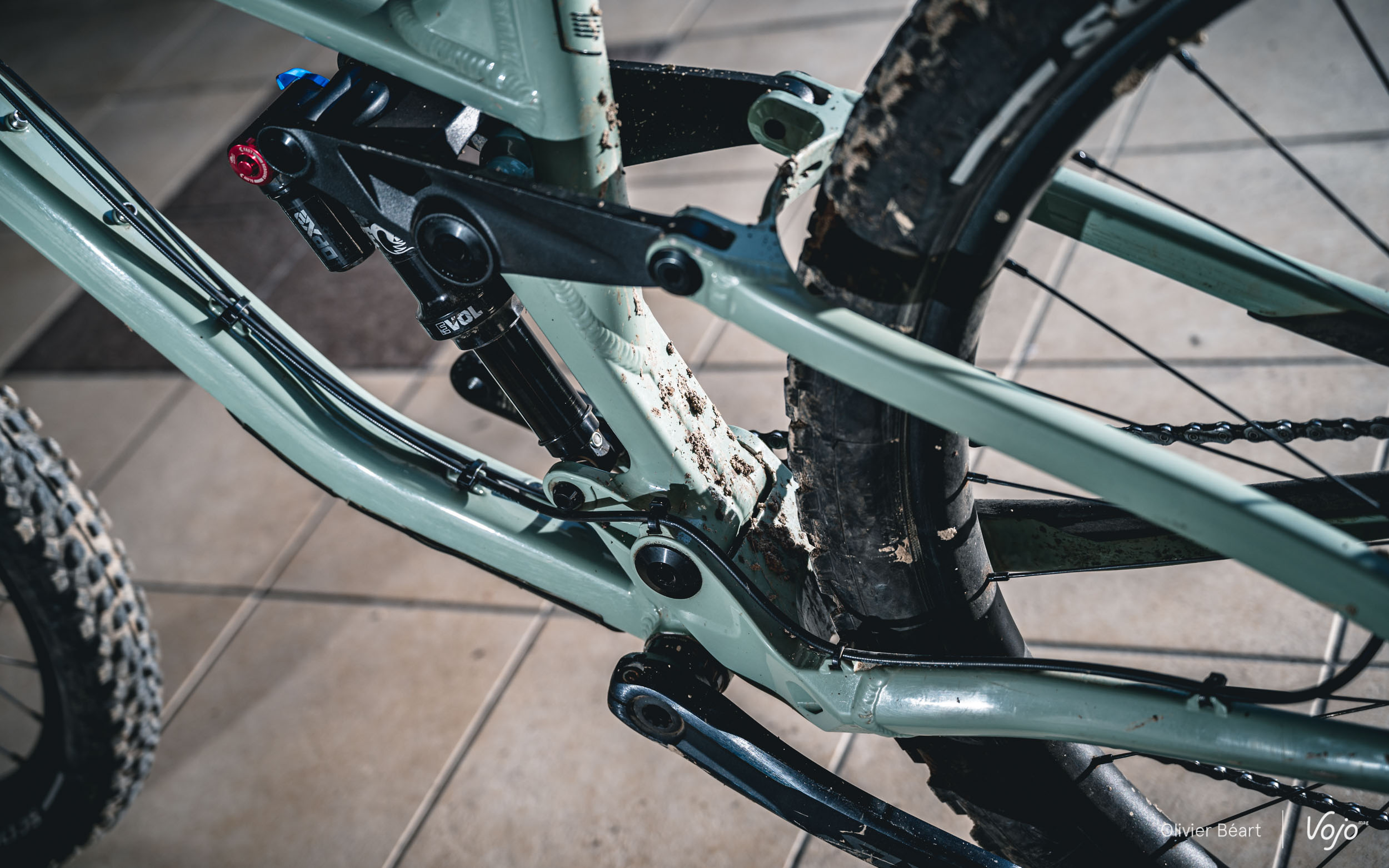 Net als de 161, de eerste fiets van het merk, heeft deze vering een four bar linkage en een zwevende schokdemper, d.w.z. geplaatst tussen de achtervork en de linkage bar. Hier is er … 141 millimeter veerweg; waarnaar de naam van de fiets dus ontegensprekelijk verwijst.
