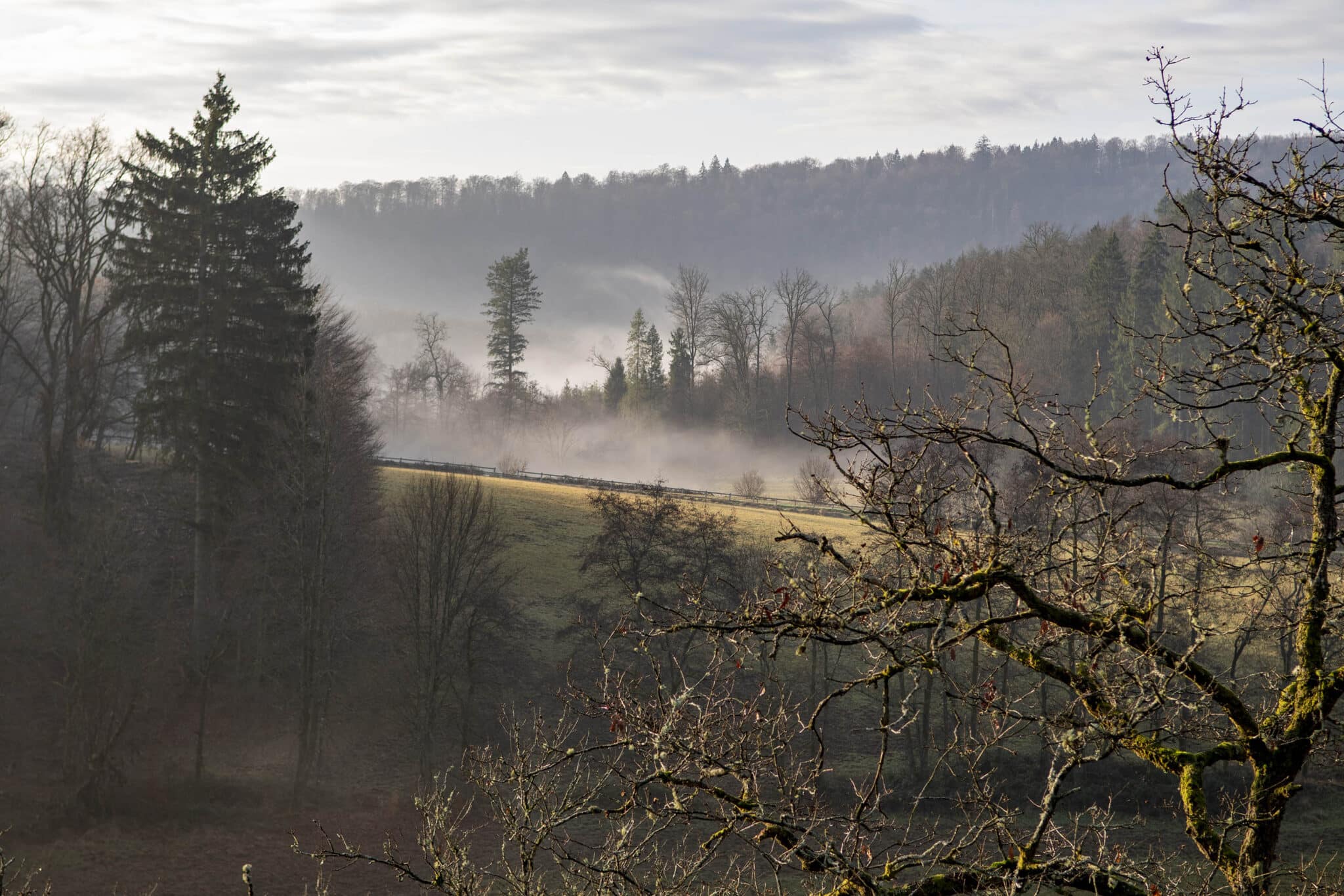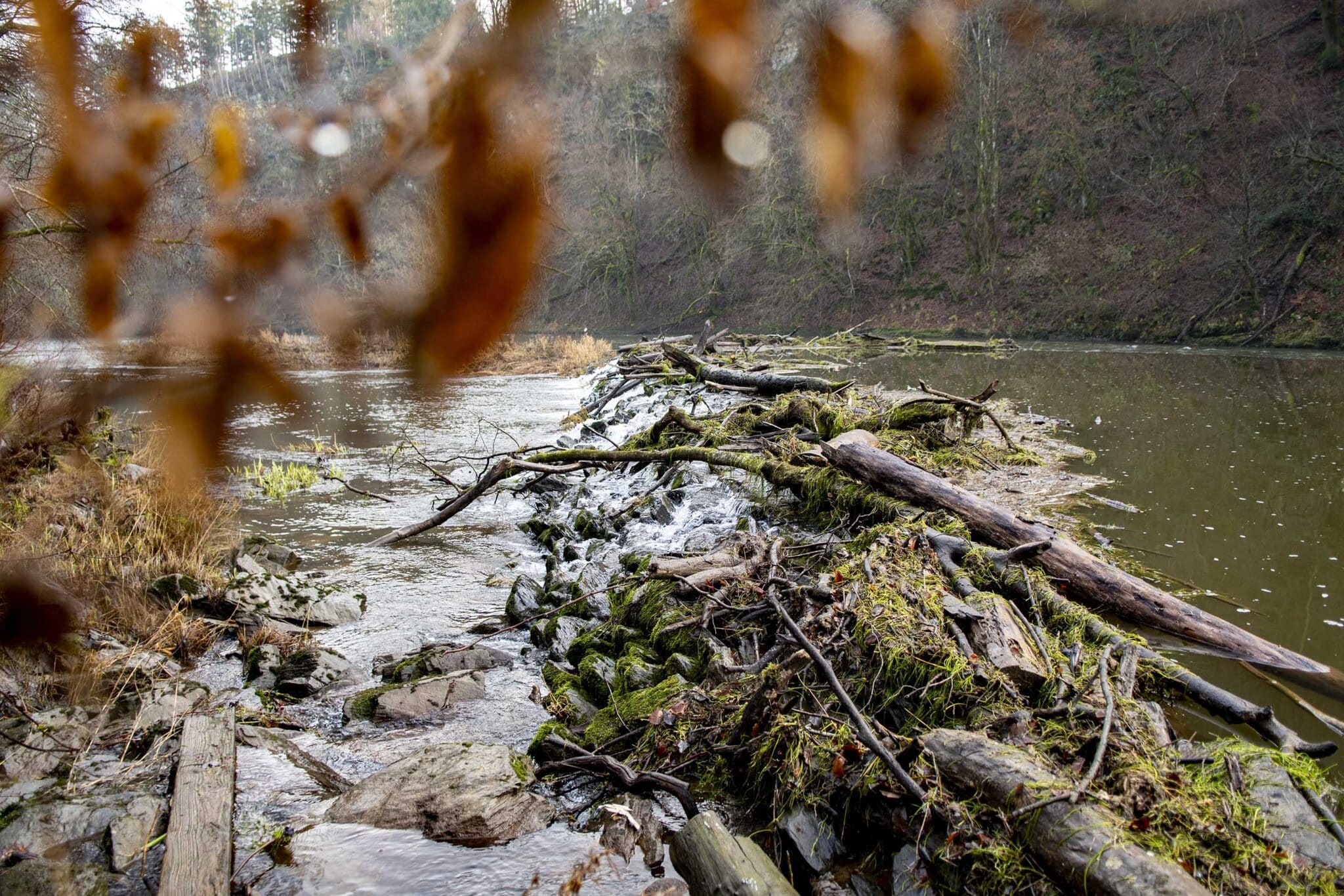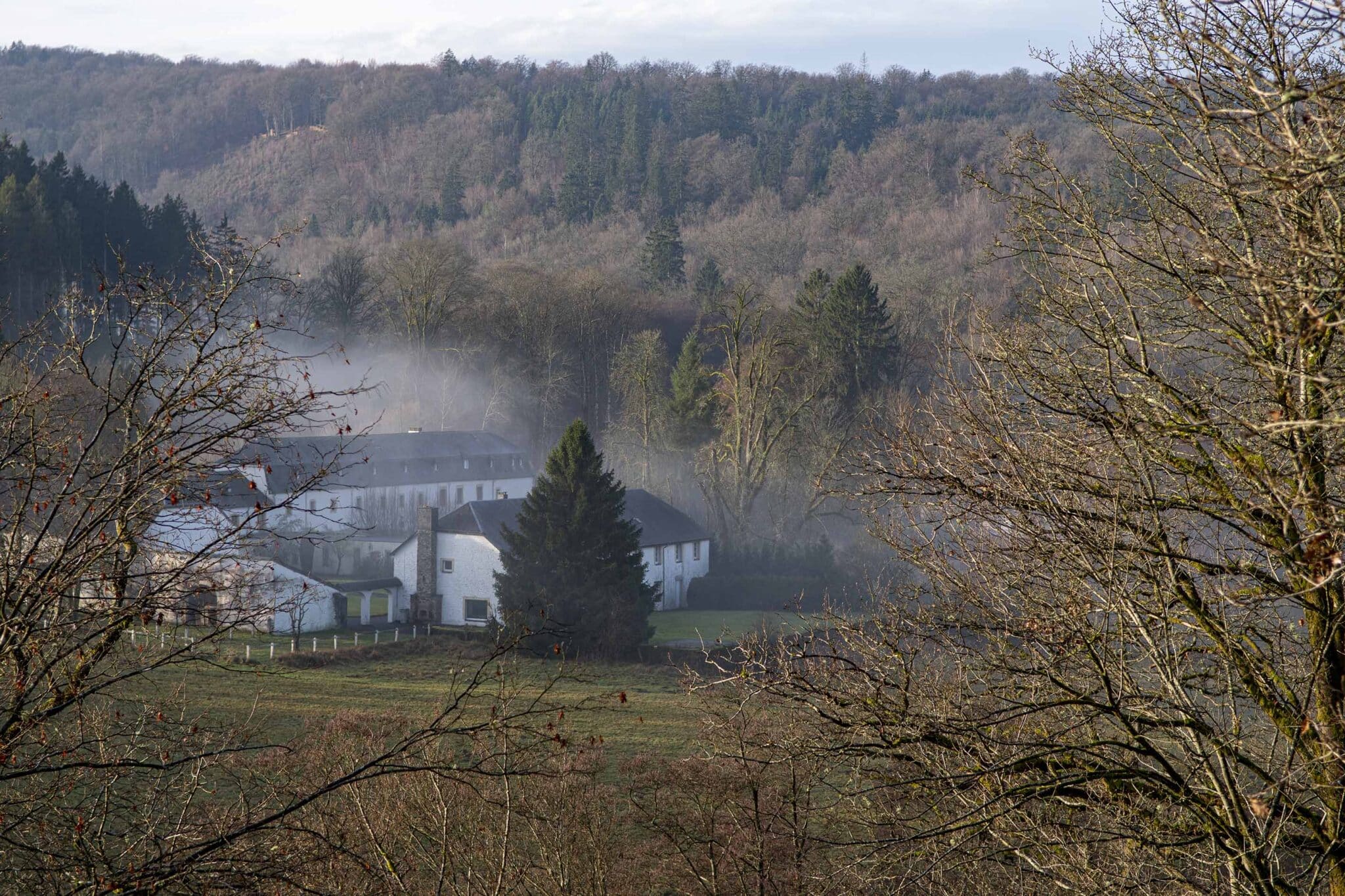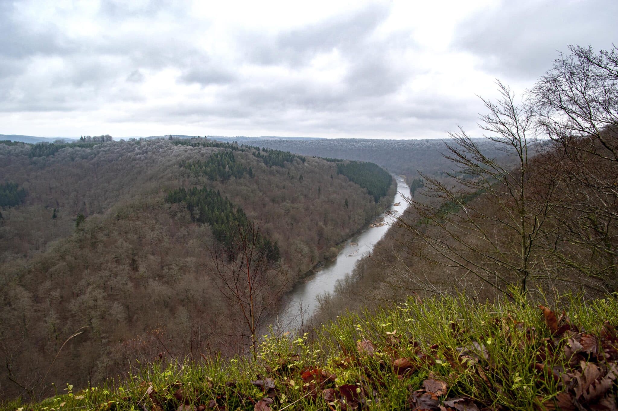 De Ardennen en zijn uitgestrekte bossen omsluiten ons geleidelijk: het volgende dorp ligt op meer dan tien kilometer afstand. Hoewel de rivieroevers niet wit zijn geworden van de vorst, is de vorst wel als een delicate laag kant over de boomtoppen gedrapeerd.