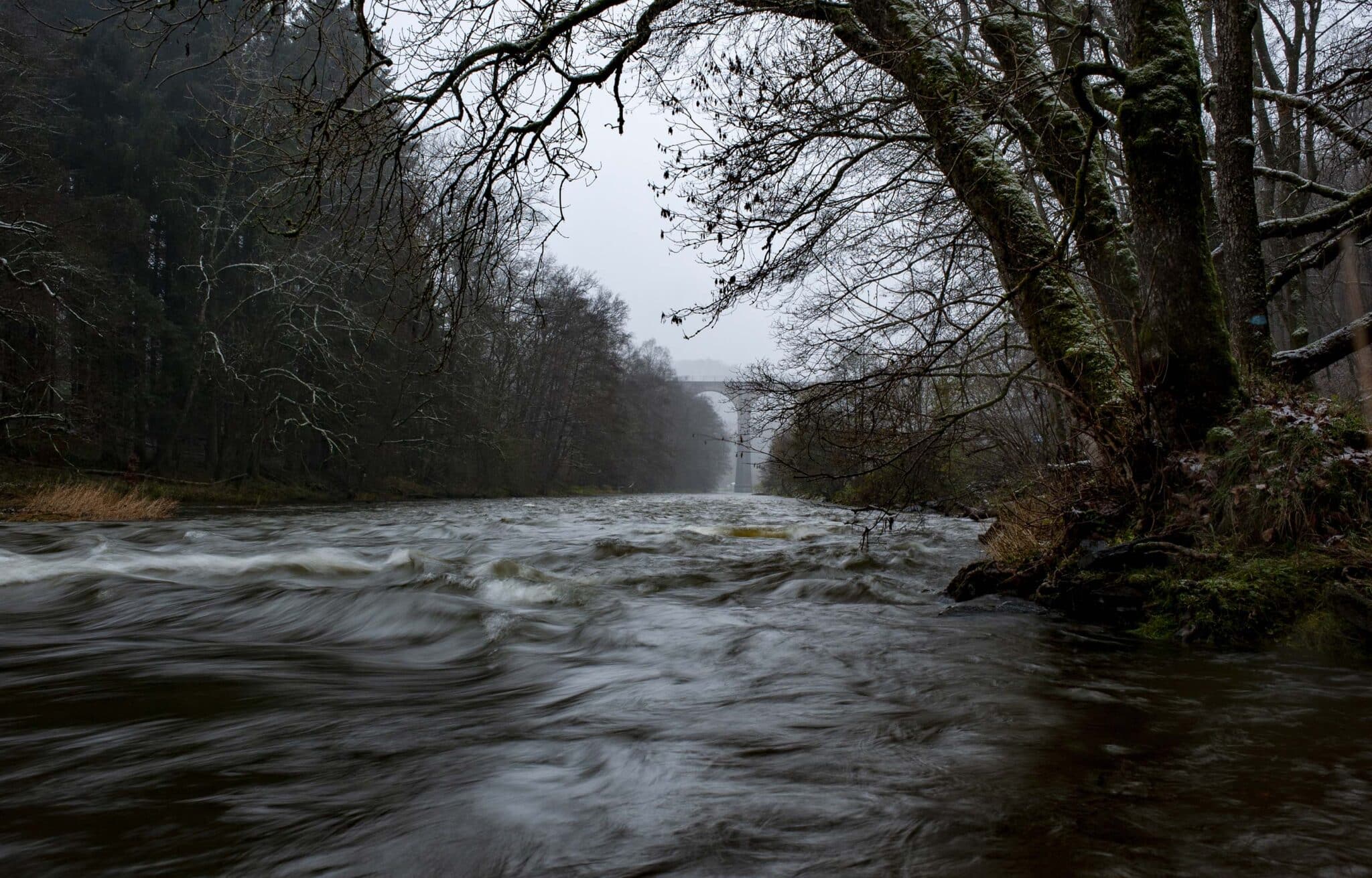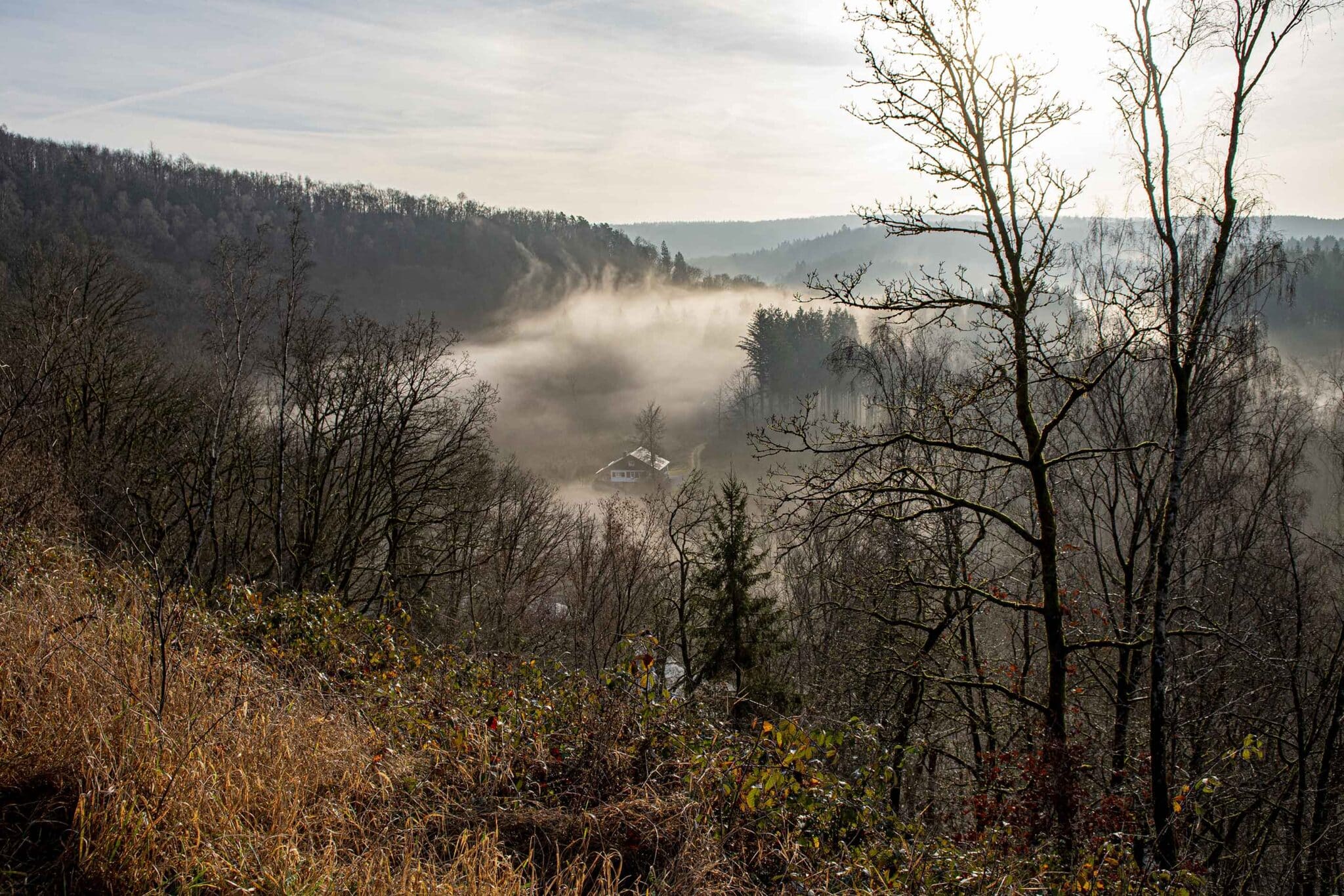 Een flinke afdaling brengt ons aan de oevers van de Semois. Het pad langs de rivier is adembenemend. De bleke zonnestralen en de opstijgende mist creëren fantastische schaduwen.