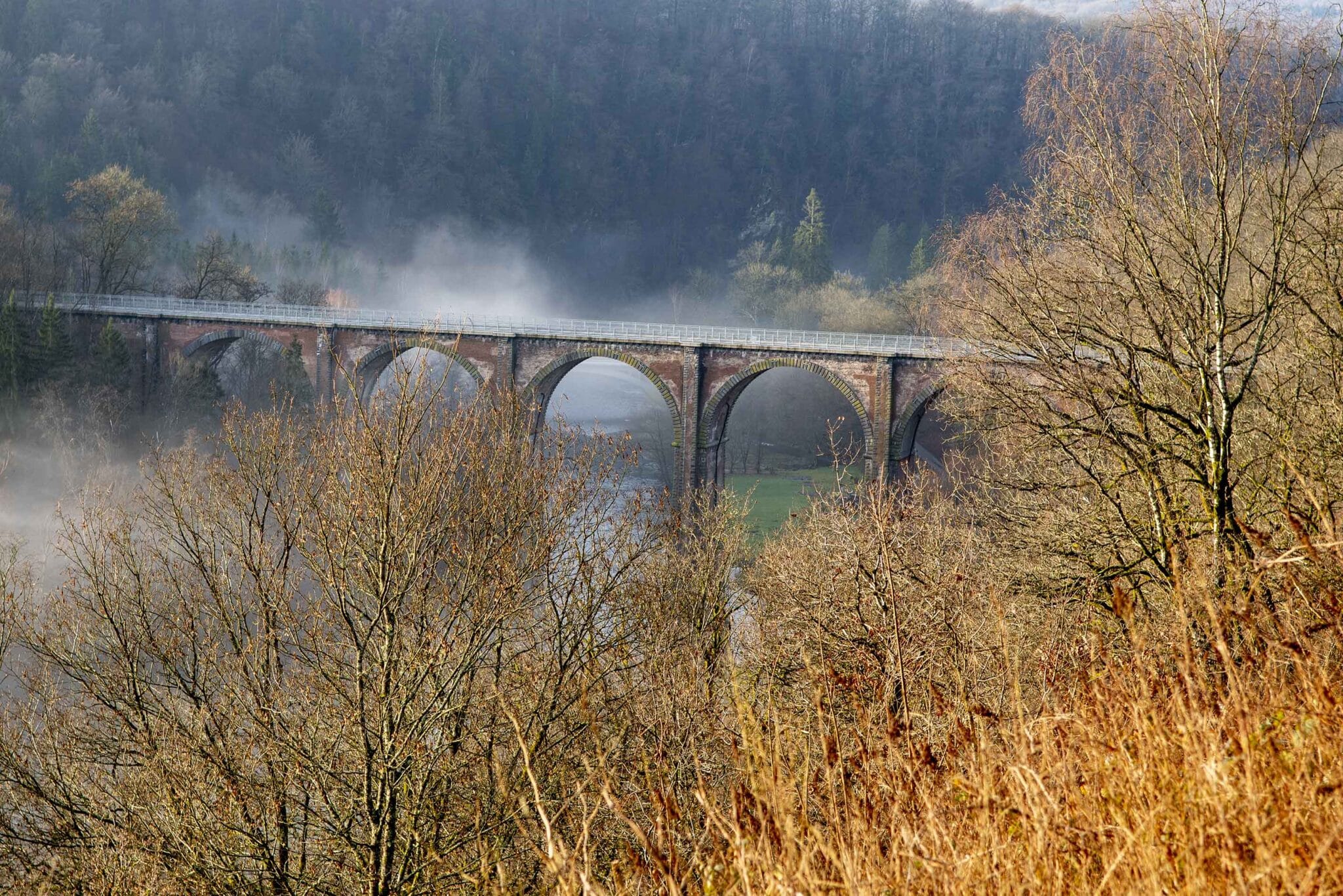 De voormalige spoorlijn Bertrix-Herbeumont-Muno werd aangelegd tussen 1902 en 1914. De bouw vond plaats in een tijd waarin ingenieurs zich niet snel lieten afschrikken door uitdagend terrein. Dit blijkt uit het indrukwekkende viaduct, waarvan de zeven bogen de 38 meter lager gelegen rivier overspannen. De voormalige spoorlijn is nu een aangenaam wandelpad, de ‘Voie des Pierres qui Parlent’ (Pad van de Sprekende Stenen).