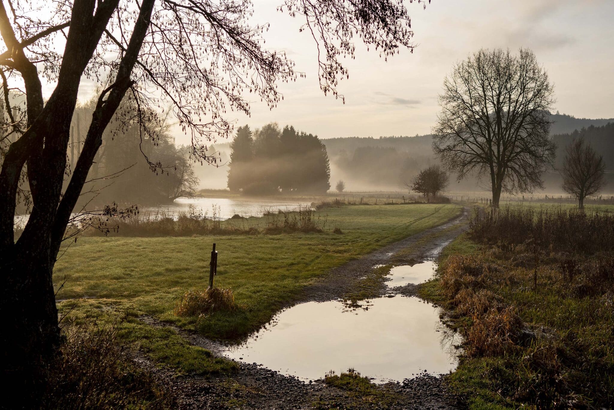 Een flinke afdaling brengt ons aan de oevers van de Semois. Het pad langs de rivier is adembenemend. De bleke zonnestralen en de opstijgende mist creëren fantastische schaduwen.