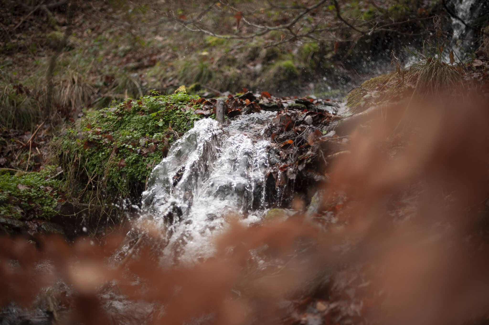 Net als we aan de gemarkeerde route beginnen, breekt de zon door de lage bewolking heen. Het belooft een prachtige dag te worden. De route loopt al snel het bos in, langs een schitterend beukenbos en een beekje, de Antrogne.