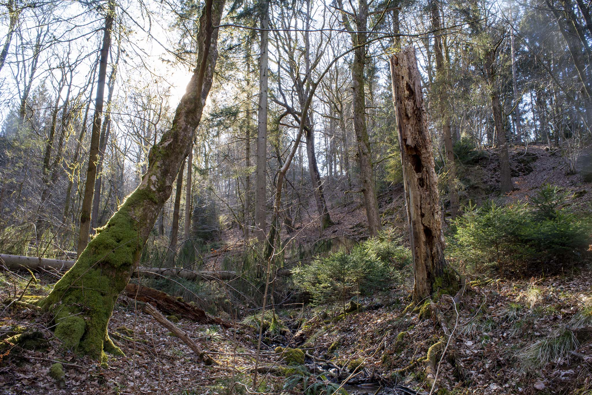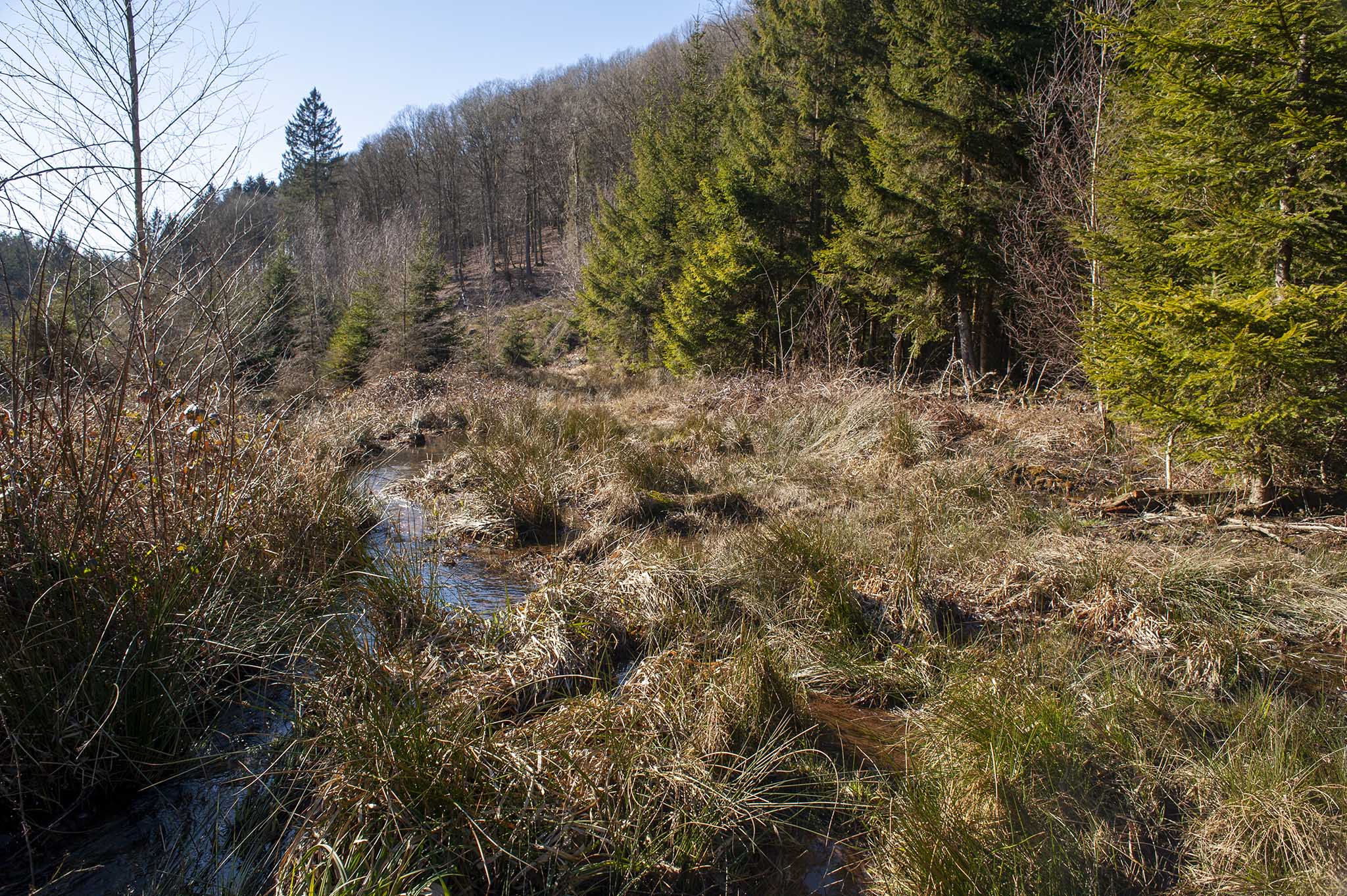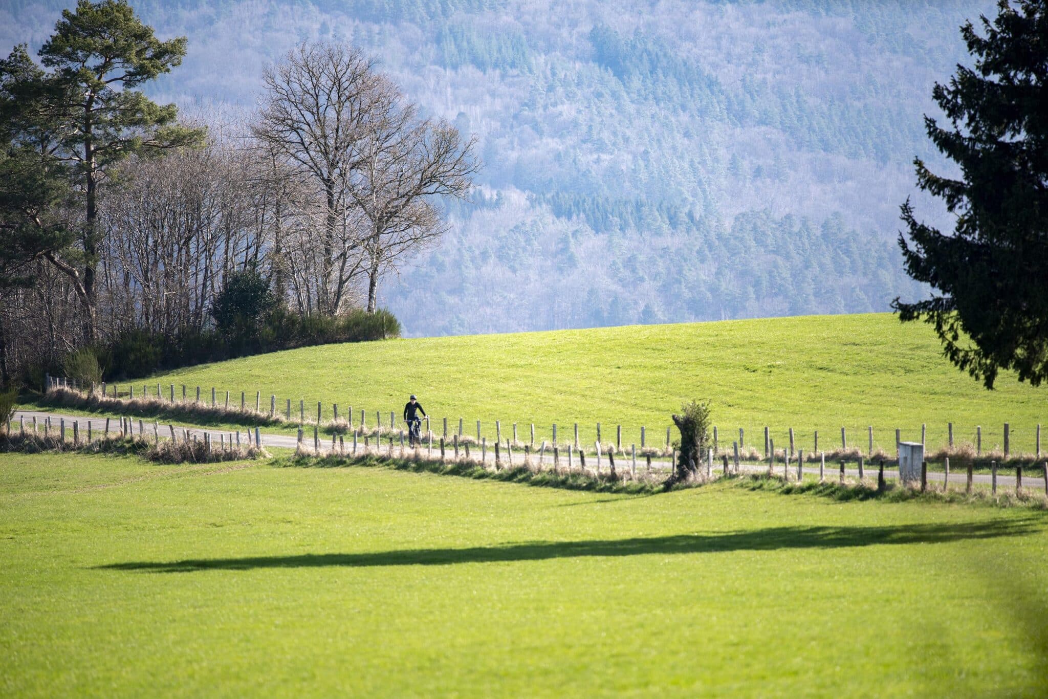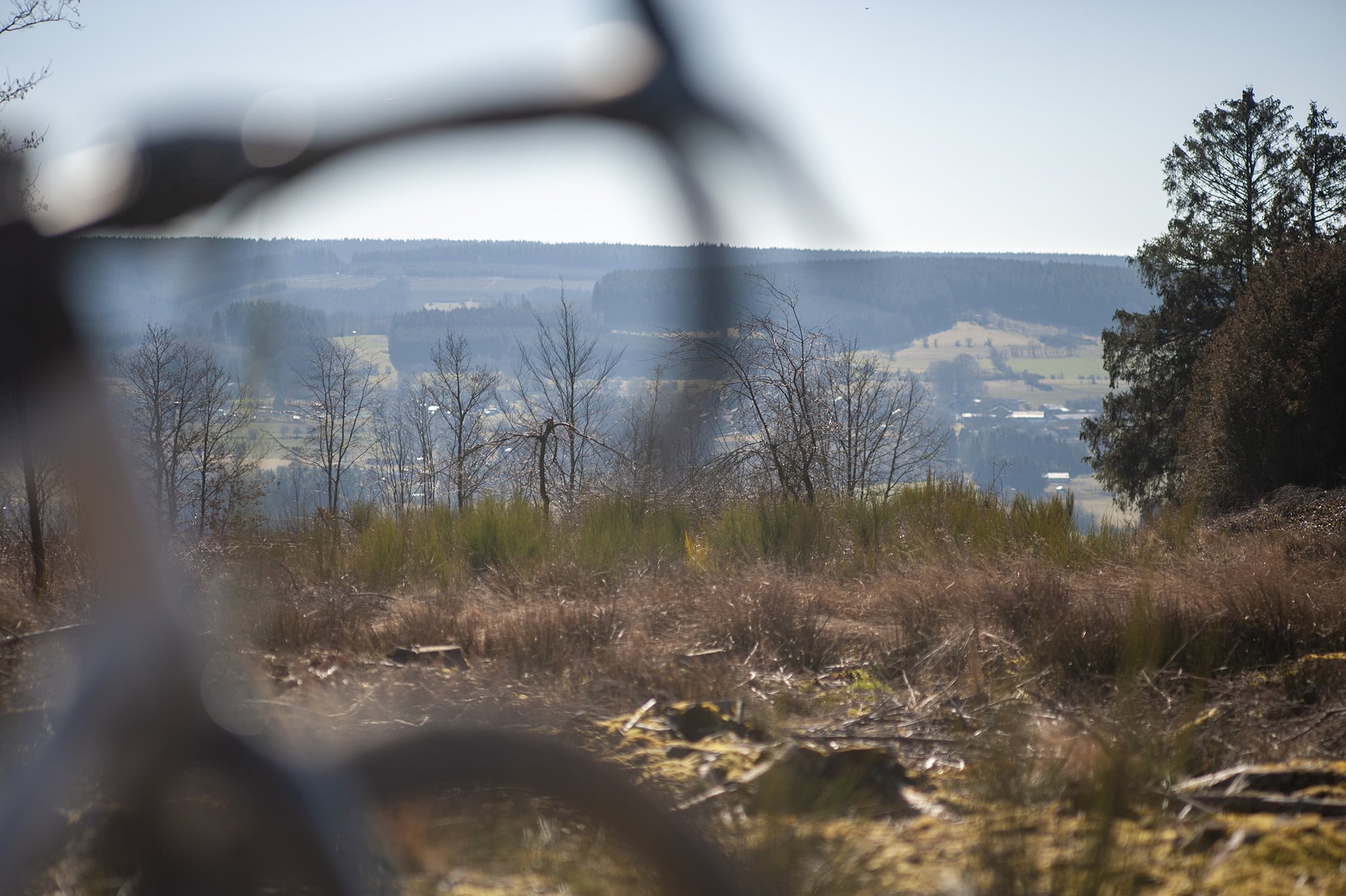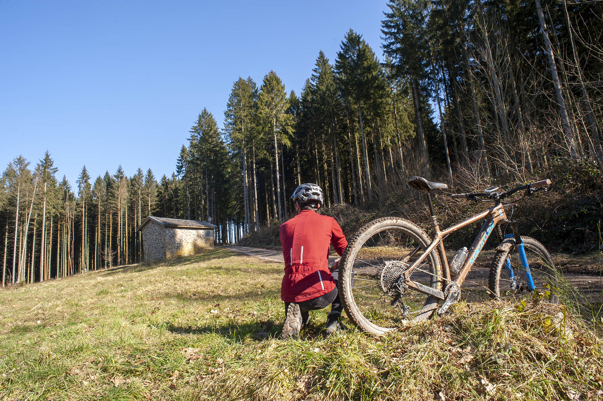 Hoewel onze tocht zich afspeelt onder het bladerdak van de bomen, is deze allesbehalve eentonig. De rijen sparren die je zo vaak in de Ardennen ziet, maken plaats voor prachtige gemengde bossen van dennen en loofbomen, waar een rijk ecosysteem floreert. In de zomer vermengt hun geur zich met die van wilde bosbessen; in maart moet de tochtrijder tevreden zijn met een zuivere, droge lucht. Vervuiling lijkt zo ver weg.