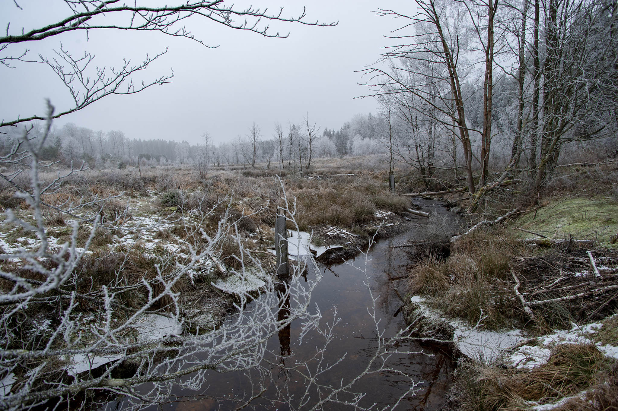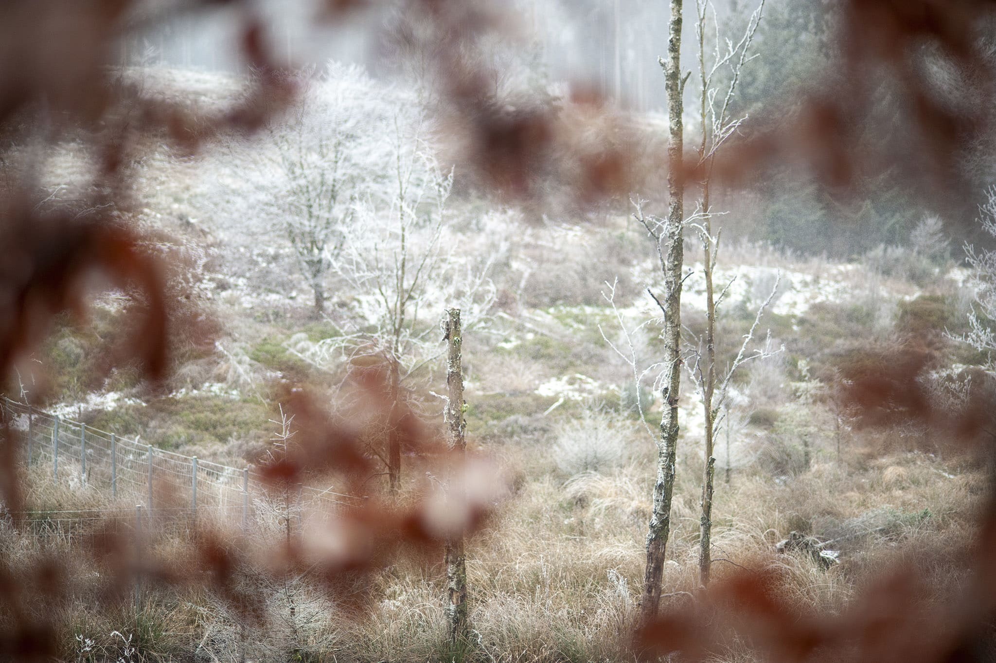 Manhay ligt aan de voet van een van de hoogste toppen van België, de Baraque de Fraiture. ‘s Ochtends vroeg was het plateau nog bedekt met rijp en ijs.