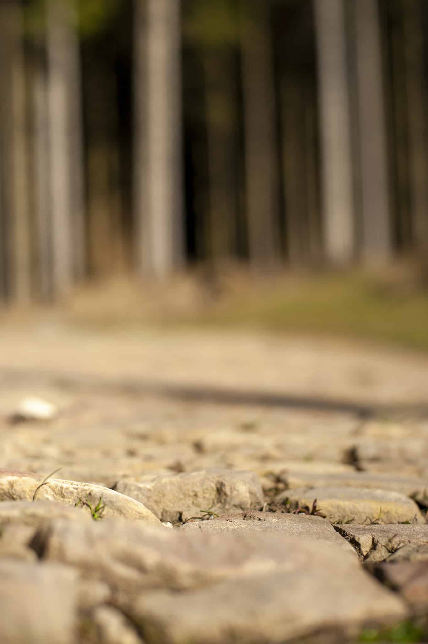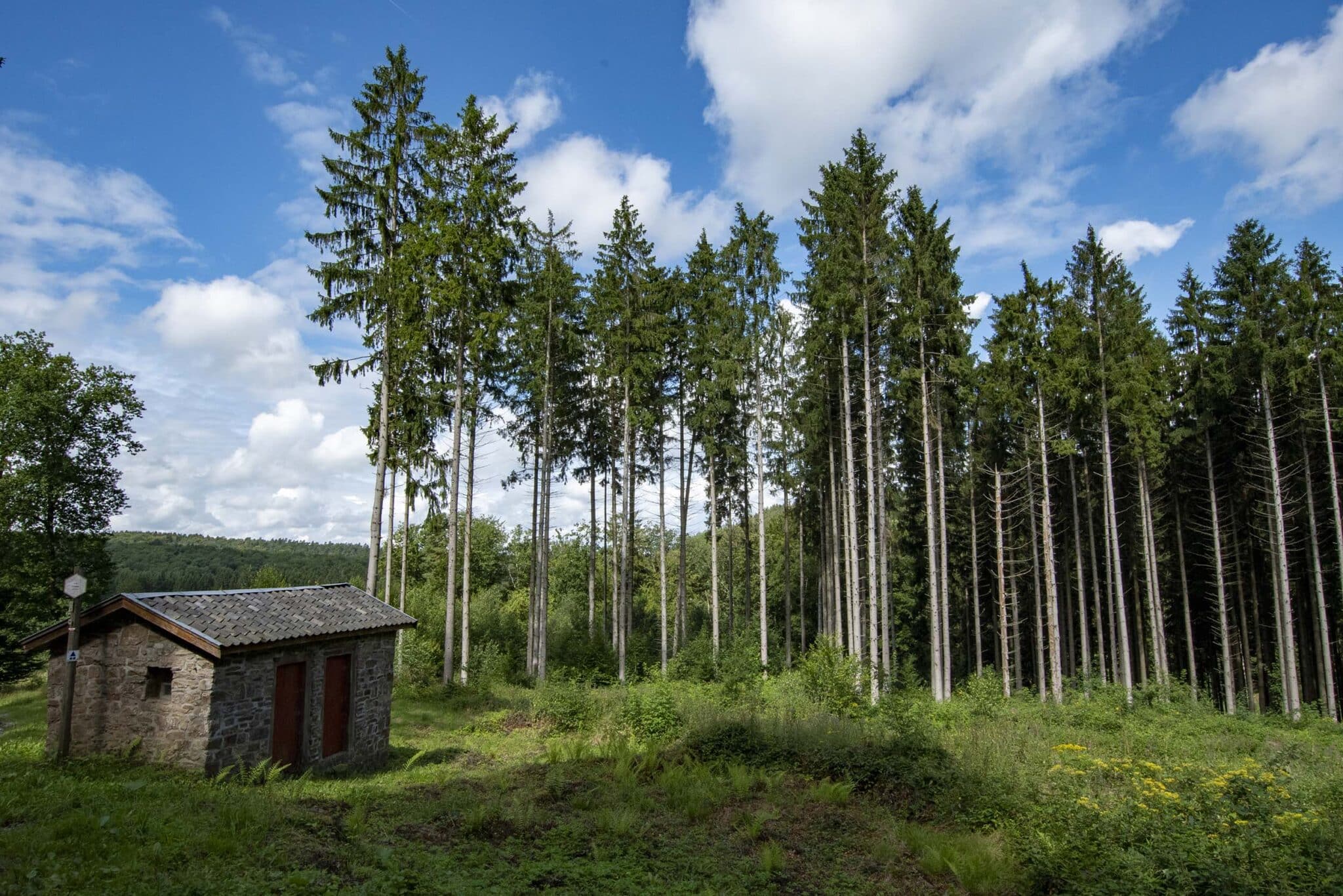 De route voert steeds dieper het bos in, waar een herbouwd huisje opduikt, een vreemde eend in de bijt in dit boslandschap. Aan onze voeten heeft het kunstmatige sparrenbos de kasseien van een oude straat bedekt.