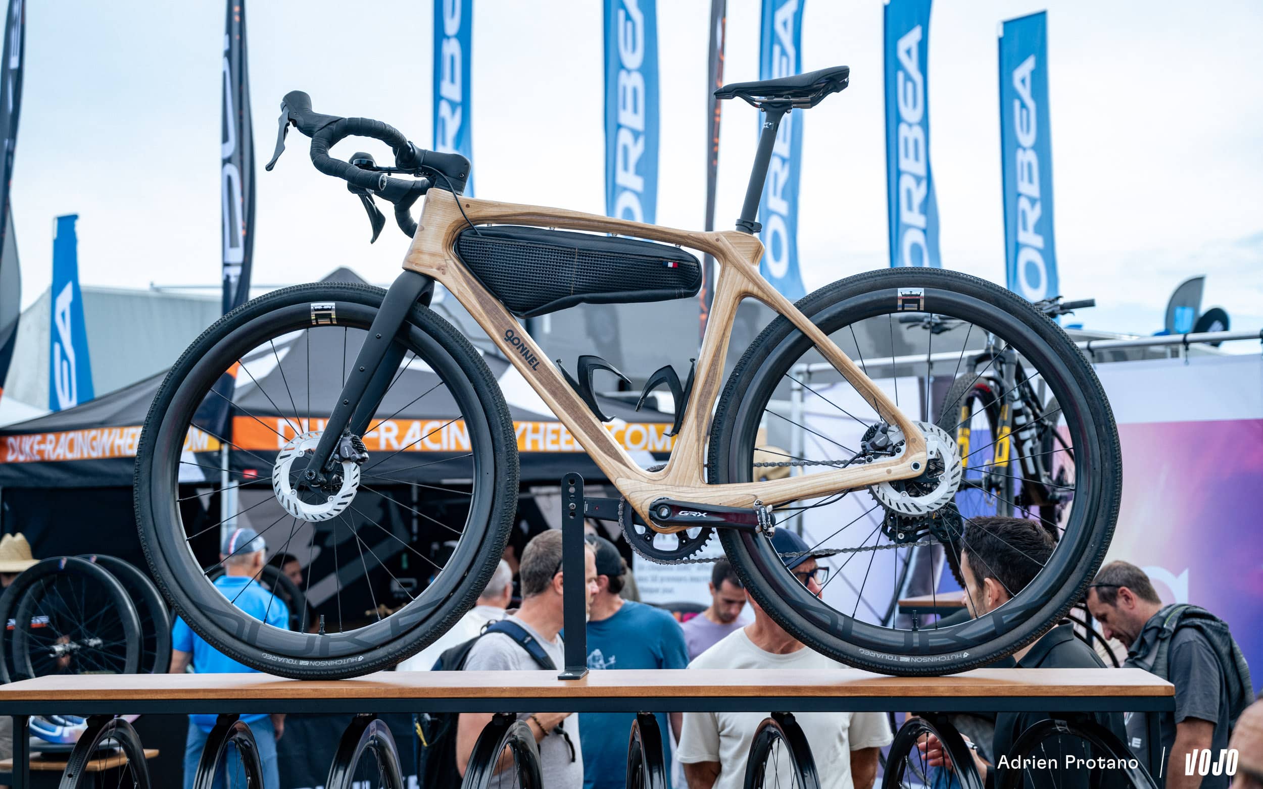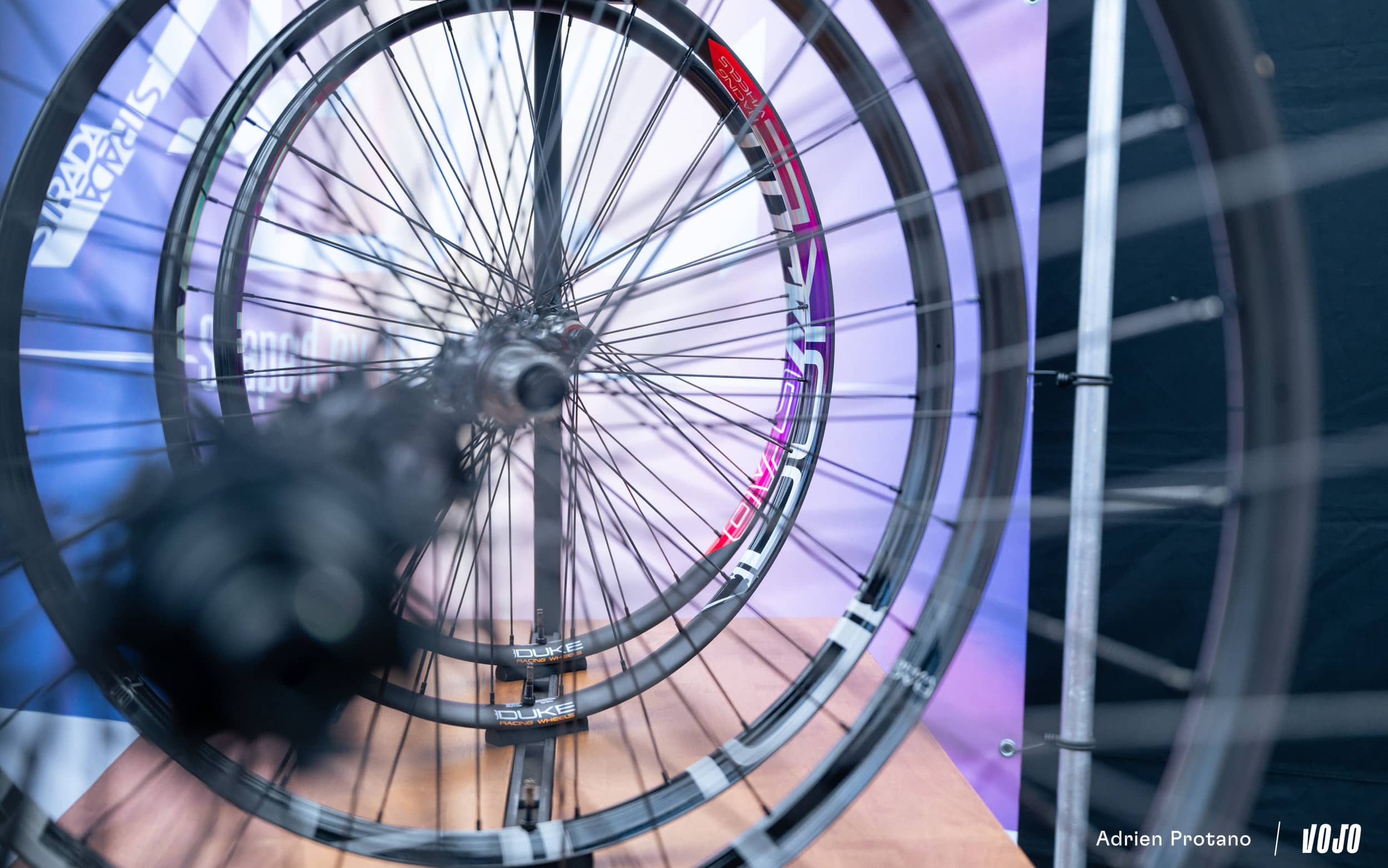 Onder deze merkwaardige houten fiets staan een paar Aero-gravelwielen die we eerder dit jaar getest hebben: Test | Duke Baccara WRX Aero 42 SLR2: gravelwielen met een andere visie op aero.