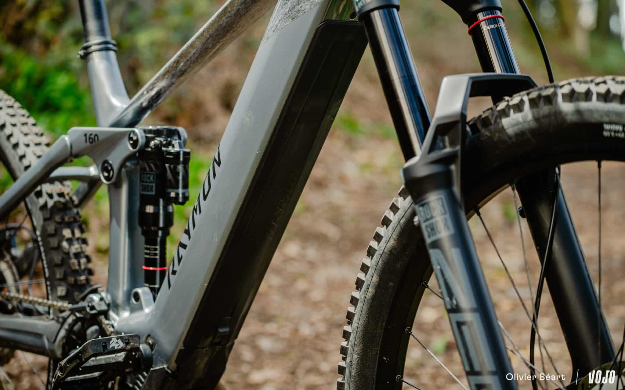 Voor de motor koos men met de Bosch Performance CX voor een referentie. Hij wordt gecombineerd met de grootste beschikbare batterij (800 Wh). We kennen het volume van dit type batterij, die een vrij imposante onderbuis vereist. Dit maakt het ontwerp van de fiets wat zwaarder, al heeft Raymon de slankheid van de overige buizen goed uitgewerkt om een harmonieuze lijn te behouden. De batterij is uitneembaar, zodat je deze ook los van de fiets kunt opladen.
