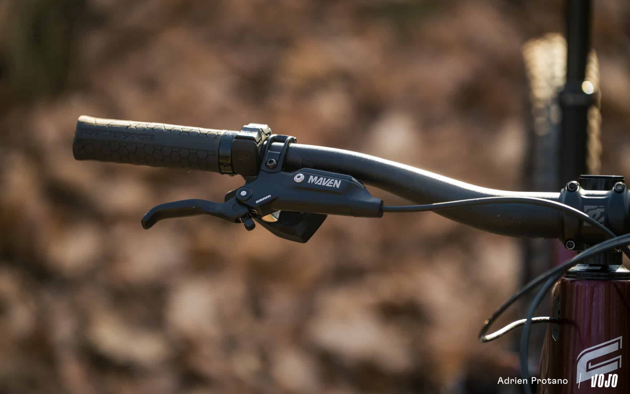 Afstoppen doet de fiets met Sram Maven Base-remmen met zowel vooraan als achteraan remschijven van 200 mm. Een configuratie die duidelijk is afgestemd op het gewicht en de prestaties van de fiets.