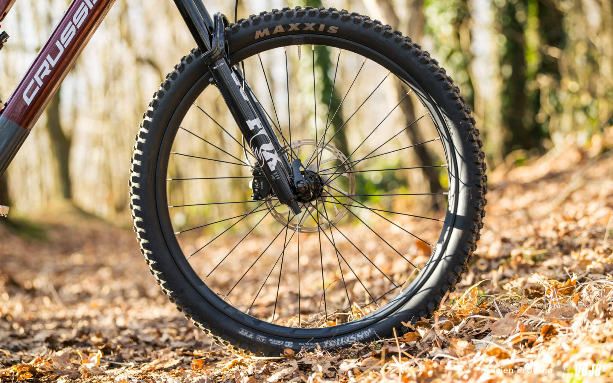 Wat de wielen betreft, kiest Crussis voor een pragmatische aanpak: dubbelwandige aluminium 29 inch velgen met een interne breedte van 30 mm, gemonteerd op eigen Boost-naven (15×110 mm / 12×148 mm). De banden volgen hetzelfde principe, met een Maxxis Assegai 29×2.50 aan de voorzijde en een Minion DHR II 29×2.50 aan de achterzijde. Helaas zullen we op de trails merken dat dit een zwak punt is van deze fiets.