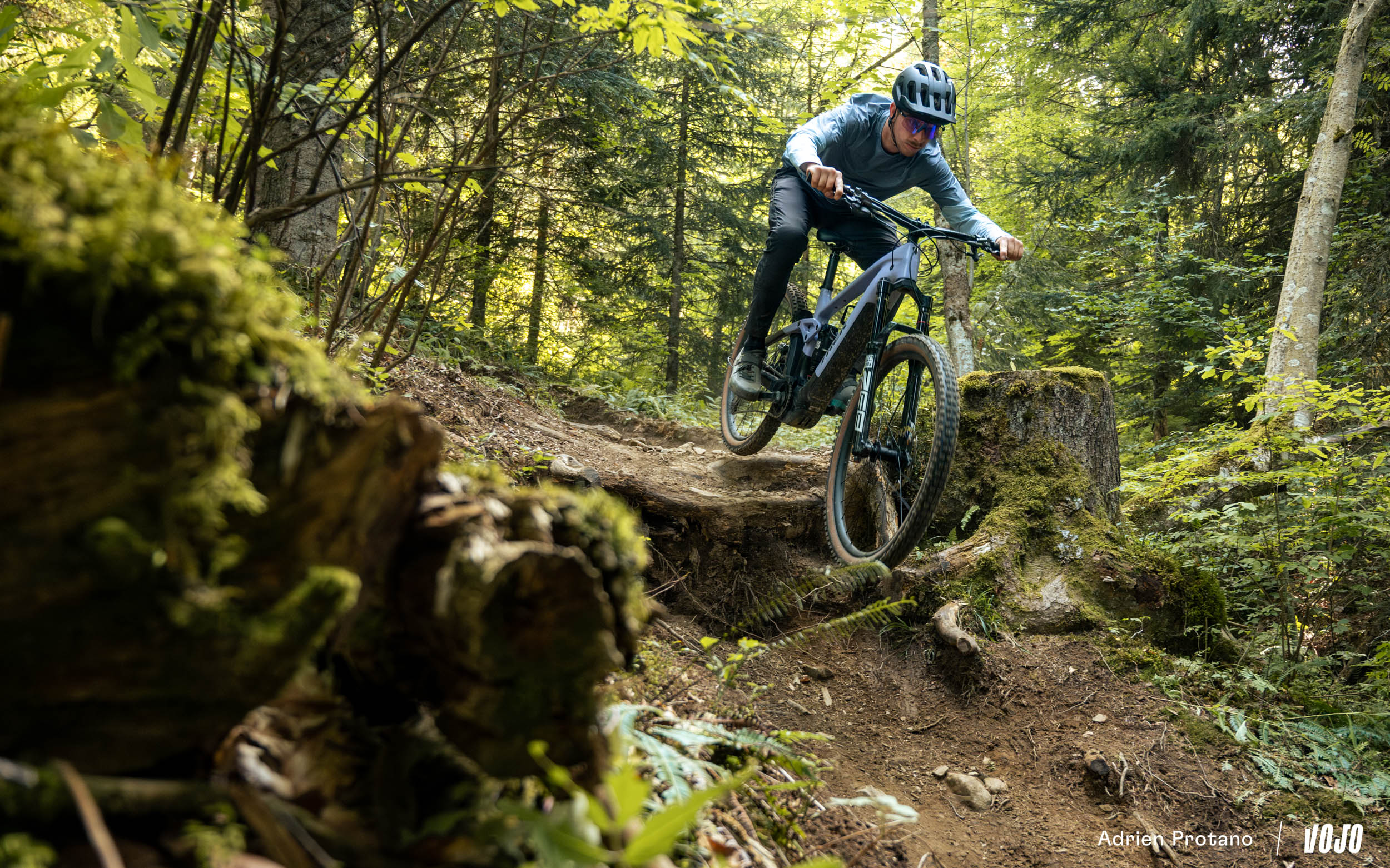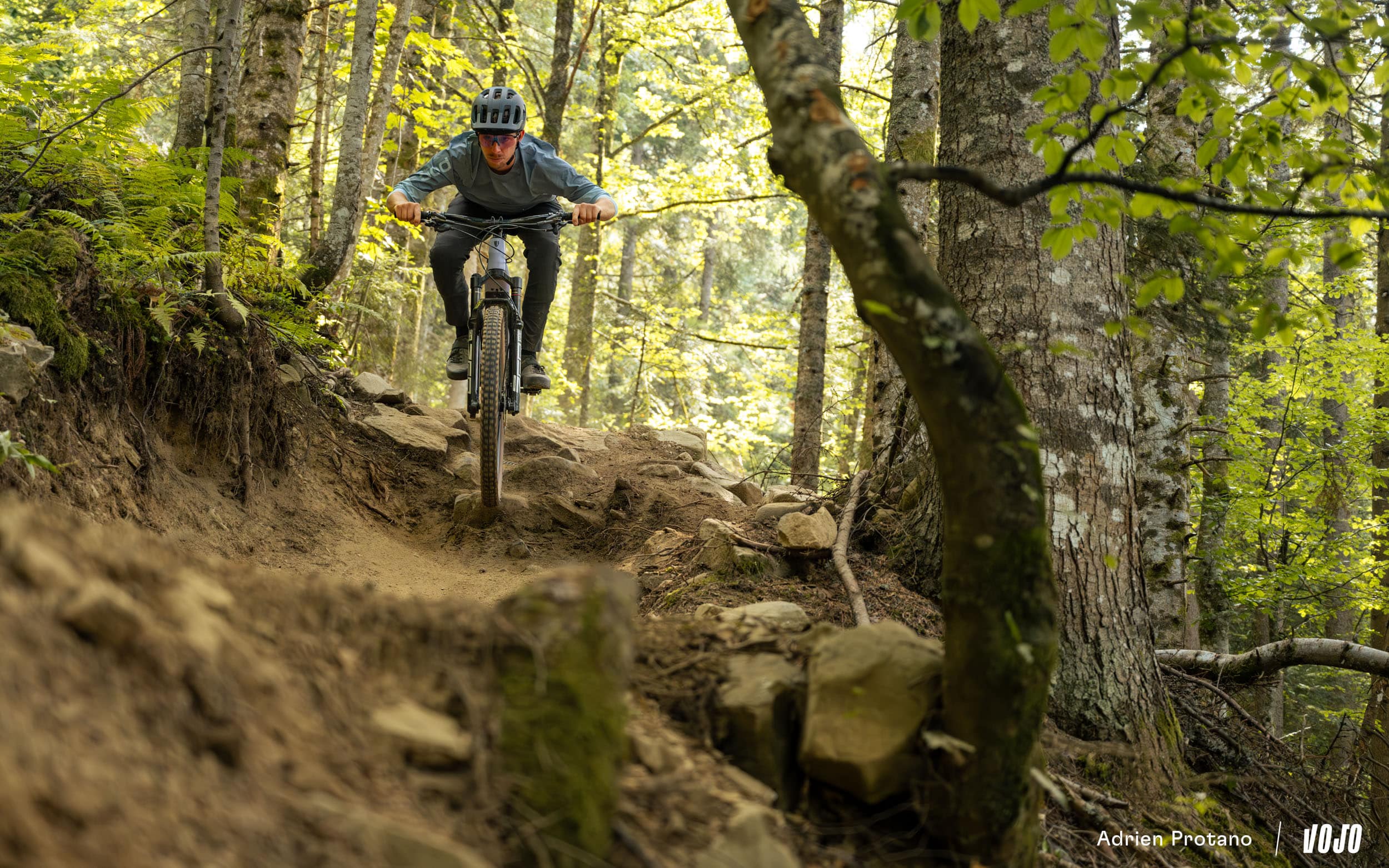 Het nadeel is dat de fiets zijn plafond bereikt vanaf een bepaald niveau van betrokkenheid. Wanneer de snelheid echt toeneemt en de reeks impacts elkaar opvolgen, heb je minder vertrouwen dan op een fiets die speciaal is bedoeld voor enduro. De te ‘brave’ banden, een zeer stijve cockpit en een stevige vering maken de fiets behoorlijk veeleisend wanneer het tempo toeneemt, zelfs met de veerweg in de lineaire positie. Hij kent echter geen onaangename verrassingen en blijft gemakkelijk te begrijpen.