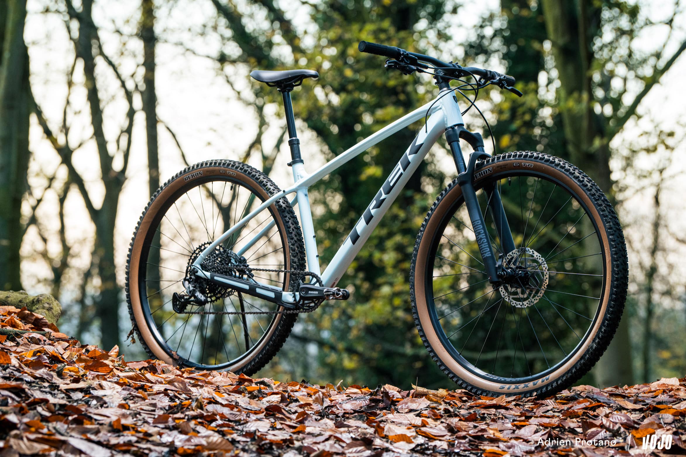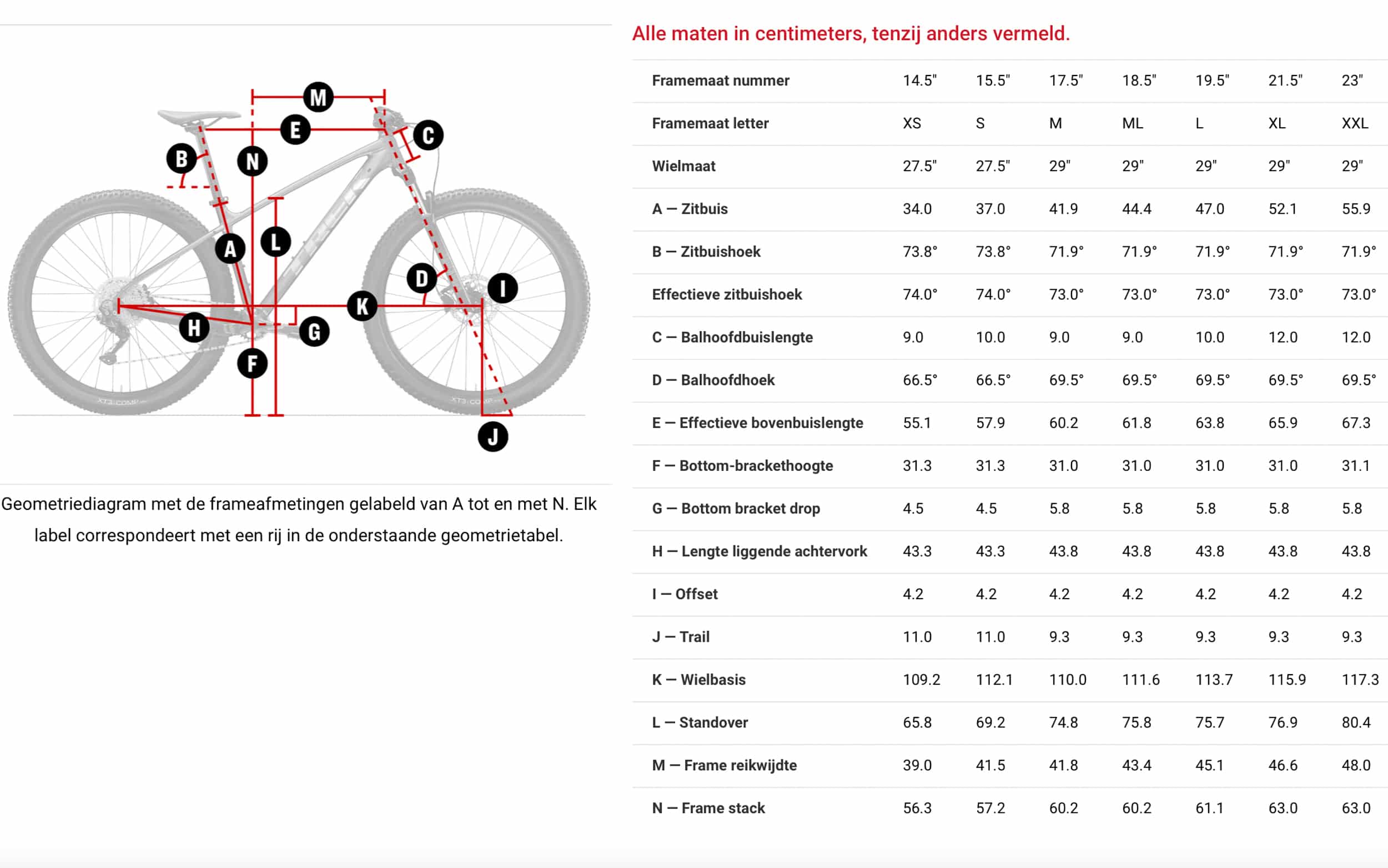 Het frame is verkrijgbaar in zeven maten van XS tot XXL, inclusief de ML-maat die we bij andere nieuwe modellen uit de Trek-familie alweer uit de catalogus zien verdwijnen. De twee kleinste maten zijn uitgerust met 27,5 inch wielen en een knik in de bovenbuis, de andere fietsen allen met 29 inch wielen.