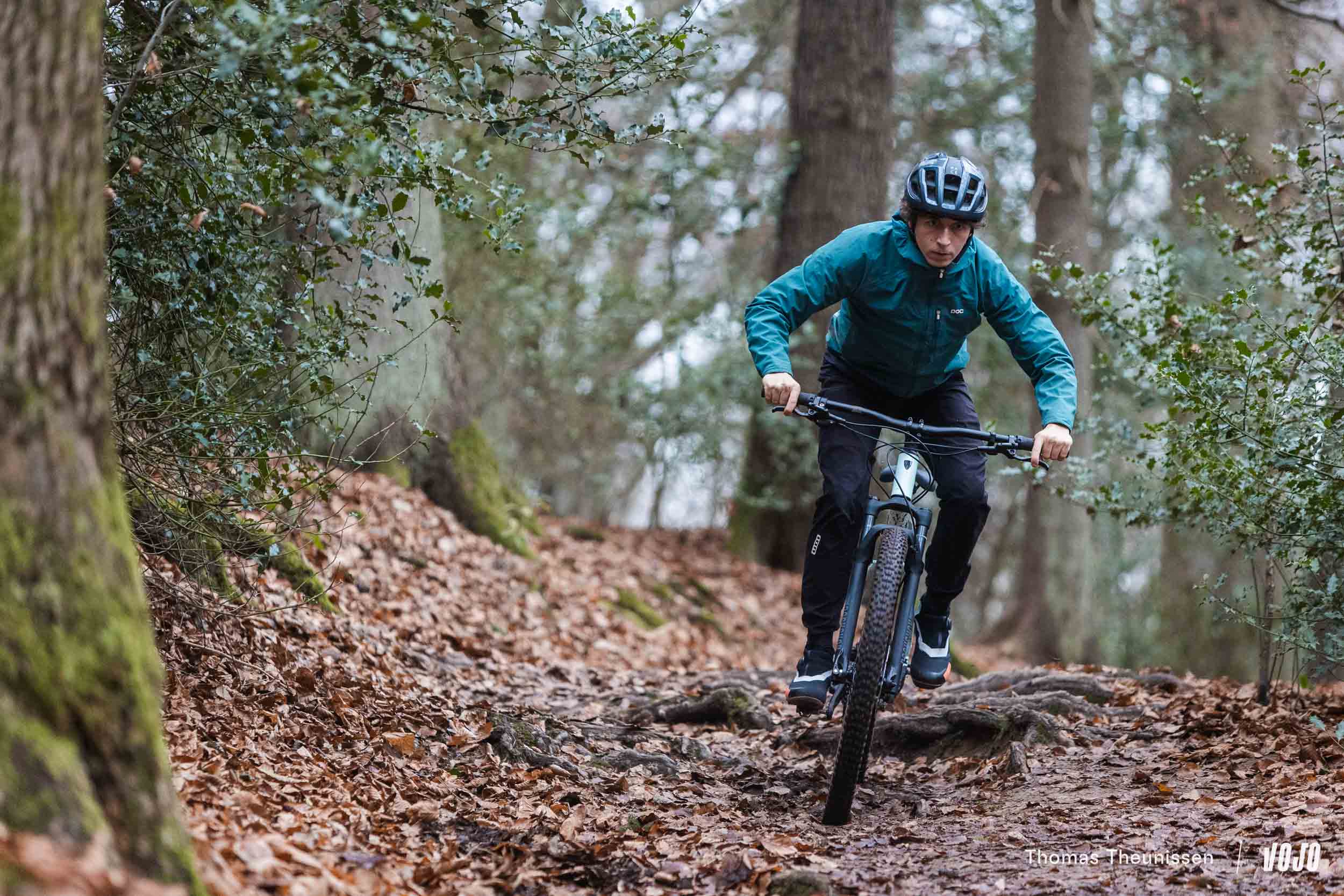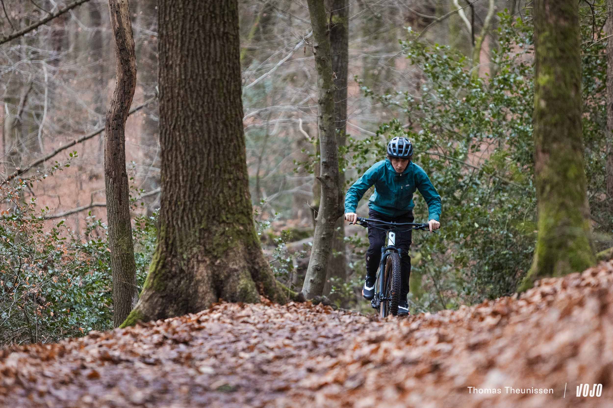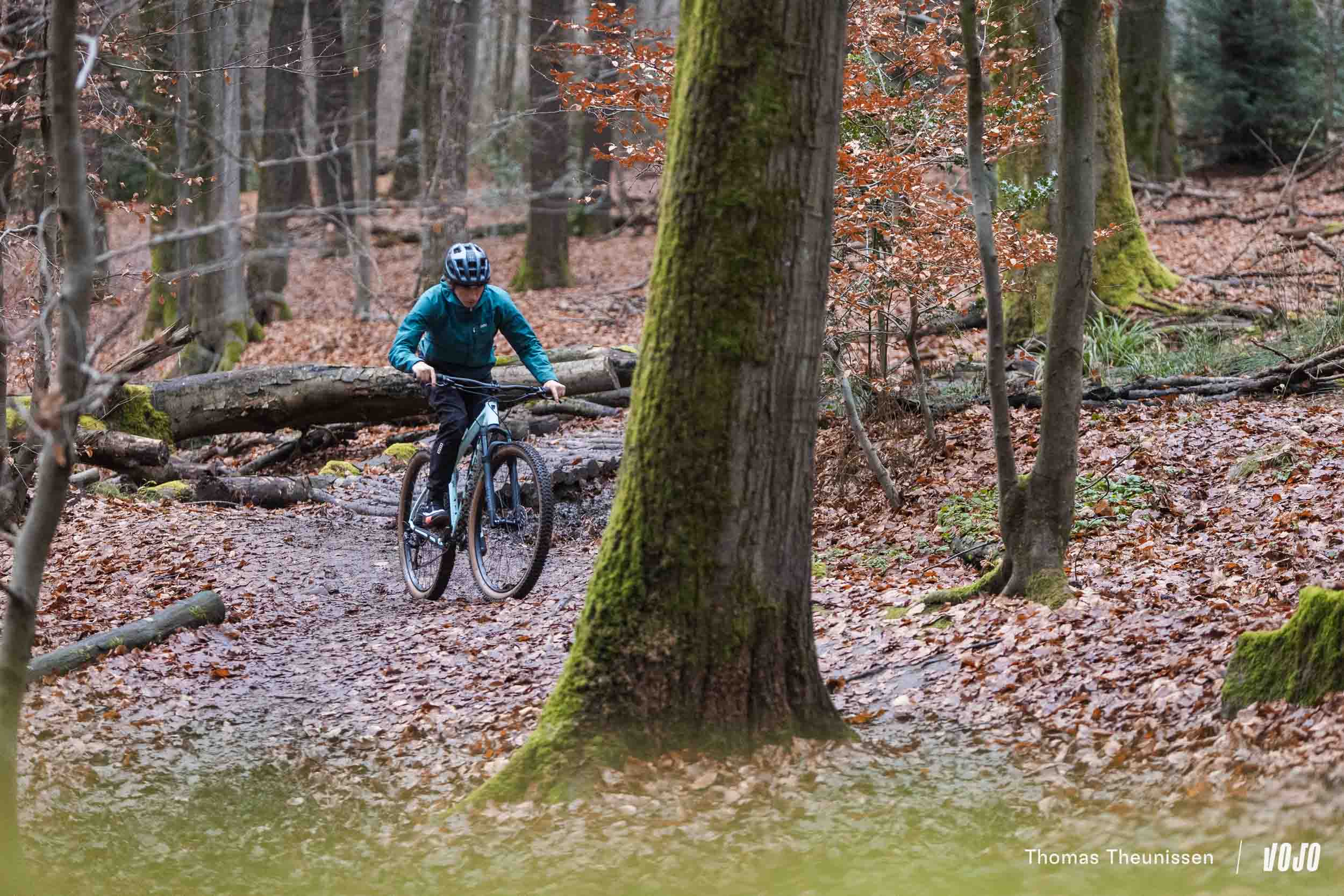 In afdalingen kun je, wanneer de paden niet te ruw zijn, echt losgaan. Met een kettingblad van 30 tanden kom je al snel in een agressievere rijpositie terecht om er een paar extra km/u uit te persen. Hiervoor kun je de dropper zadelpen gebruiken. De besturing is ook goed. De fiets helt gemakkelijk van links naar rechts en blijft stabiel, zelfs in krappe haarspeldbochten. Wanneer de afdaling ruwer wordt (rotsen, wortels, drops, etc.) of speelser (sprongen, bermen, etc.), schittert de fiets echt. In tegenstelling tot vlak terrein met hetzelfde type ondergrond, waar de fiets helemaal niet speels was, kun je hier echt genieten, maar alleen onder twee voorwaarden: met de zadelpen naar beneden en het kunnen bereiken van optimale snelheden.