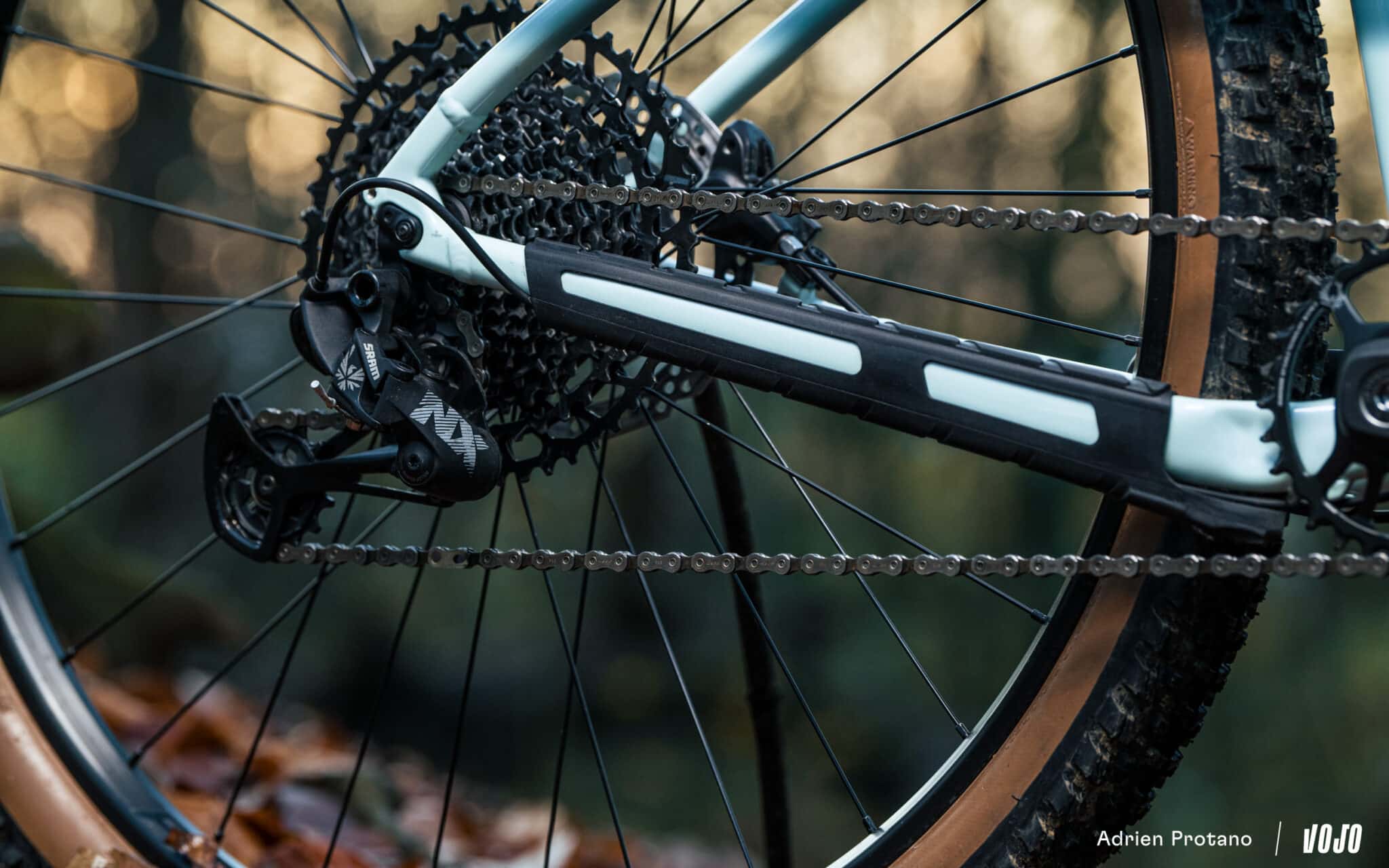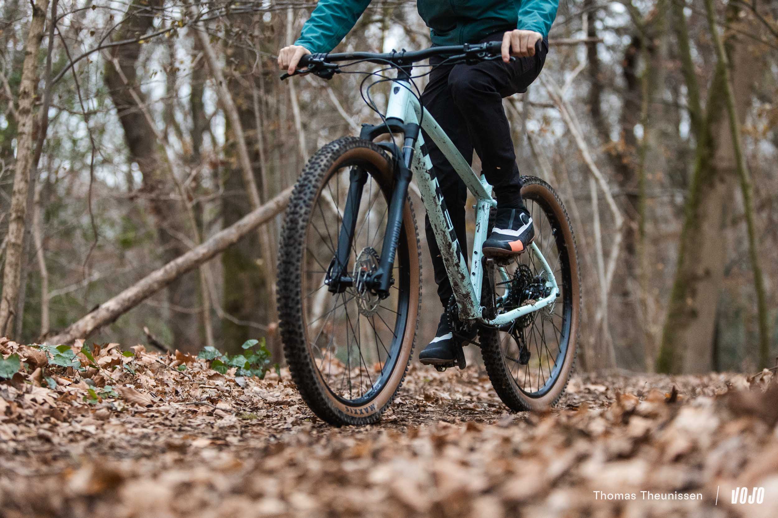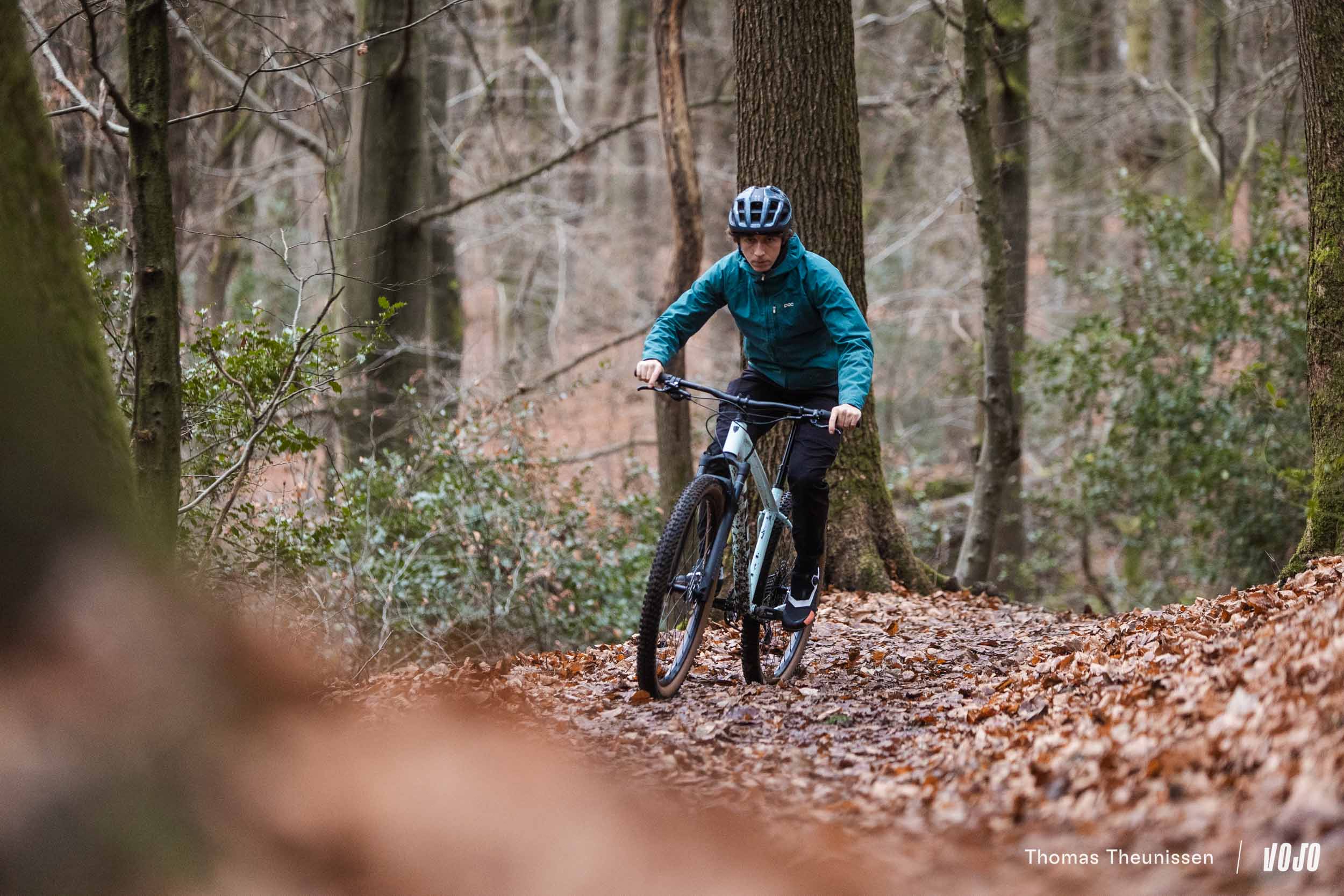 In afdalingen kun je, wanneer de paden niet te ruw zijn, echt losgaan. Met een kettingblad van 30 tanden kom je al snel in een agressievere rijpositie terecht om er een paar extra km/u uit te persen. Hiervoor kun je de dropper zadelpen gebruiken. De besturing is ook goed. De fiets helt gemakkelijk van links naar rechts en blijft stabiel, zelfs in krappe haarspeldbochten. Wanneer de afdaling ruwer wordt (rotsen, wortels, drops, etc.) of speelser (sprongen, bermen, etc.), schittert de fiets echt. In tegenstelling tot vlak terrein met hetzelfde type ondergrond, waar de fiets helemaal niet speels was, kun je hier echt genieten, maar alleen onder twee voorwaarden: met de zadelpen naar beneden en het kunnen bereiken van optimale snelheden.