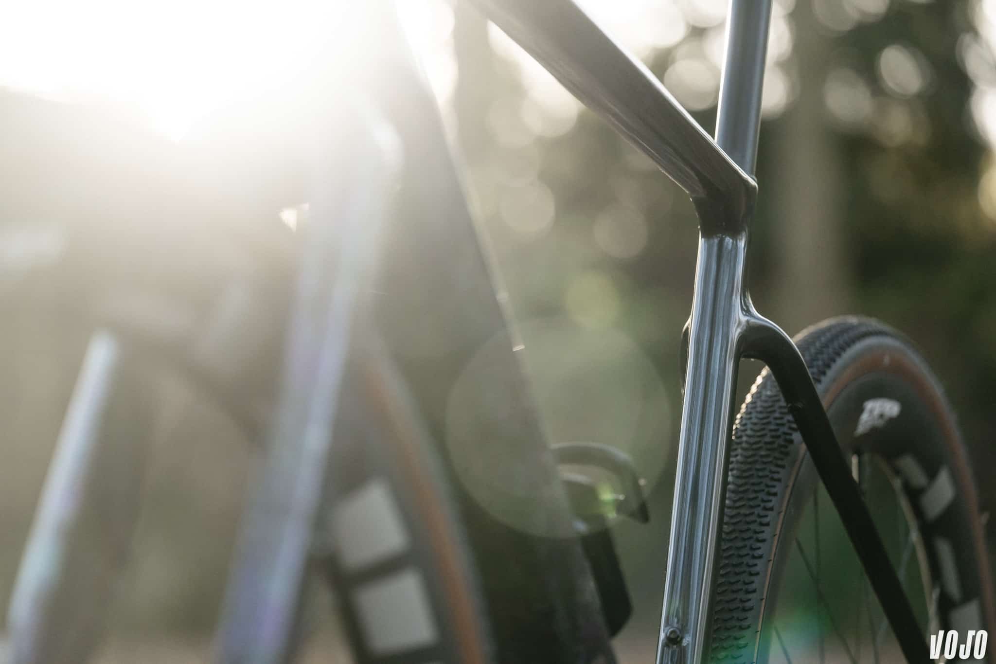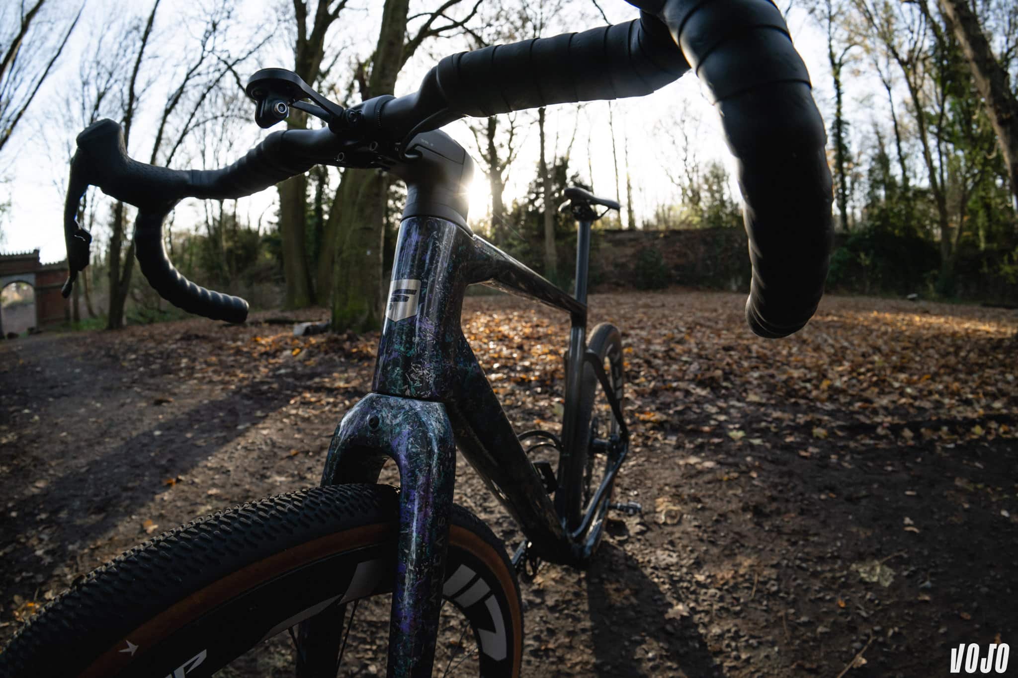 Nog voordat we het frame bespreken, ontdekken we dus een wielset die de kwaliteiten van een ‘snelle’ gravelbike combineert met die van een comfortabelere en veelzijdigere fiets. Het frame en de vork voelen robuust aan. De kracht wordt zeer efficiënt overgebracht en je geniet van hard trappen zonder dat je inspanningen verloren gaan door een te vergevingsgezind frame of overschaduwd worden door een te stijf frame. De geometrie vermijdt een te korte of schokkerige achterdriehoek, die je soms in de problemen zou kunnen brengen tijdens acceleraties of offroad rijden, zoals het geval is bij sommige racegerichte gravelbikes.