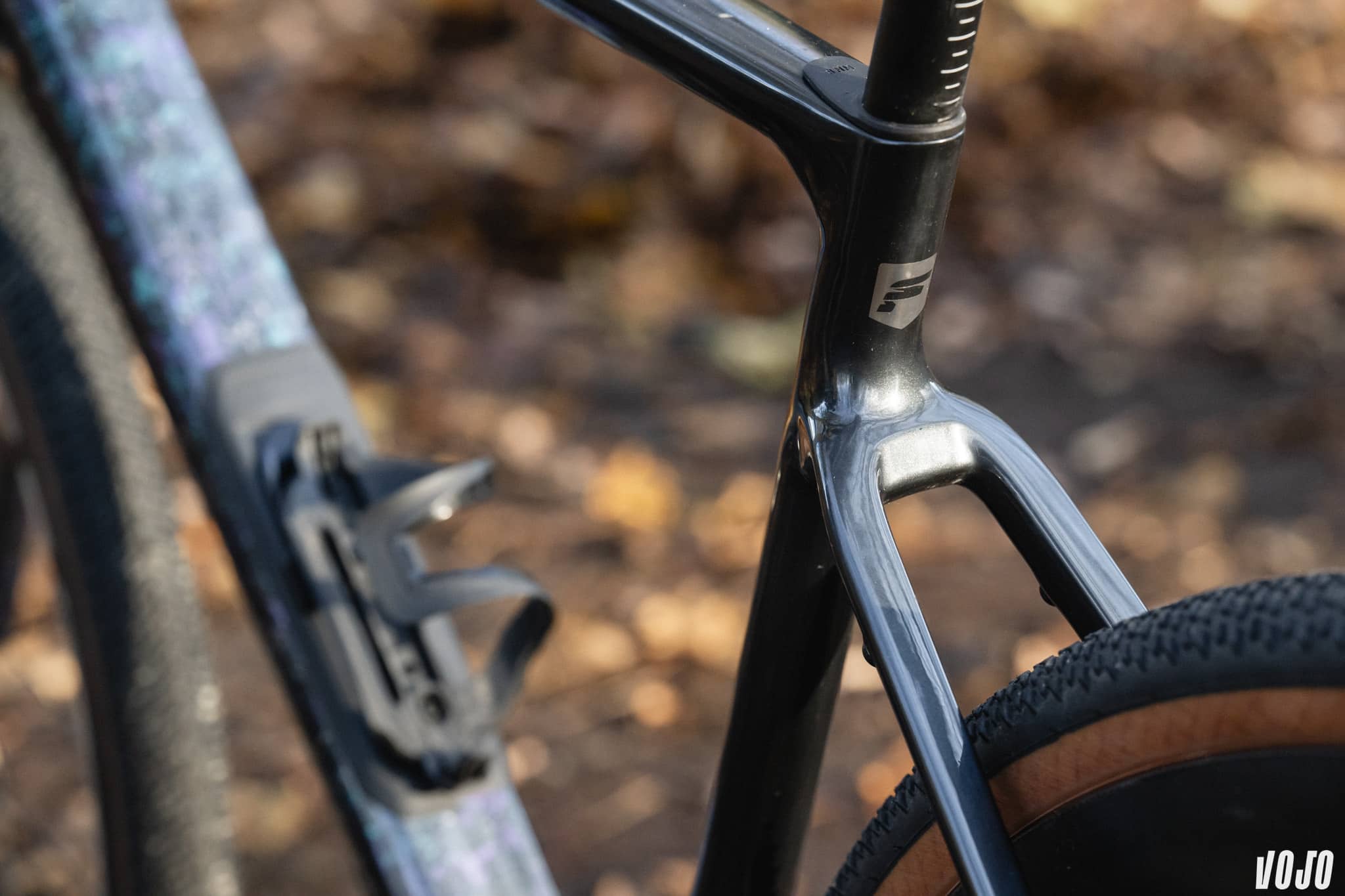 Ook op deze gravelbike vinden we een reeks bevestigingspunten aan de zijkanten van de voorvork en in het frame.
