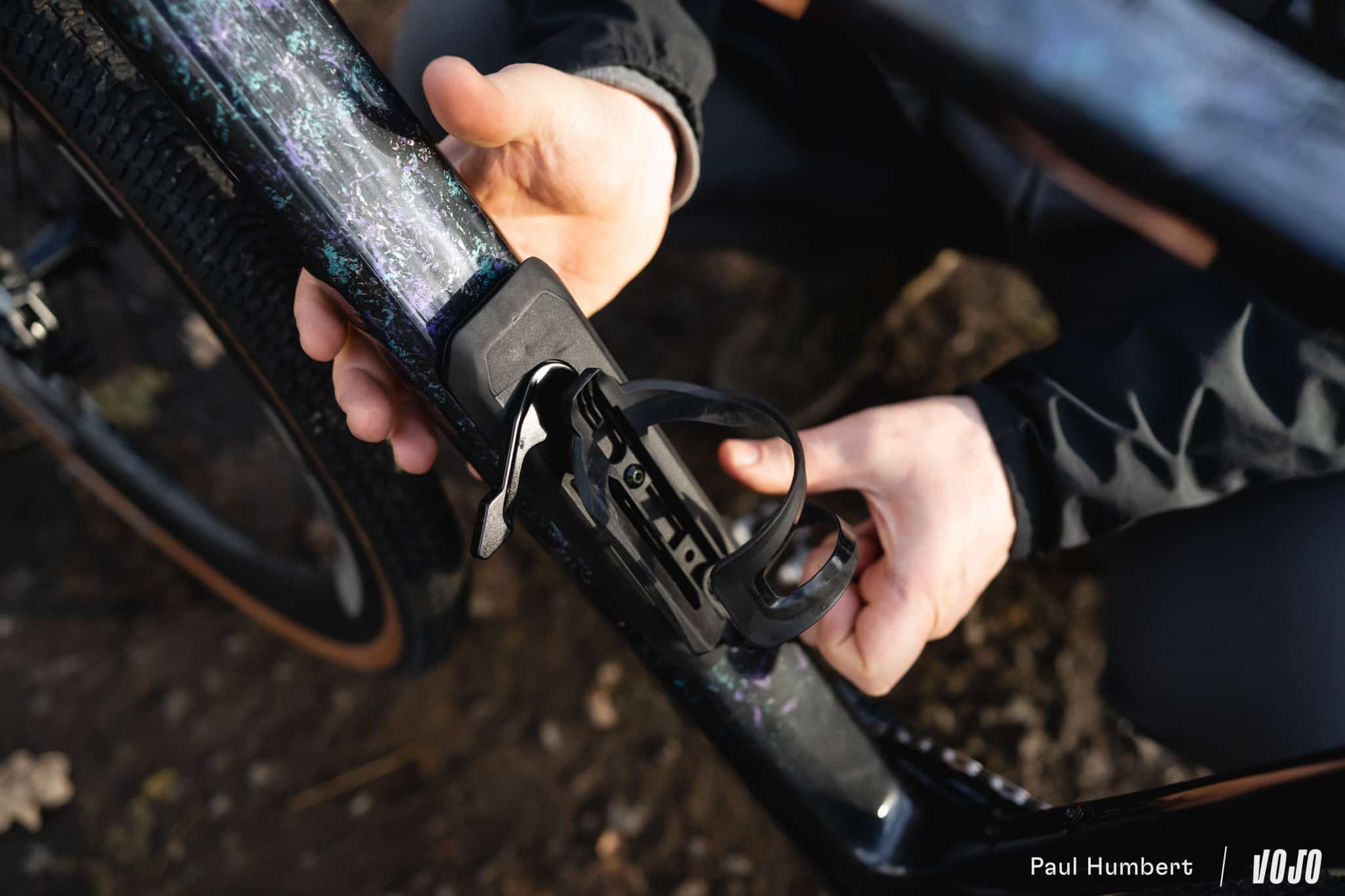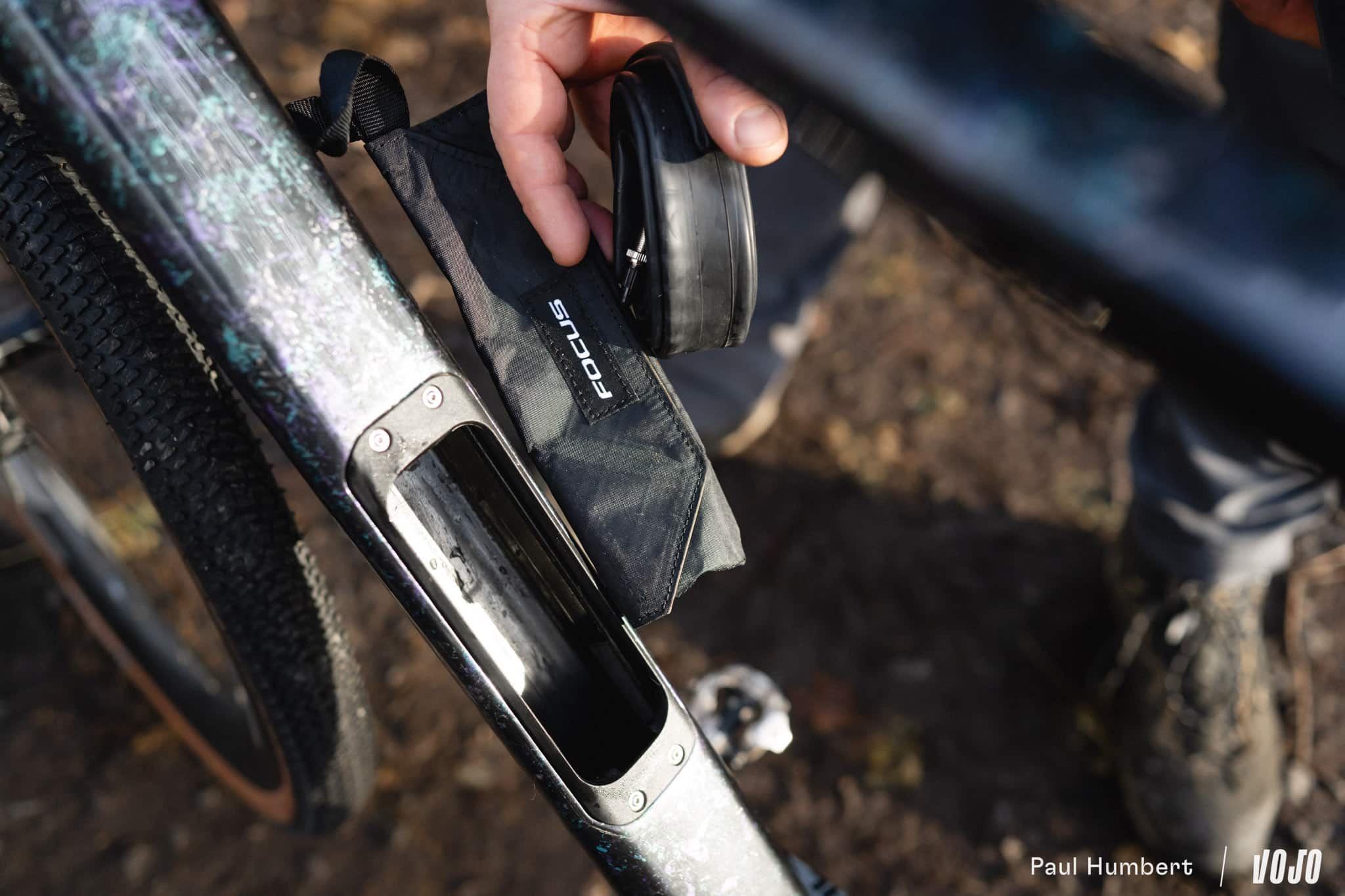 Het grote opbergvak in de onderbuis biedt ruimte aan twee tasjes voor reparatiemateriaal (gereedschap, binnenband, CO2-patroon, bandenlichters, enz.). Het merk geeft aan dat de klep gemakkelijk sluit en stevig op zijn plaats blijft.