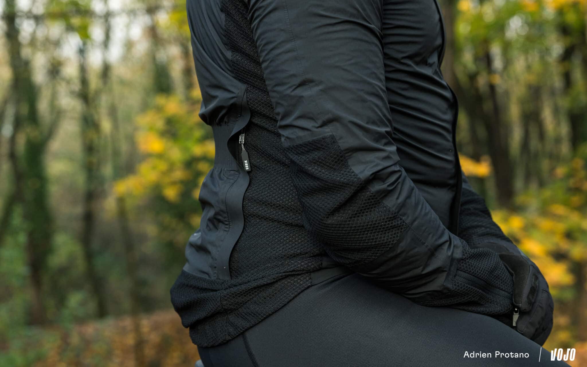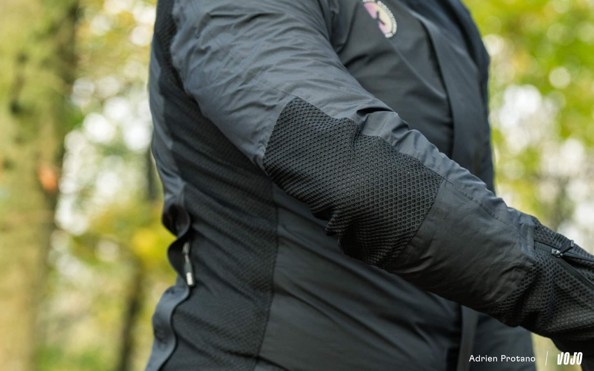 Bij de polsen, oksels en onderrug van de jack werd een mesh gebruikt om de vochtafvoer in deze gevoeligere en/of minder blootgestelde gebieden te maximaliseren. Deze mesh zorgt ook voor een versteviging bij de ellebogen.