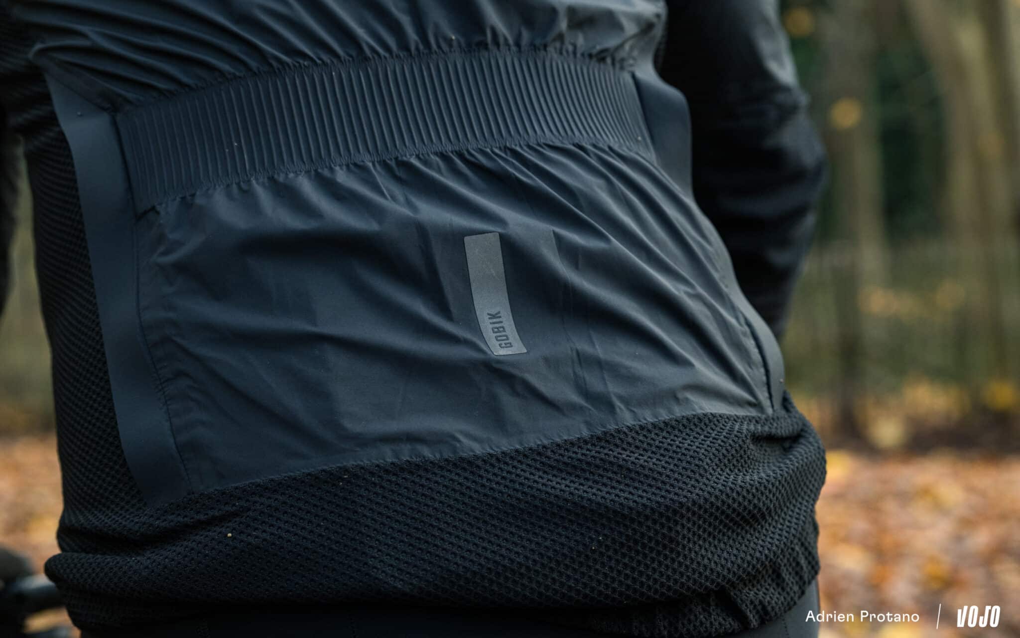Wanneer je de fietsjas staand aantrekt, lijkt de vorm misschien wat ongewoon: op sommige plekken strak en op andere juist iets te los. Maar de reden is heel simpel: het jack is ontworpen en gesneden om perfect te passen op de fiets. En inderdaad, dit wordt bevestigd op de trail: tijdens het fietsen blijft de Gobik Superarmour nauwsluitend en flappert hij helemaal niet, waardoor je bewegingen tijdens het fietsen nooit worden belemmerd.