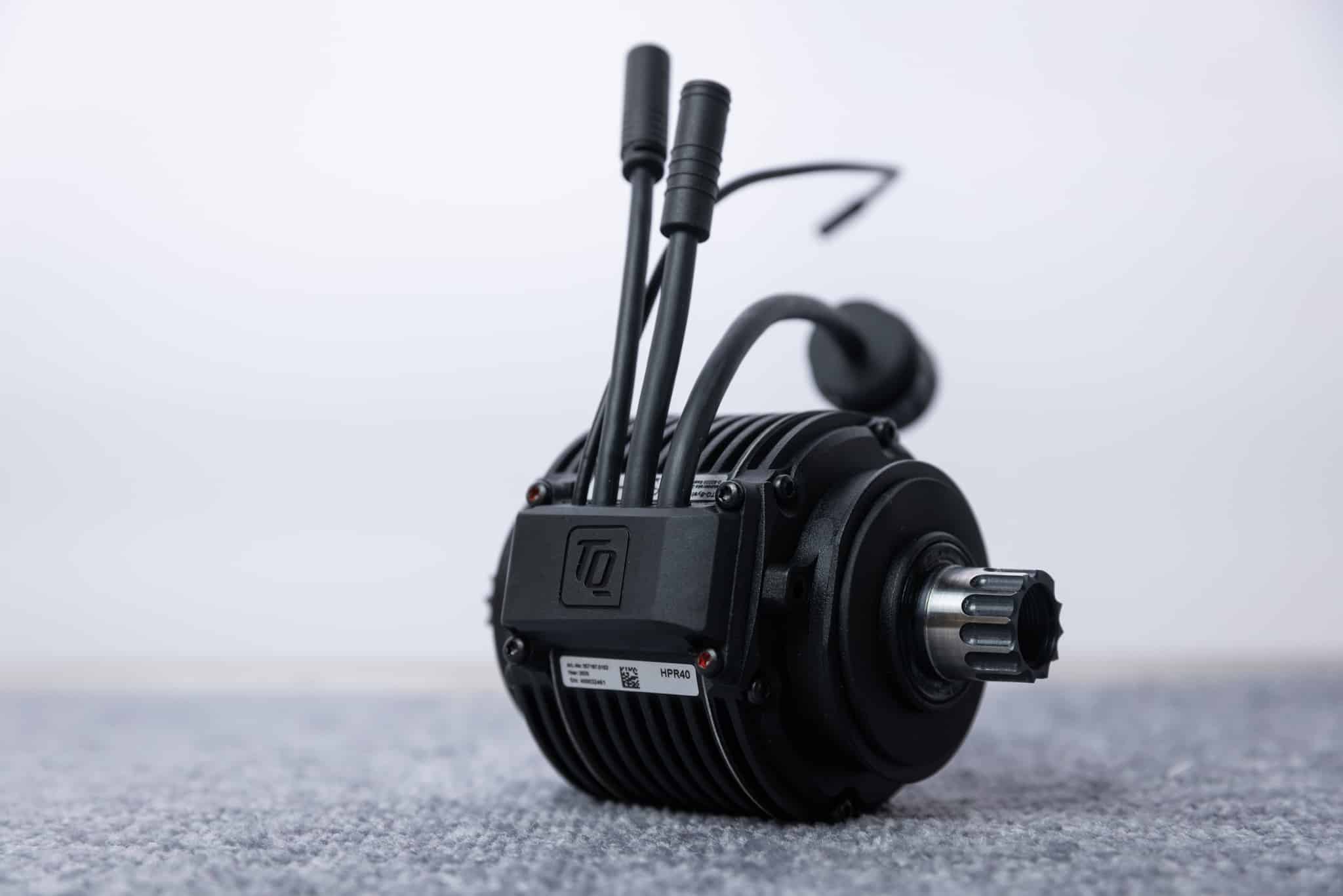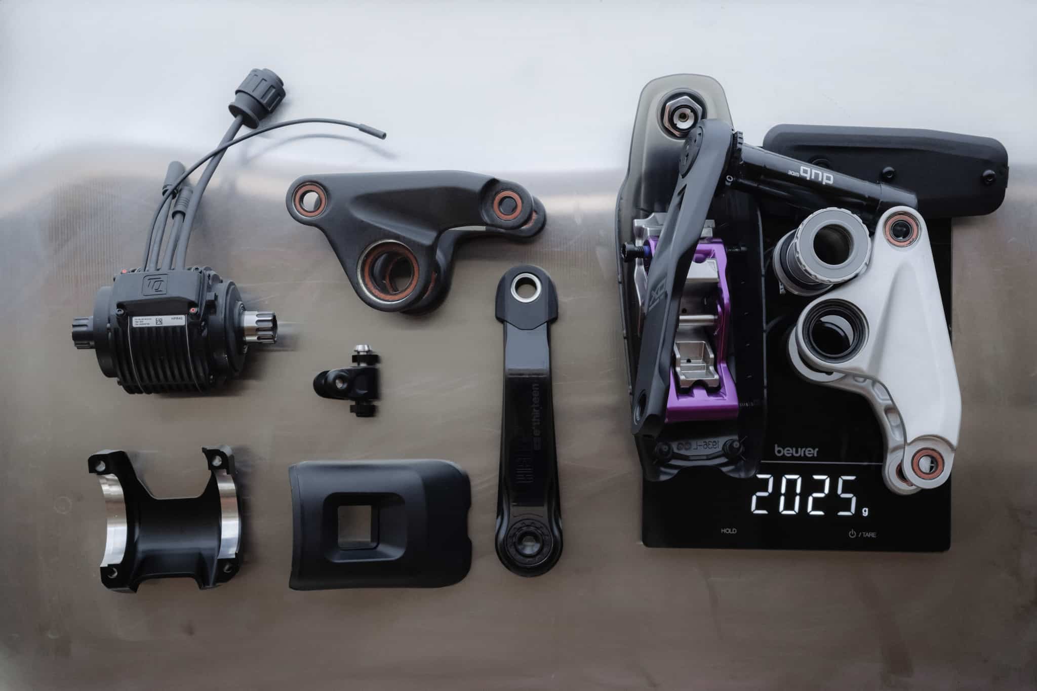 Dit is de eerste keer dat de TQ HPR 40-motor buiten het wegwielrennen in beeld verschijnt. Met 200W vermogen en 40Nm koppel is hij niet krachtig genoeg om echte elektrische ondersteuning te bieden voor een e-MTB. Maar dat was ook niet de bedoeling. Hij heeft echter één onmiskenbaar voordeel: hij weegt slechts 1170 gram voor de complete motor- en batterij-unit.