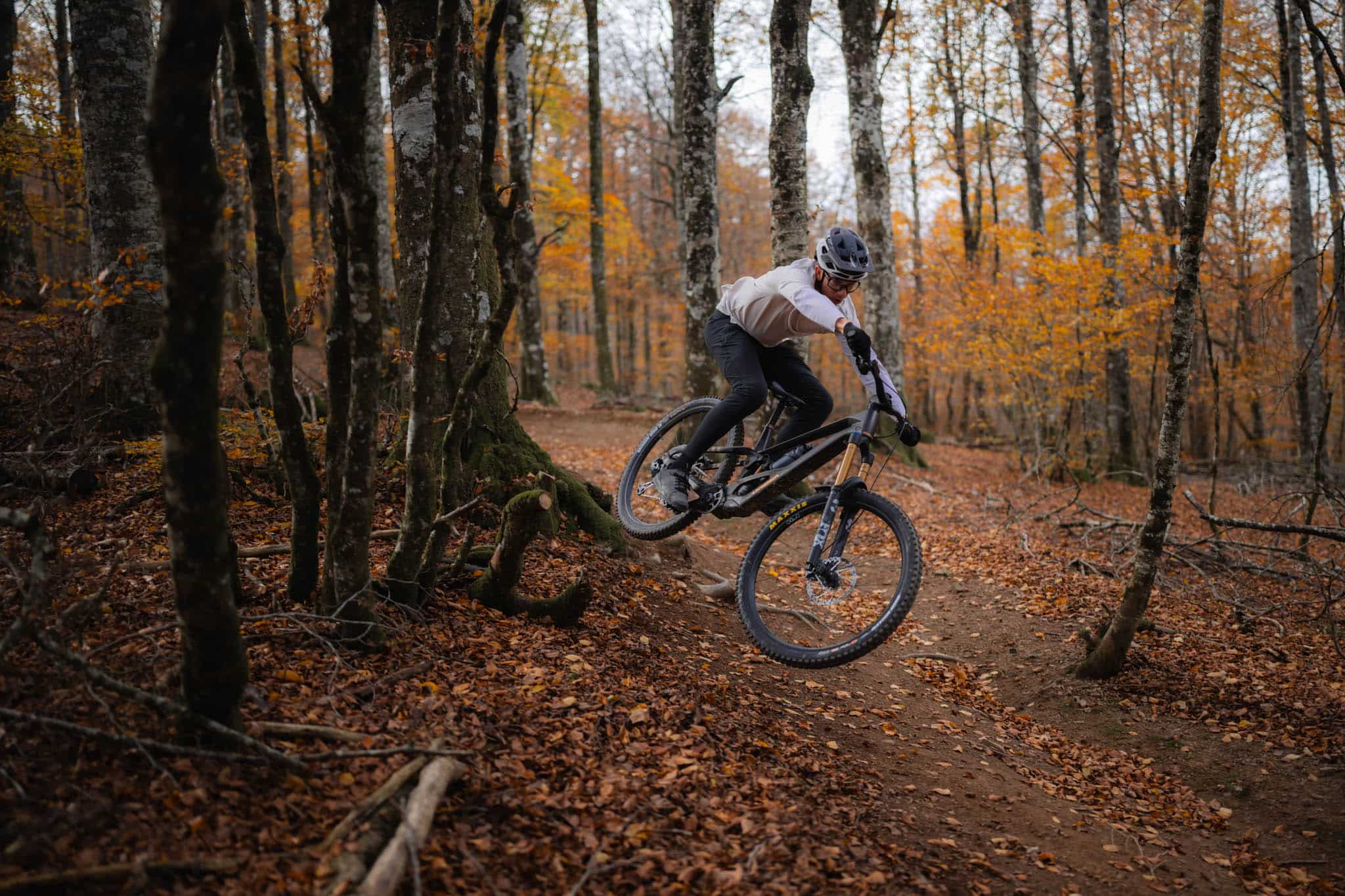 Dankzij de lockout (handmatig of elektronisch) kun je tijdens het trappen een constant tempo aanhouden, maar steilere of technischere stukken zorgen er al snel voor dat je het lijden wilt afbreken. Toch weet je, als je op een fiets met 170/180 mm veerweg stapt, waar je aan begint. Met dat in gedachten arriveerden we samen met vier andere journalisten in de regio waar Orbea gevestigd is om gedurende drie fietsdagen de Rallon RS te ontdekken, waarvan de geheimen goed bewaard waren gebleven. We ontdekten deze fiets in het trailcentrum van het Baskische Eremua. Vanaf de eerste paar pedaalslagen merkten we overeenkomsten: een grote fiets die toewijding vereist, maar die vreemd genoeg iets ‘levendiger’ en speelser aanvoelt dan de traditionele Rallon. Die laatste is stabieler, met een zwaartepunt onder de trapas. Hier is het DNA hetzelfde, maar iets minder uitgesproken. De batterij beïnvloedt de balans enigszins. Je hebt echter nooit het gevoel dat je op een e-MTB rijdt en het idee dat het gewicht je ‘meesleurt’ is geen probleem meer. Je rijdt hier op een endurofiets, punt uit.