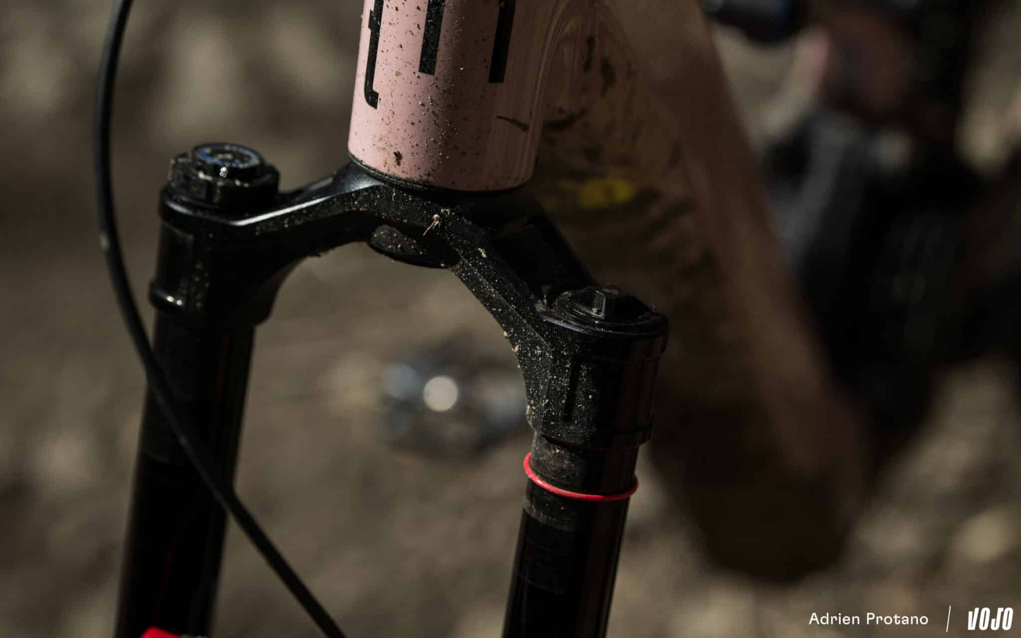 Ter herinnering: de RockShox Lyrik is gebouwd op een lichter en iets minder stijf chassis dan de ZEB. Dit is terug te zien in de 35 mm diameter van de vorkpoten van de Lyrik, vergeleken met 38 mm bij zijn grotere broer. Ondanks de aanzienlijke aanpassingen aan het chassis blijft dit aspect ongewijzigd.