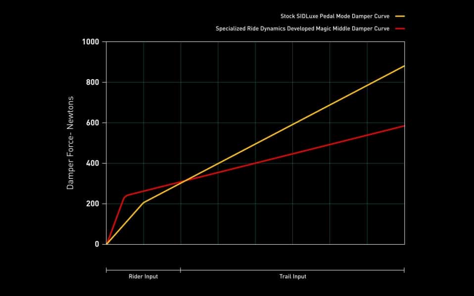 Het is de fameuze tussenstand, gedoopt tot ‘Magic Middle’, die het meeste werk van dit team vertegenwoordigt. Deze stand werd geïntroduceerd op de Epic 8 en is nu aangepast voor deze nieuwe generatie. Ter herinnering: deze tussenpositie is bedoeld om er het grootste deel van de tijd in te rijden. Tijdens beklimmingen, op het vlakke (zelfs als het reliëf wat grillig is) en in afdalingen met een redelijk perfecte ondergrond. Het idee is om de open stand alleen te reserveren voor ruwere passages en de volledige blokkering uitsluitend voor sprints. Begrijp hieruit dat de Magic Middle een stand is die stevig aanvoelt bij het trappen en de optimale houding van de fiets behoudt, maar die nog steeds in staat is om gemiddelde en grote schokken op te vangen. Concreet zien we dat de curve een hogere drempelwaarde heeft om in te veren, maar daarna lineairder en vlakker (en dus gevoeliger) is dan de standaardcurve die door RockShox wordt aangeboden.