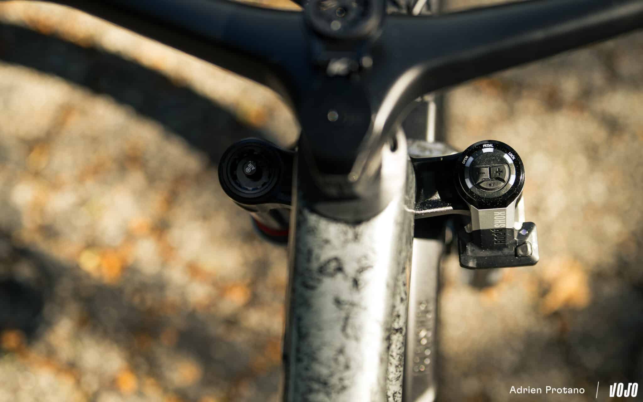 Op het vlakke en bij het klimmen is het rendement verbluffend. Je hebt duidelijk het gevoel op een fiets te rijden die heel dicht in de buurt komt van een hardtail, met een trapas/demper-zone die bijzonder stijf is en de energie uitstekend teruggeeft. De blokkering is extreem stevig wanneer dat nodig is, maar het is vooral de tussenstand die het meeste indruk maakt. Hiermee kun je efficiënt trappen zonder erbij na te denken, terwijl de vering actief blijft zodra het terrein onregelmatig wordt. Het begin van de veerweg is zeer soepel en vlakt kleine schokken goed af, terwijl er een indrukwekkende ondersteuning wordt geboden wanneer de impact groter wordt … Kortom, een ideaal platform dat efficiënt werkt bij het trappen.