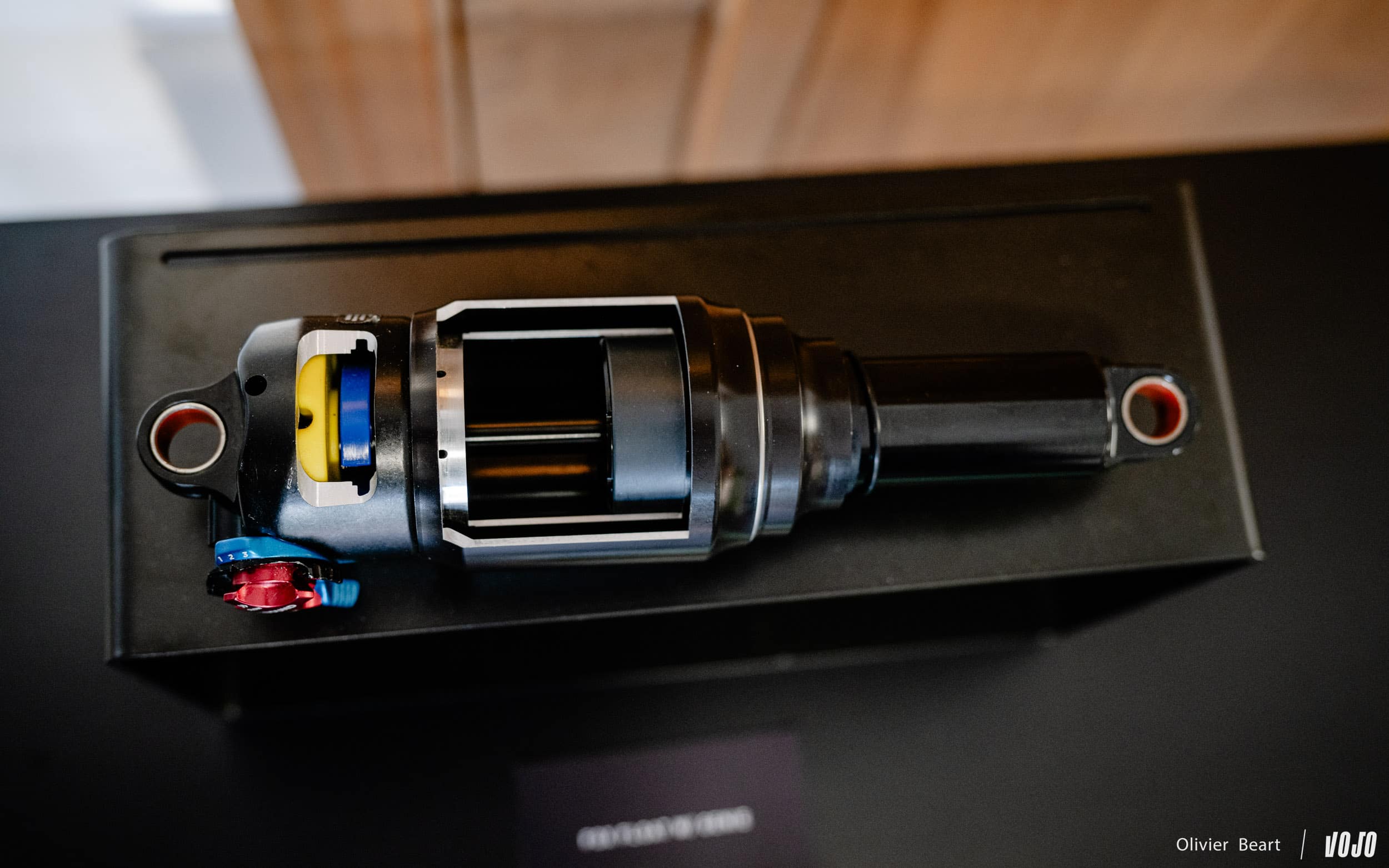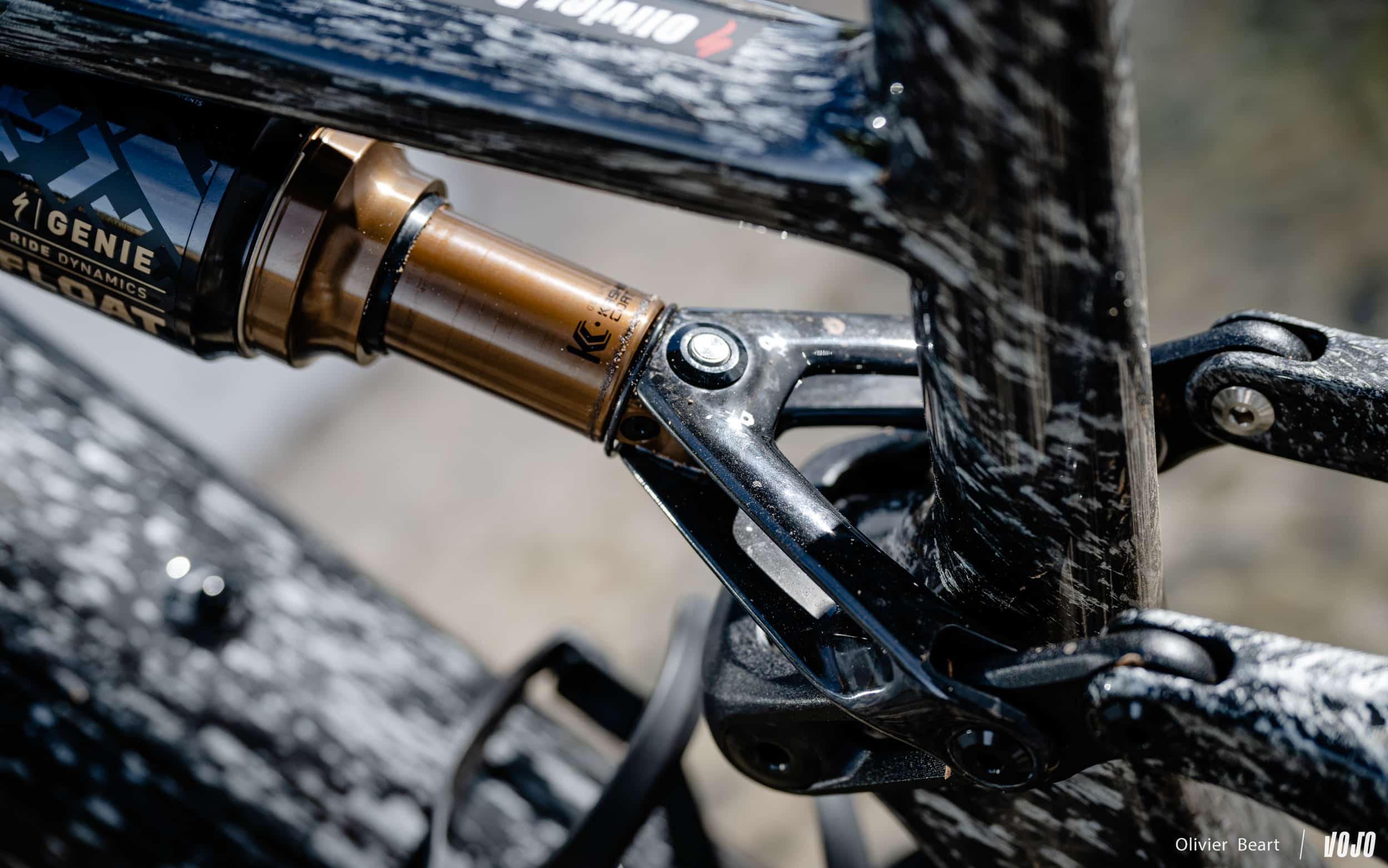 Aan de achterkant zien we nog steeds een Fox Genie-demper, die ontwikkeld werd door Specialized, maar in een herziene versie voor de Levo R met zijn kortere veerweg. Ter herinnering: deze demper verscheen voor het eerst op de Specialized Stumpjumper en is ook te vinden op de Levo. Het onderscheidende kenmerk zijn de dubbele luchtkamers, ontworpen door Specialized om de voordelen van zowel een spiraalveer als een luchtvering te bieden.