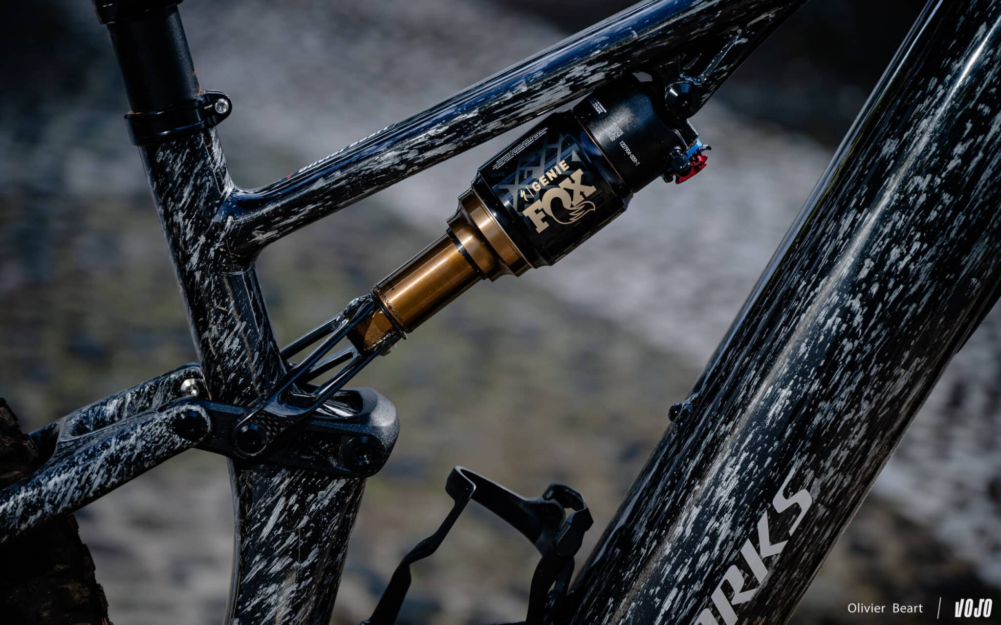 Aan de achterkant zien we nog steeds een Fox Genie-demper, die ontwikkeld werd door Specialized, maar in een herziene versie voor de Levo R met zijn kortere veerweg. Ter herinnering: deze demper verscheen voor het eerst op de Specialized Stumpjumper en is ook te vinden op de Levo. Het onderscheidende kenmerk zijn de dubbele luchtkamers, ontworpen door Specialized om de voordelen van zowel een spiraalveer als een luchtvering te bieden.