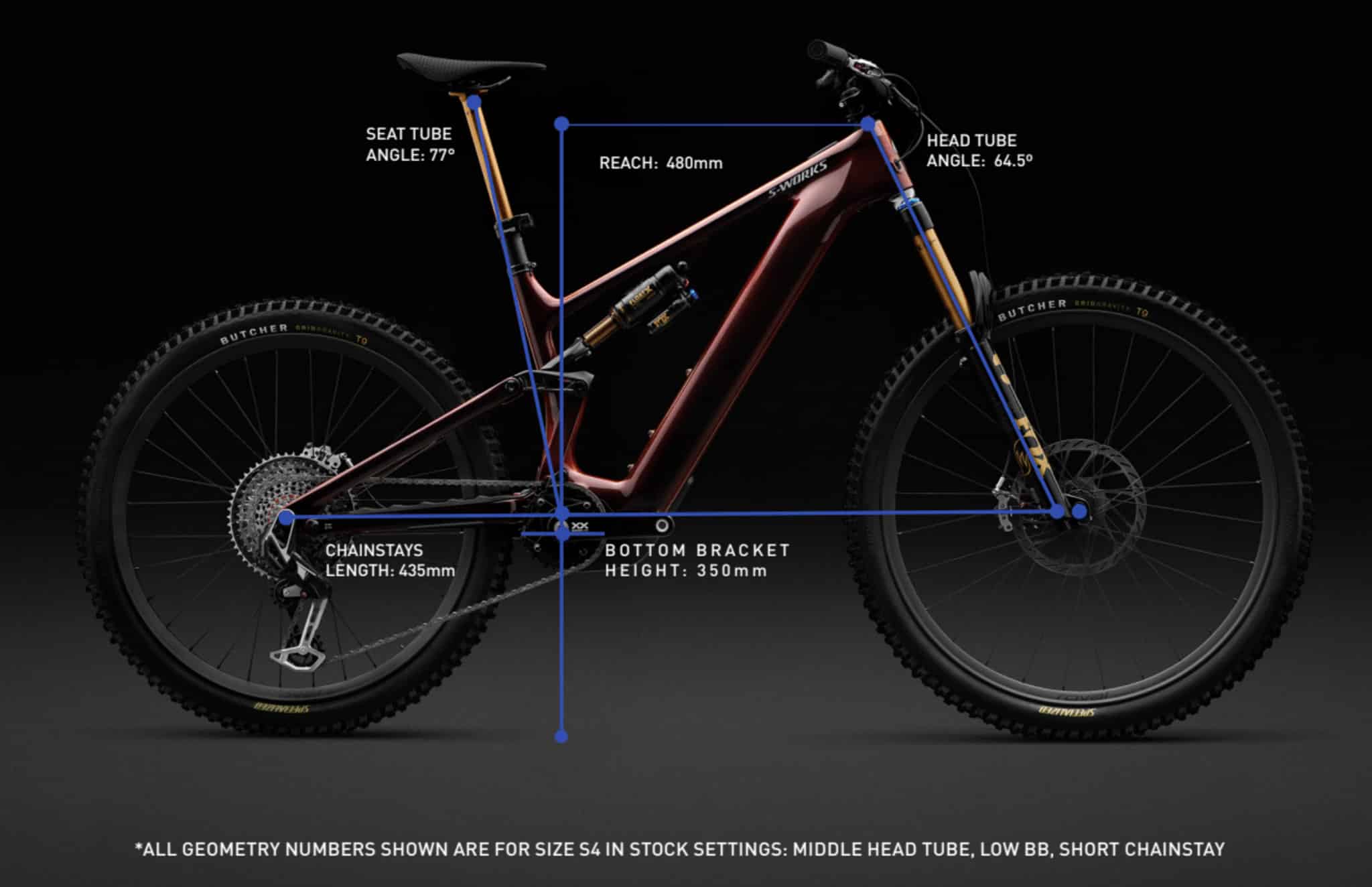 De geometrie is logischerwijs ook anders dan bij de Levo, maar uiteindelijk vrij minimaal (Levo R in de eerste afbeelding, Levo in de tweede): een balhoofdhoek van 65° (+0,5°) en een hoger bottom bracket (+11 mm) zijn de belangrijkste verschillen, maar verder zijn ze erg vergelijkbaar of zelfs identiek (reach, lengte van de liggende achtervork, zitbuishoek).