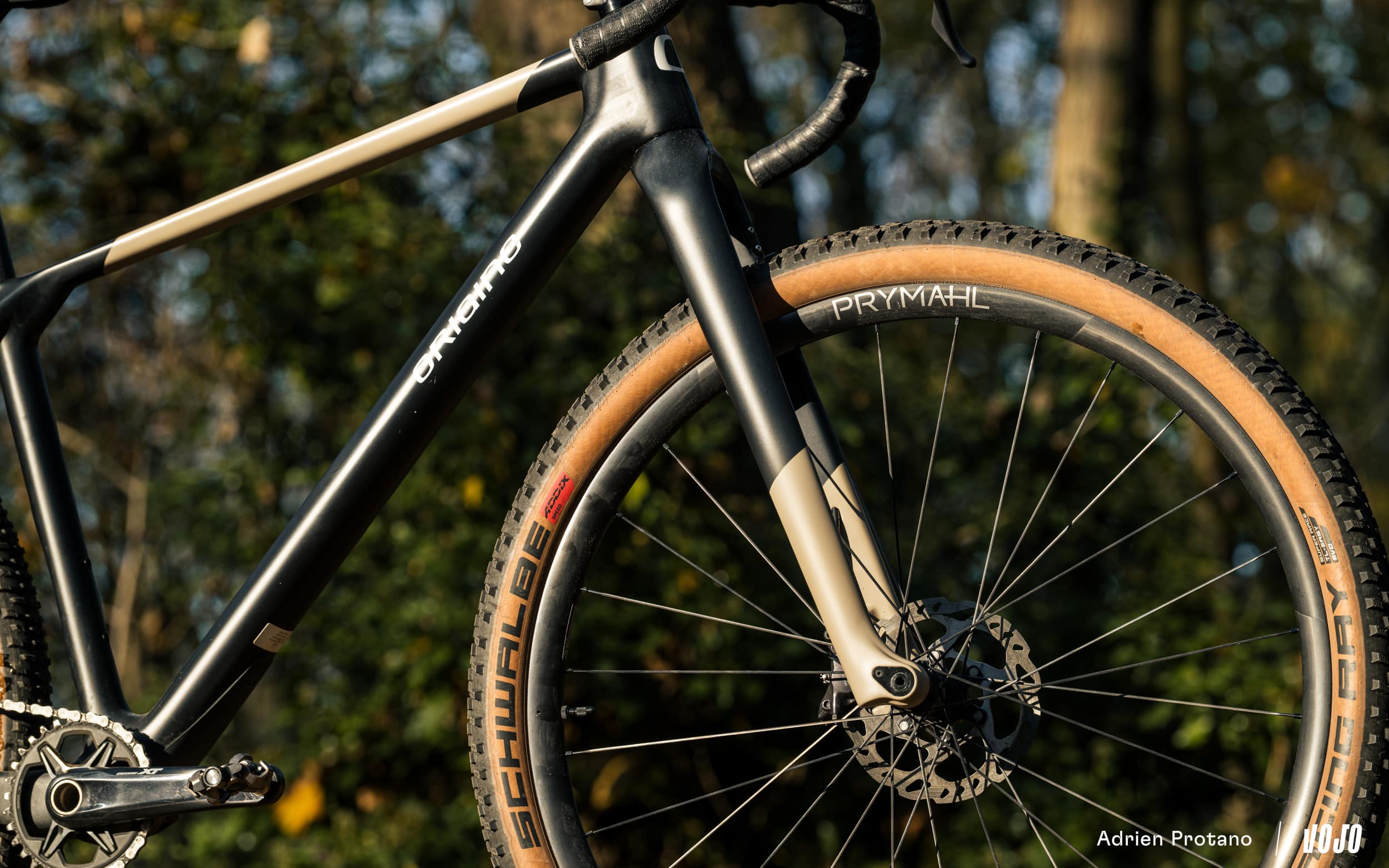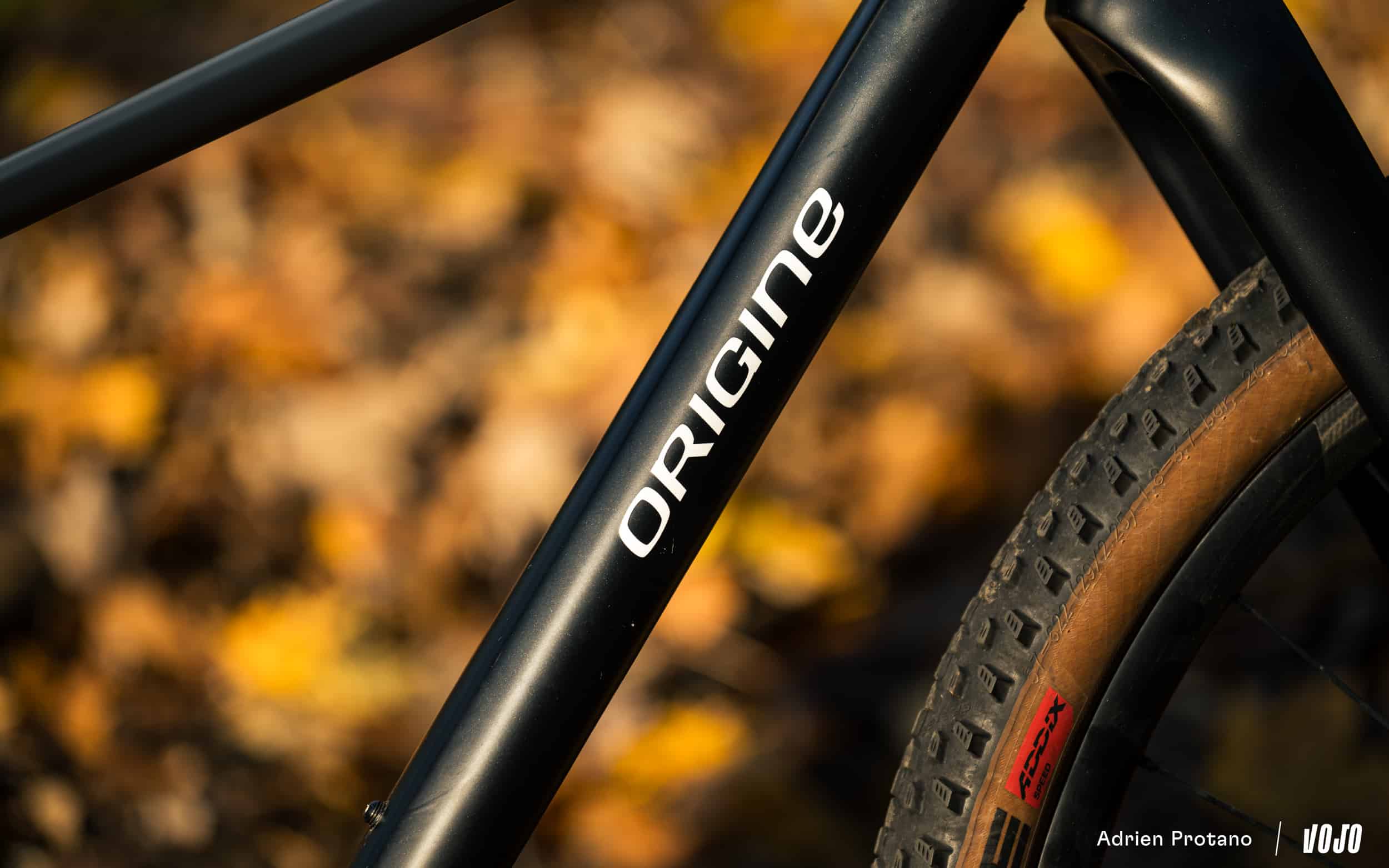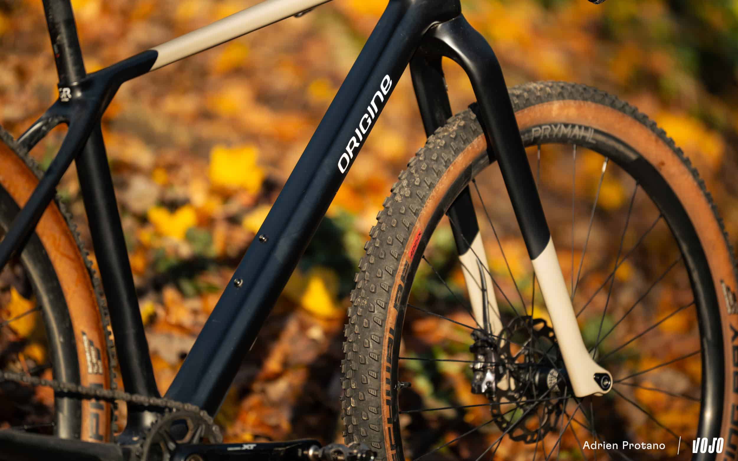 Origine heeft een nieuwe, speciaal ontworpen vaste voorvork ontwikkeld die de geometrische balans van de fiets behoudt in vergelijking met een traditionele telescopische voorvork. Het ontwerp behoudt dus de balhoofdhoek en het stuurgevoel, terwijl de carbon constructie een delicate balans biedt: voldoende stijf om nauwkeurig te sturen, maar ook voldoende flexibel om de trillingen van het terrein te dempen, ondanks het ontbreken van een vering. Deze weloverwogen aanpak voorkomt dat de fiets een star geheel wordt en behoudt het comfort op de trail.