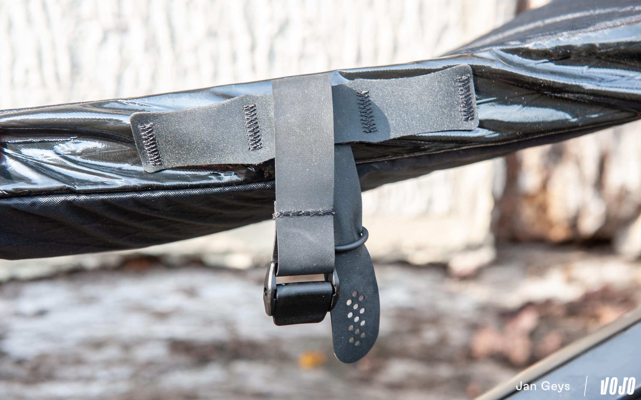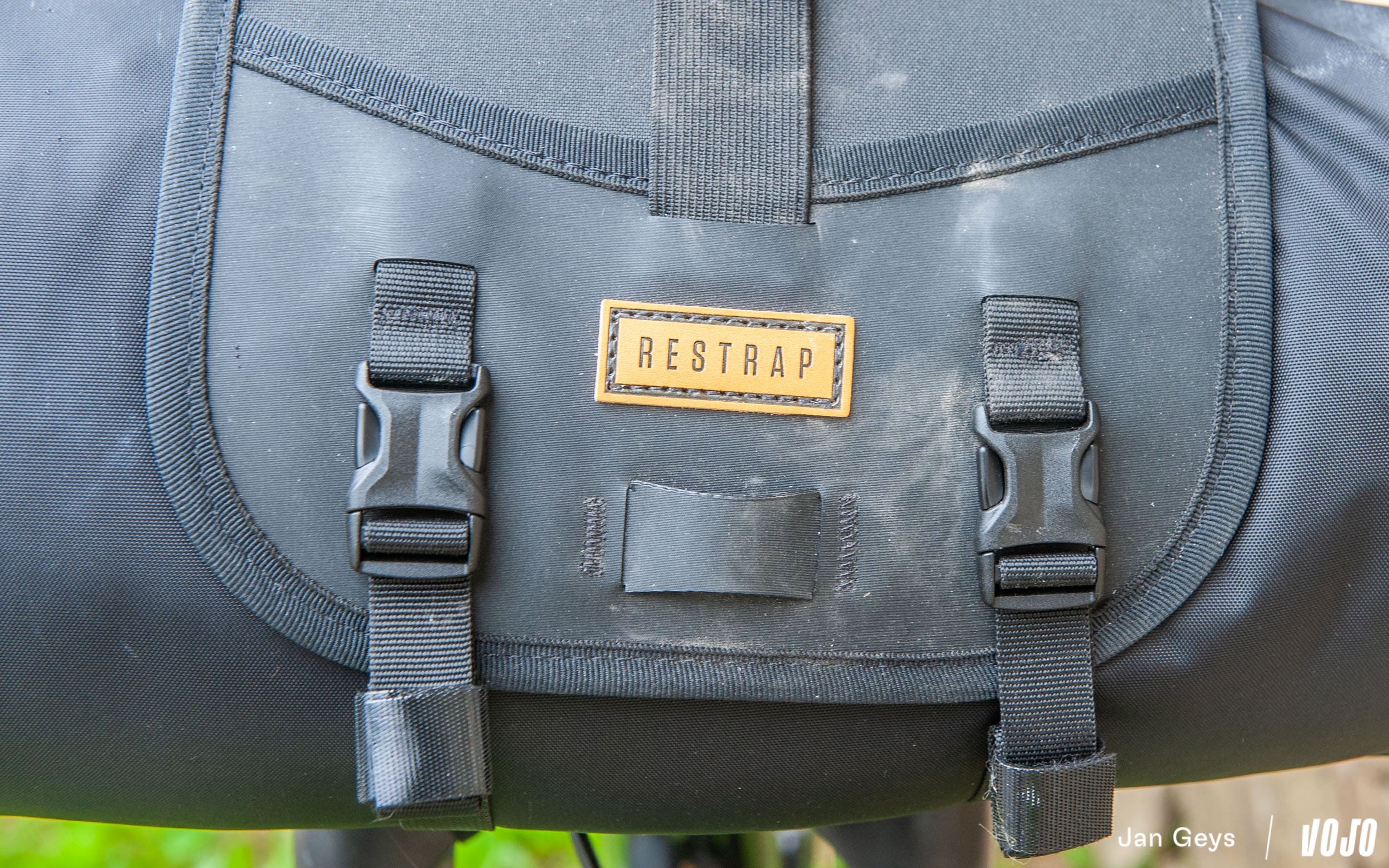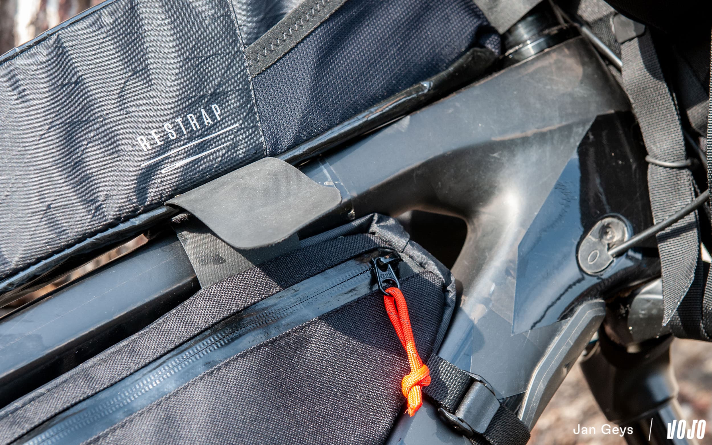 De verschillende klemsystemen om de riemen aan te spannen, mogen we wel de opvallendste pluspunten noemen van de Restrap-bikepackingtassen. Of ze nu breed of smal zijn, ze vergemakkelijkten het aanspannen van de riemen aanzienlijk. Waar geen klemsysteem gebruikt wordt, doet Restrap veelal een beroep op brede klittenbanden die een duurzaam gevoel uitstralen.