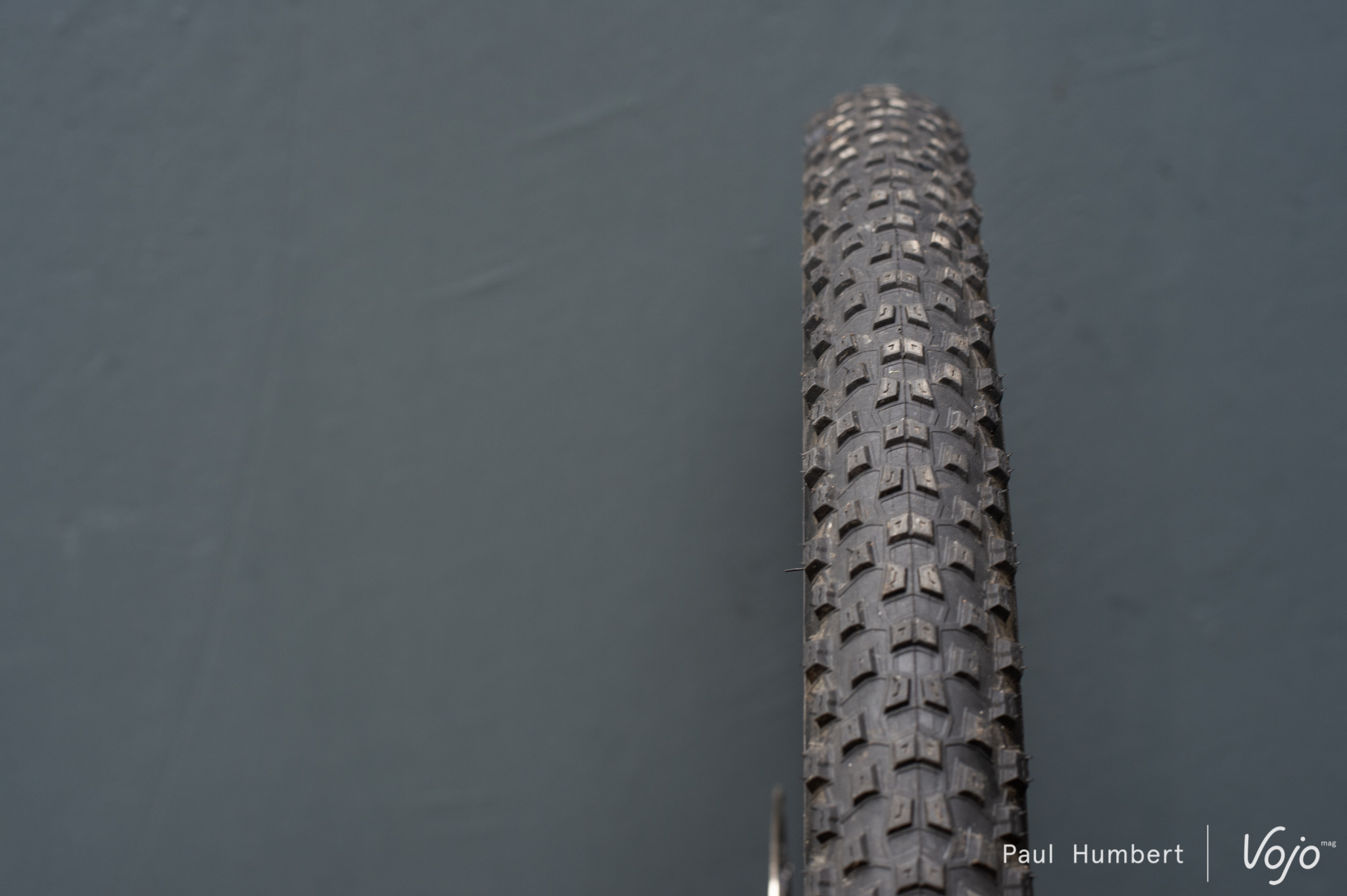 Het rendement van de achterband is correct bij een druk van 1,3 bar en zeer goed bij 1,5 bar. Je geniet volop van het zo goed als ononderbroken loopvlak, zonder dat dit een nadeel is voor de grip op technische beklimmingen. Het soepele karkas vervormt goed om de obstakels op te slokken en het rubbercompound biedt een bevredigende grip. Daar staat tegenover dat we in los terrein of in afdalingen met een harde en natte ondergrond heel wat minder tevreden waren van het loopvlak. Dan zorgen de dicht bij elkaar geplaatste noppen voor onvoldoende grip om de band daadwerkelijk te doen afremmen (zeker wanneer je het gewicht op de pedalen zet en minder op het zadel en achterwiel). Het achterwiel glijdt dan ook vaak weg.
