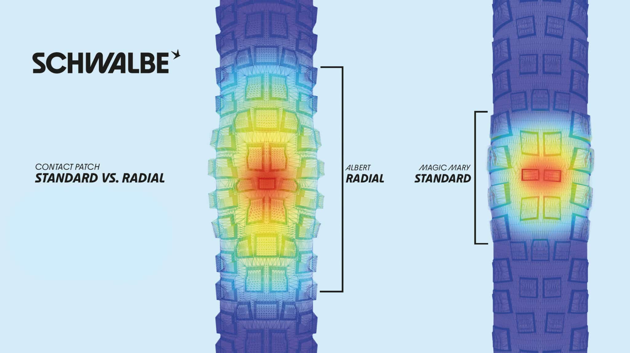 Dankzij de (bijna) radiale constructie van het karkas is de band flexibeler en vervormt hij beter bij oneffenheden: Schwalbe claimt 30% meer contactoppervlak bij dezelfde druk (1,5 bar) voor de radiaalband vergeleken met de klassieke band, en nog altijd 10% meer als we de druk met 0,5 bar verhogen. Hij zou ook beter moeten dempen, wat resulteert in een band die meer grip en controle biedt.