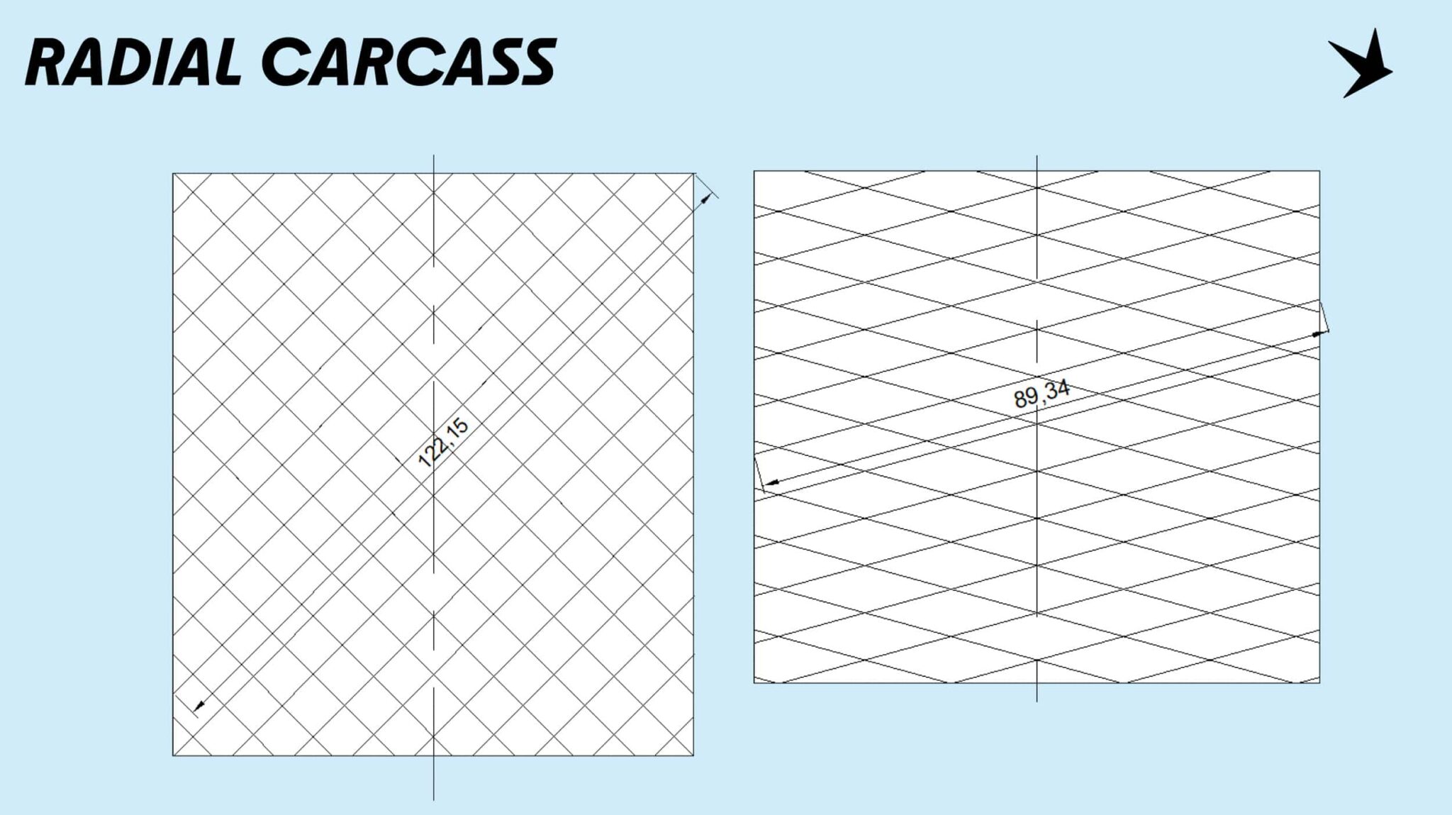 Bij een fietsband zijn de draden waaruit het karkas bestaat onder een hoek van ongeveer 45° met de rolrichting van de band opgesteld en kruisen ze elkaar onder een hoek van 90°. We noemen dit om vrij voor de hand liggende redenen een ‘diagonaal’ karkas. Schwalbe heeft de plaatsing van deze draden volledig herzien, zodat ze veel loodrechter op de rolrichting staan (rechtsboven, klassieke band aan de linkerkant). Het merk houdt de precieze hoek geheim, aangezien dit de kern van het hele systeem vormt.