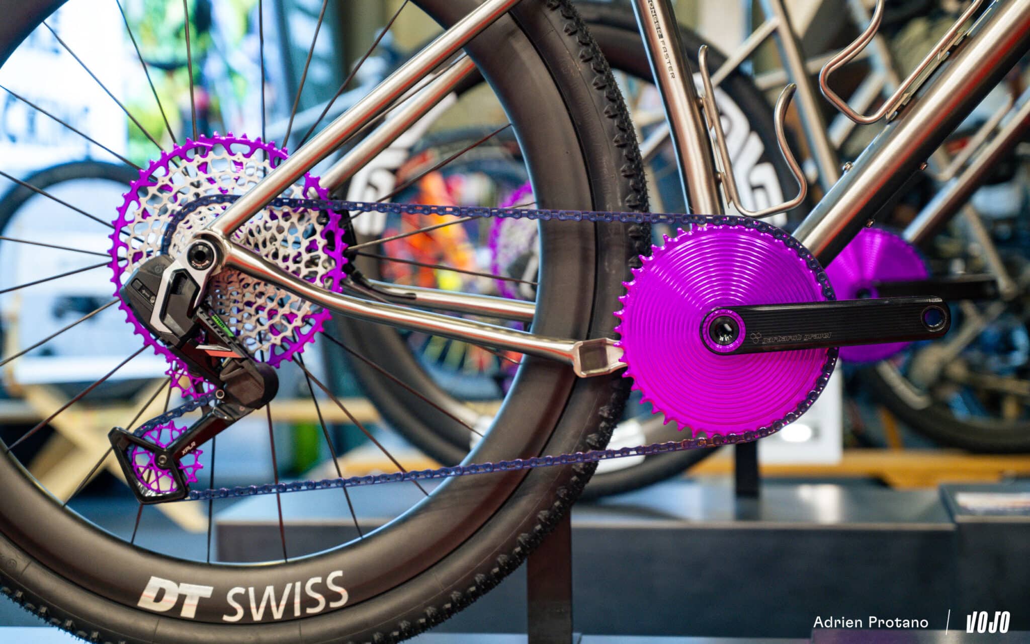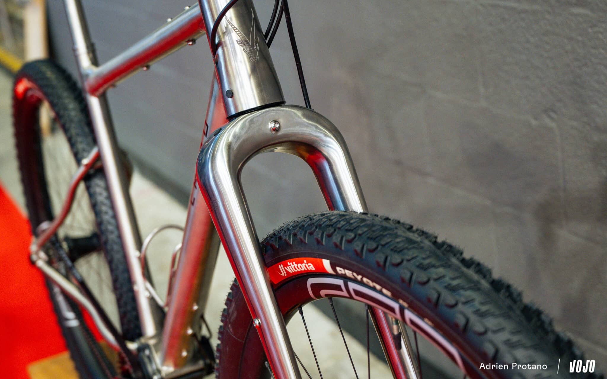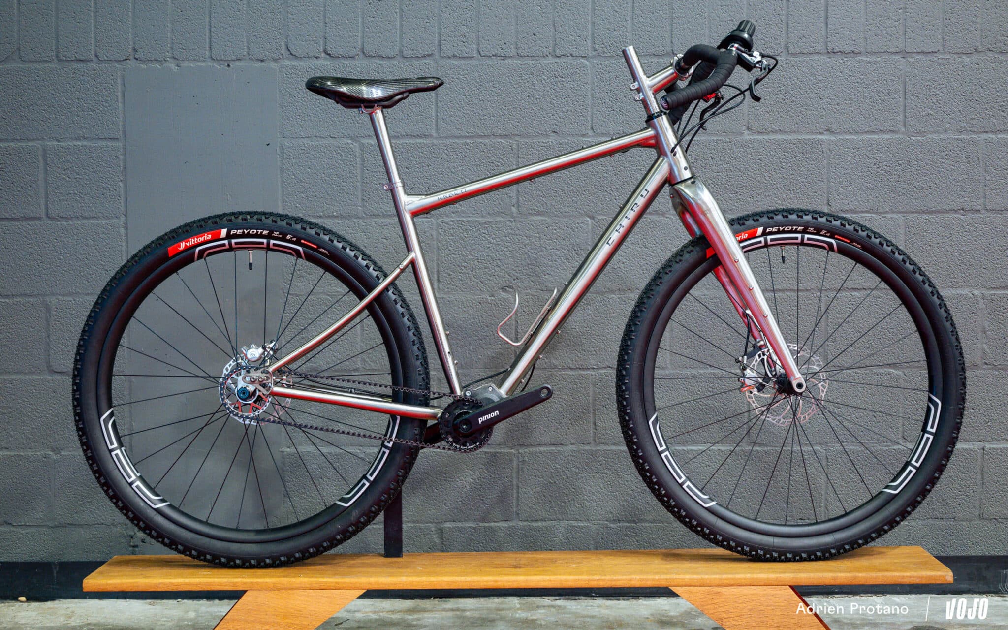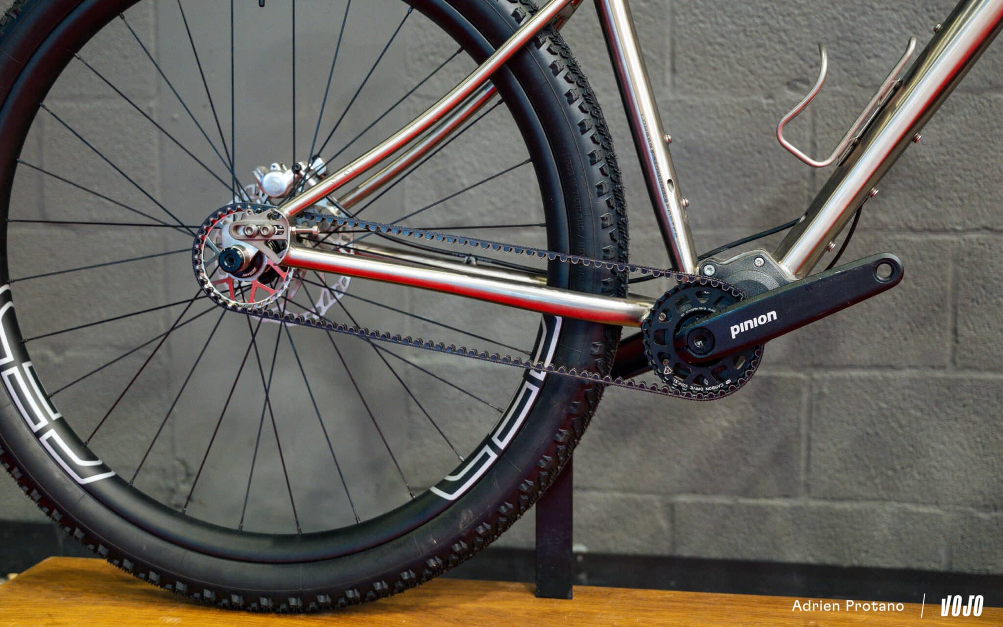 Chiru had ook een Kegeti in zijn bagage, een titanium gravelbike met de capaciteiten van een mountainbike. Opvallend is de ruimte voor banden tot 2.4 inch en de Pinion-versnellingsbak met riemaandrijving.