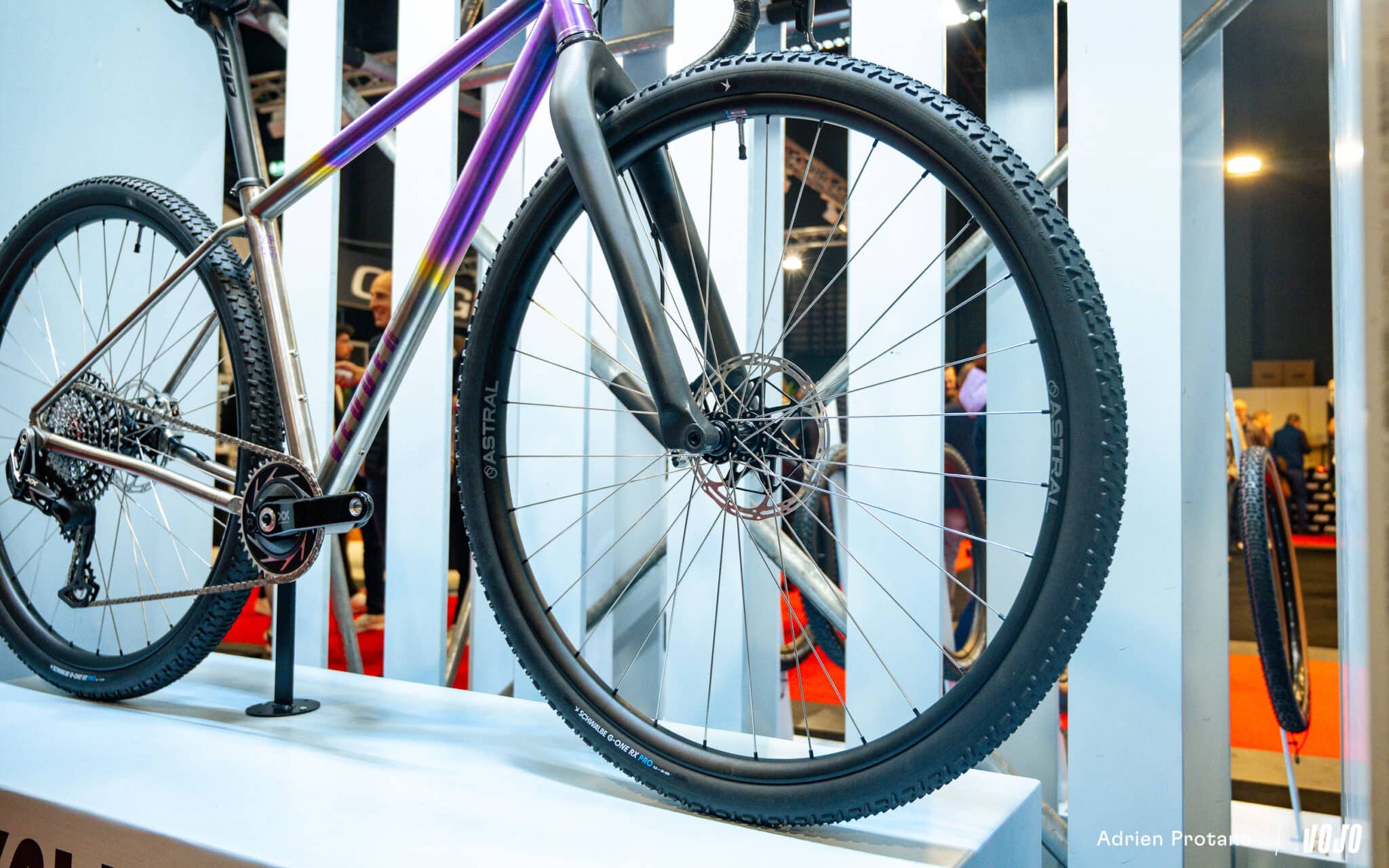 Op de stand kon je ook wielen zien die gemonteerd waren onder aantrekkelijke carbon- en titaniumfietsen van een nieuw Nederlands merk genaamd Epitome. Hier hun titanium gravelbike met 3D-geprinte onderdelen.
