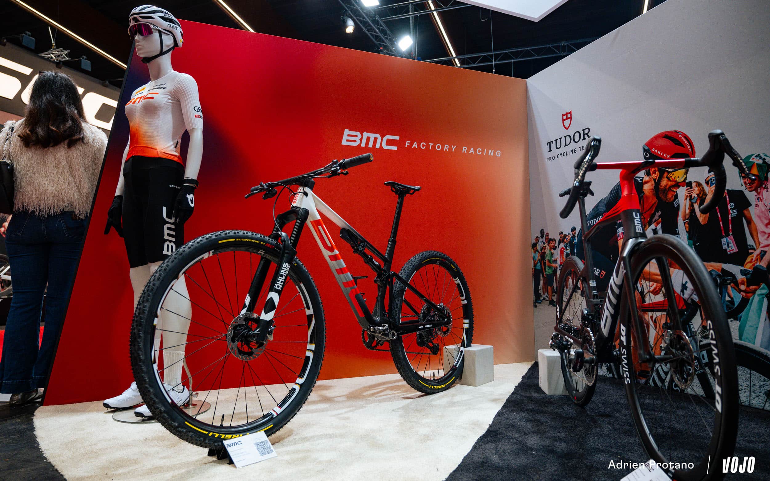Het was de fiets van Loana Lecomte die hier werd tentoongesteld, met de onderdelen die BMC Factory Racing in de wereldbeker gebruikt.