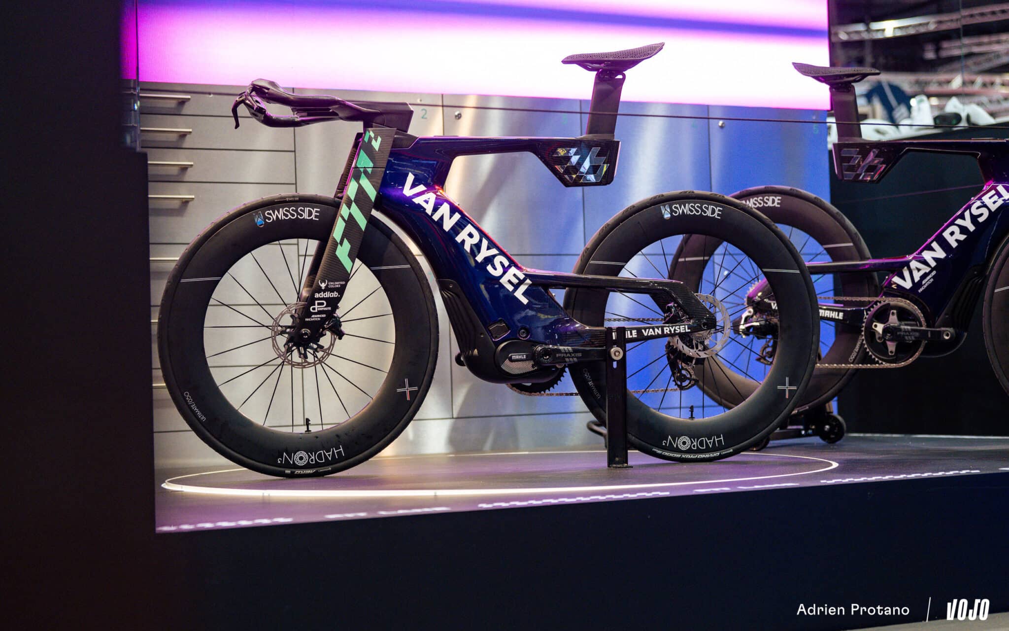 Hoewel dit duidelijk buiten het domein van Vojo valt, konden we het niet laten om jullie de conceptfiets van Van Rysel te laten zien, uitgerust met een motor. We hebben gehoord dat deze snelheden tot wel 150 km/u kan bereiken … of preciezer gezegd, dat de M40-motor (een aangepaste versie van de standaardmotor) het vermogen simpelweg verdubbelt.